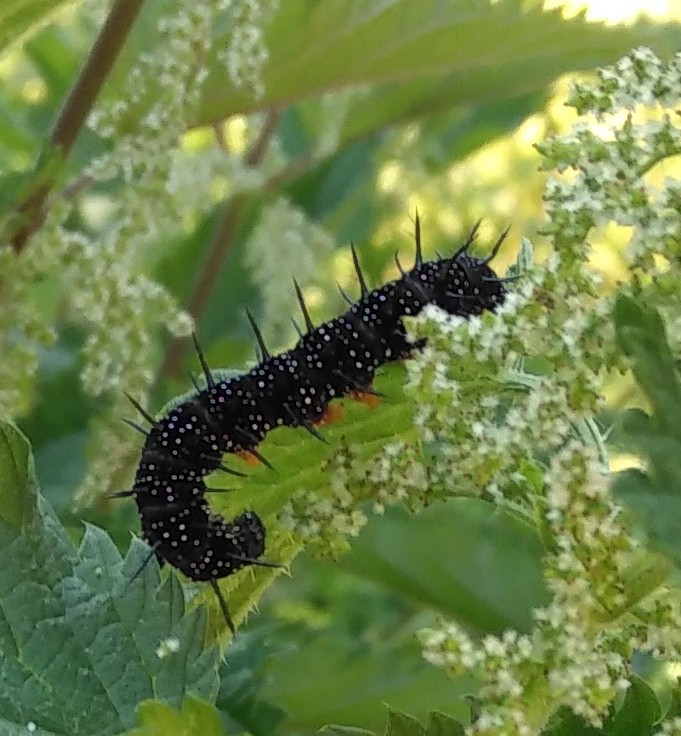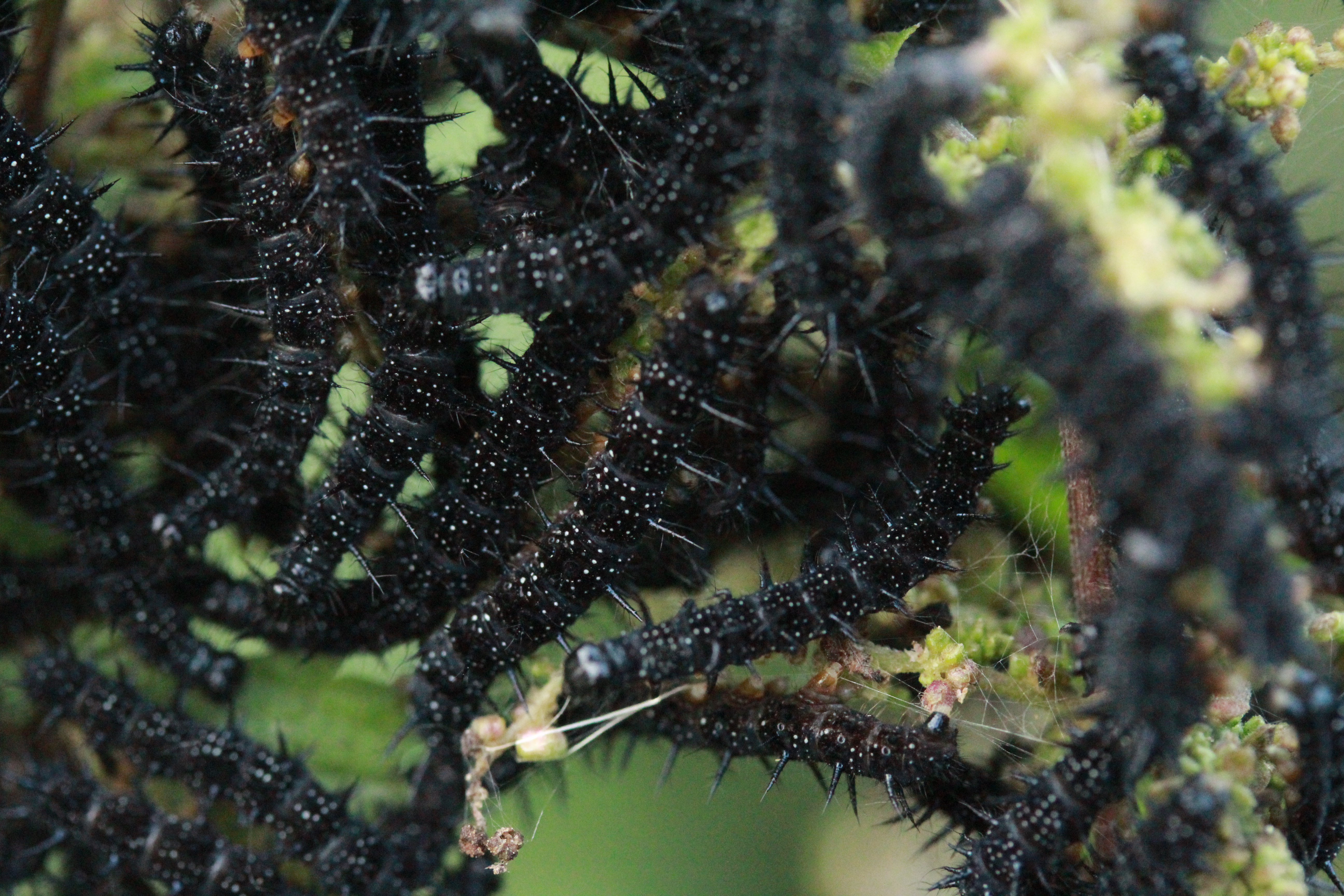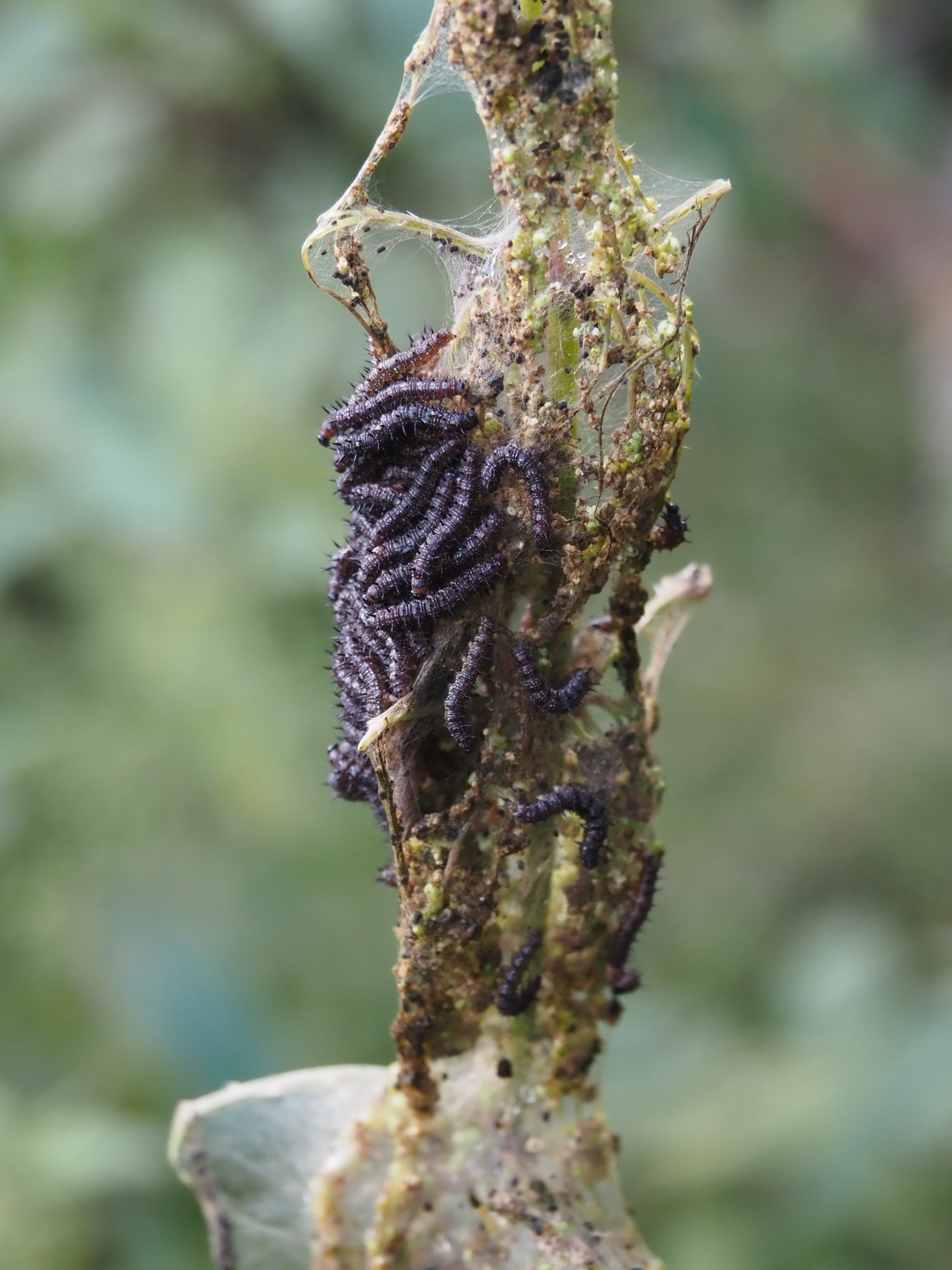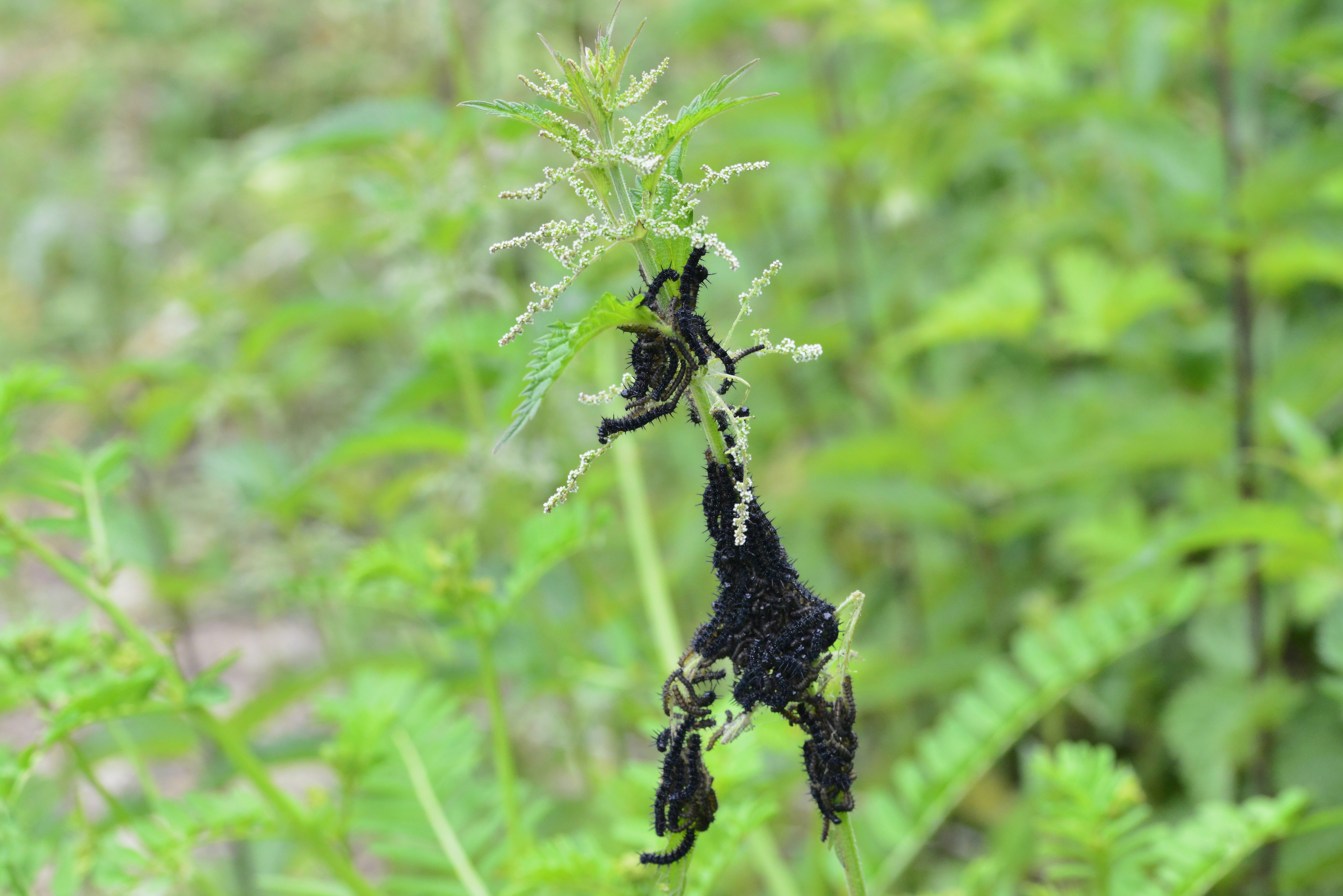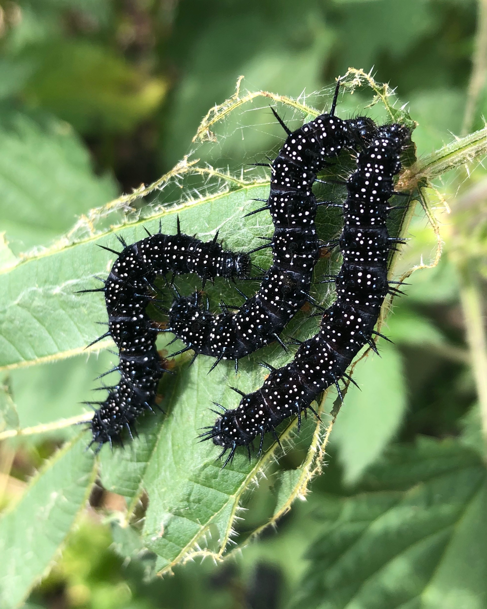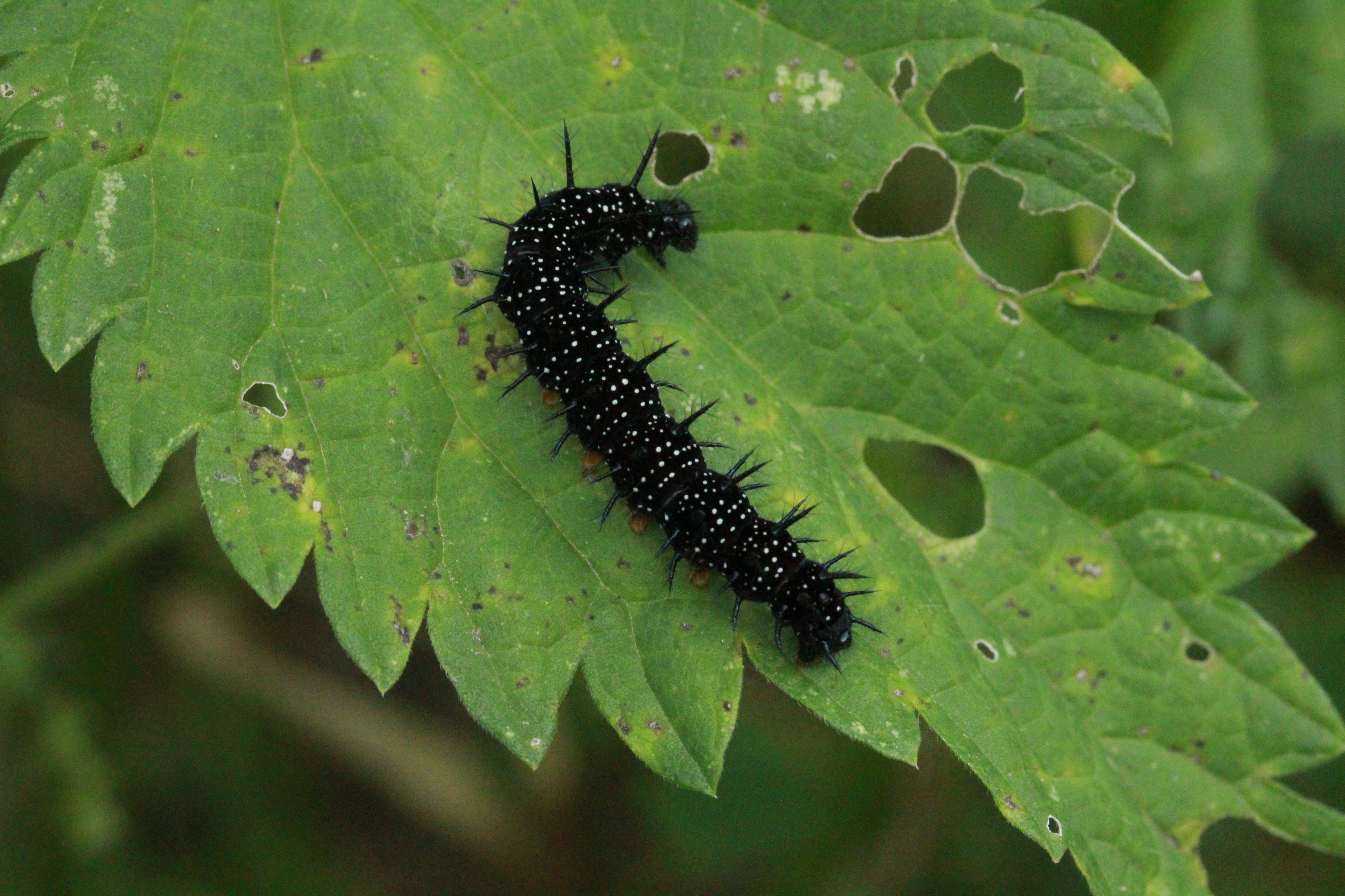 Tagpfauenauge (Aglais io (Linnaeus, 1758)), Larven in verschiedenen Entwicklungsstadien, bei Taubenheim, August 2016.