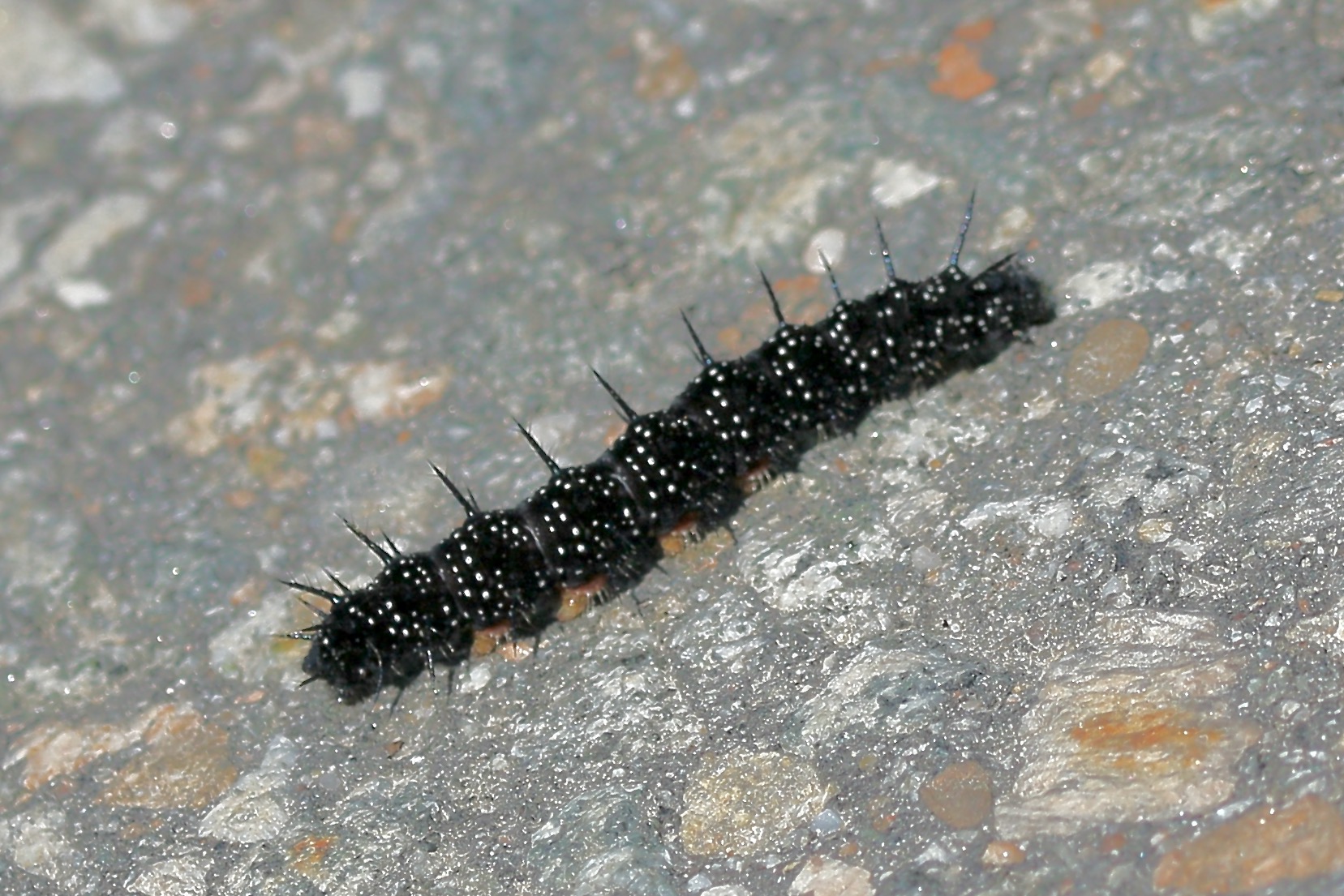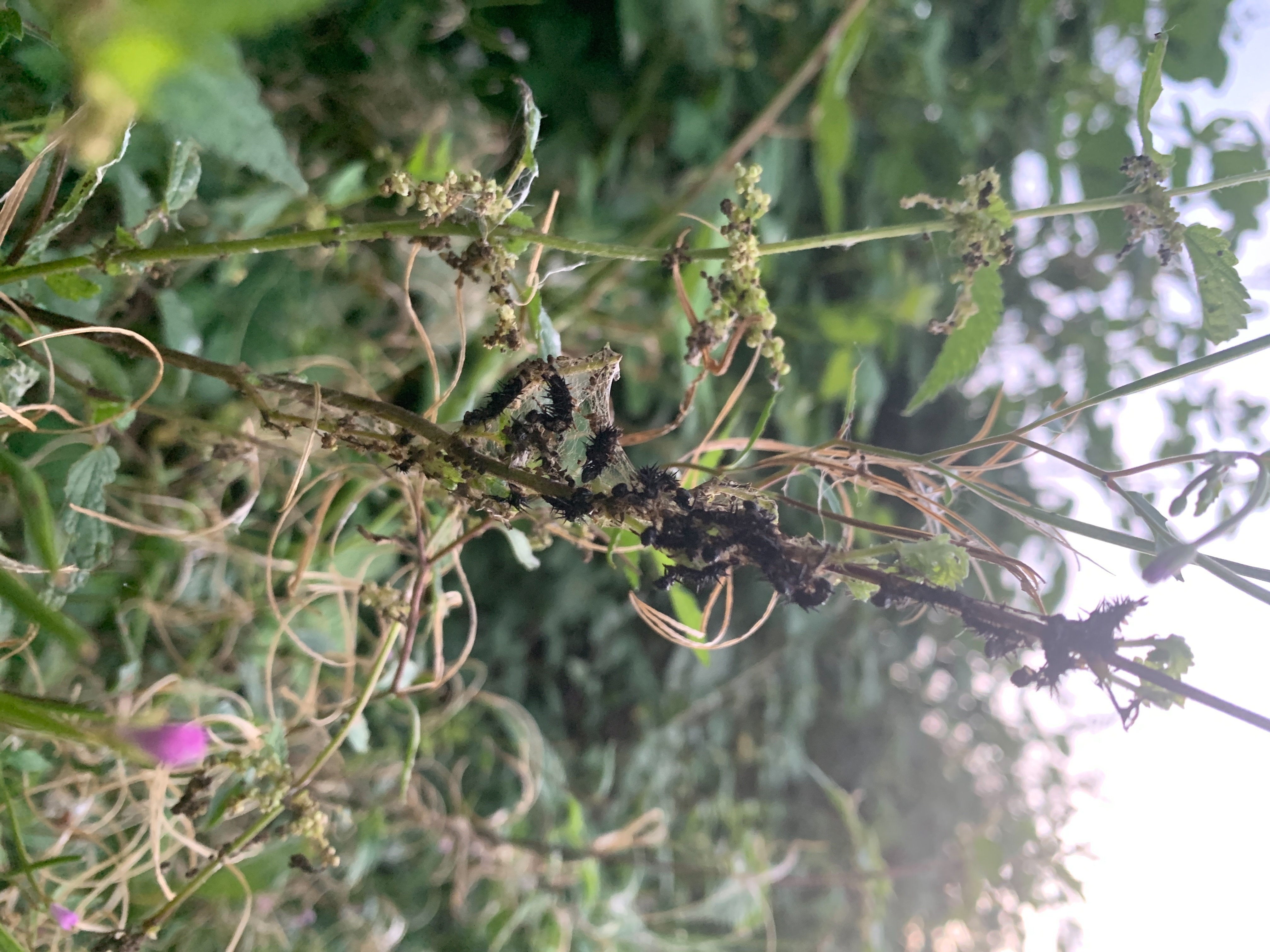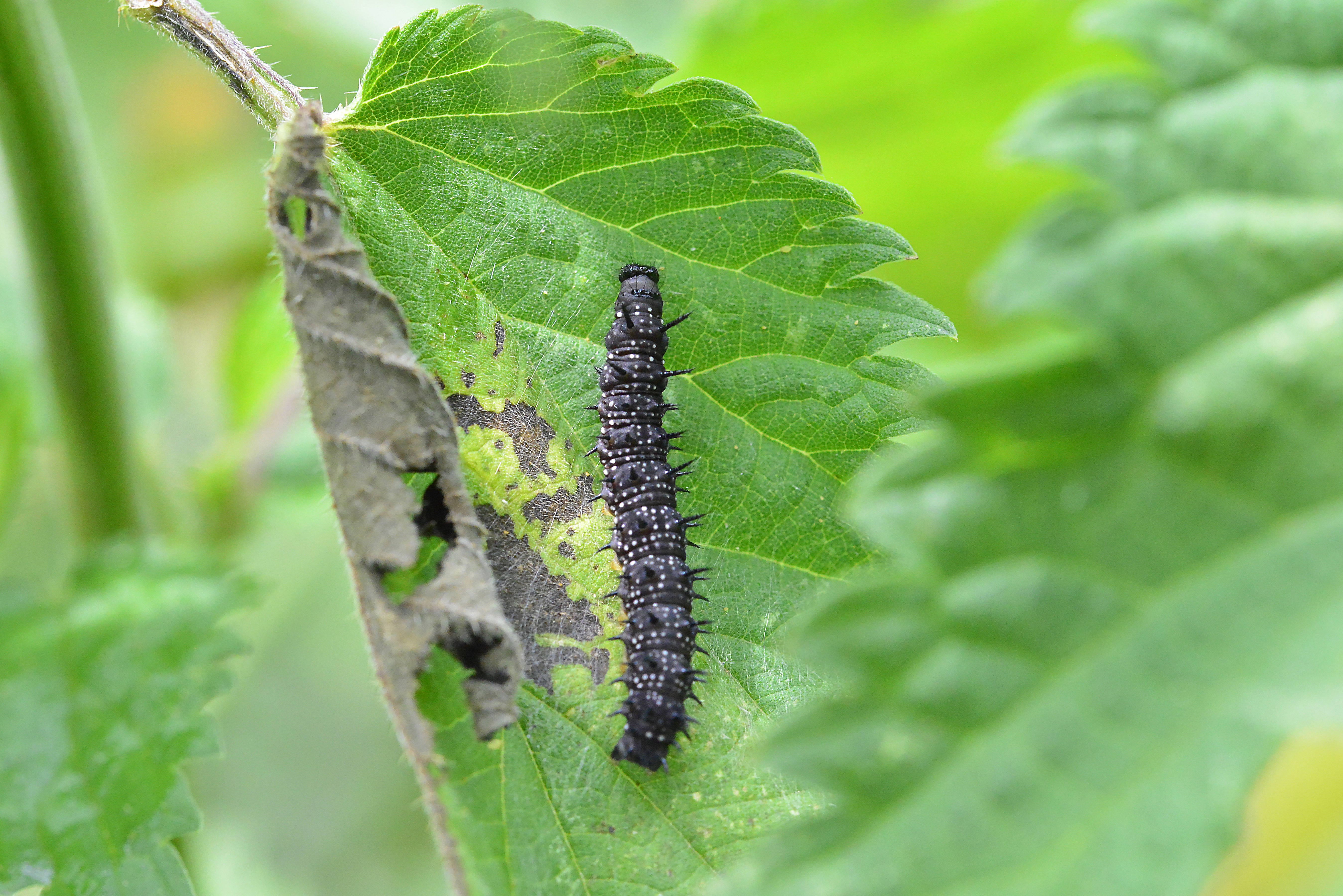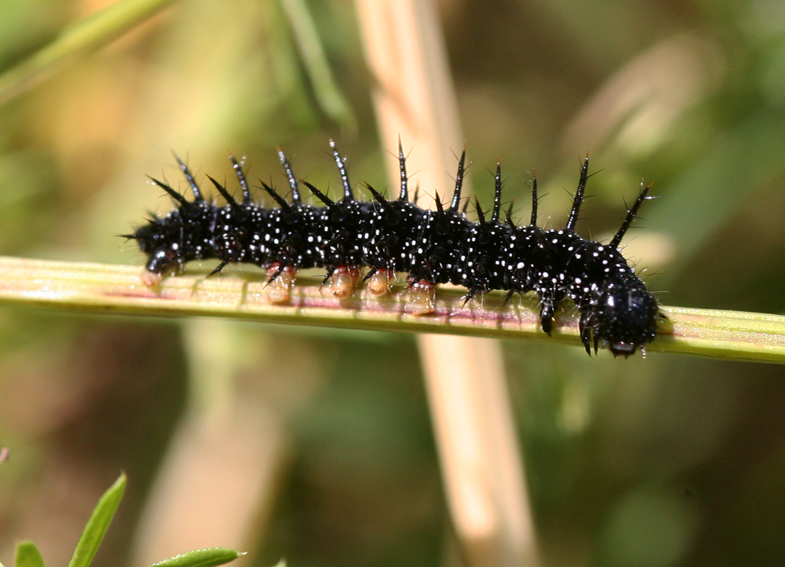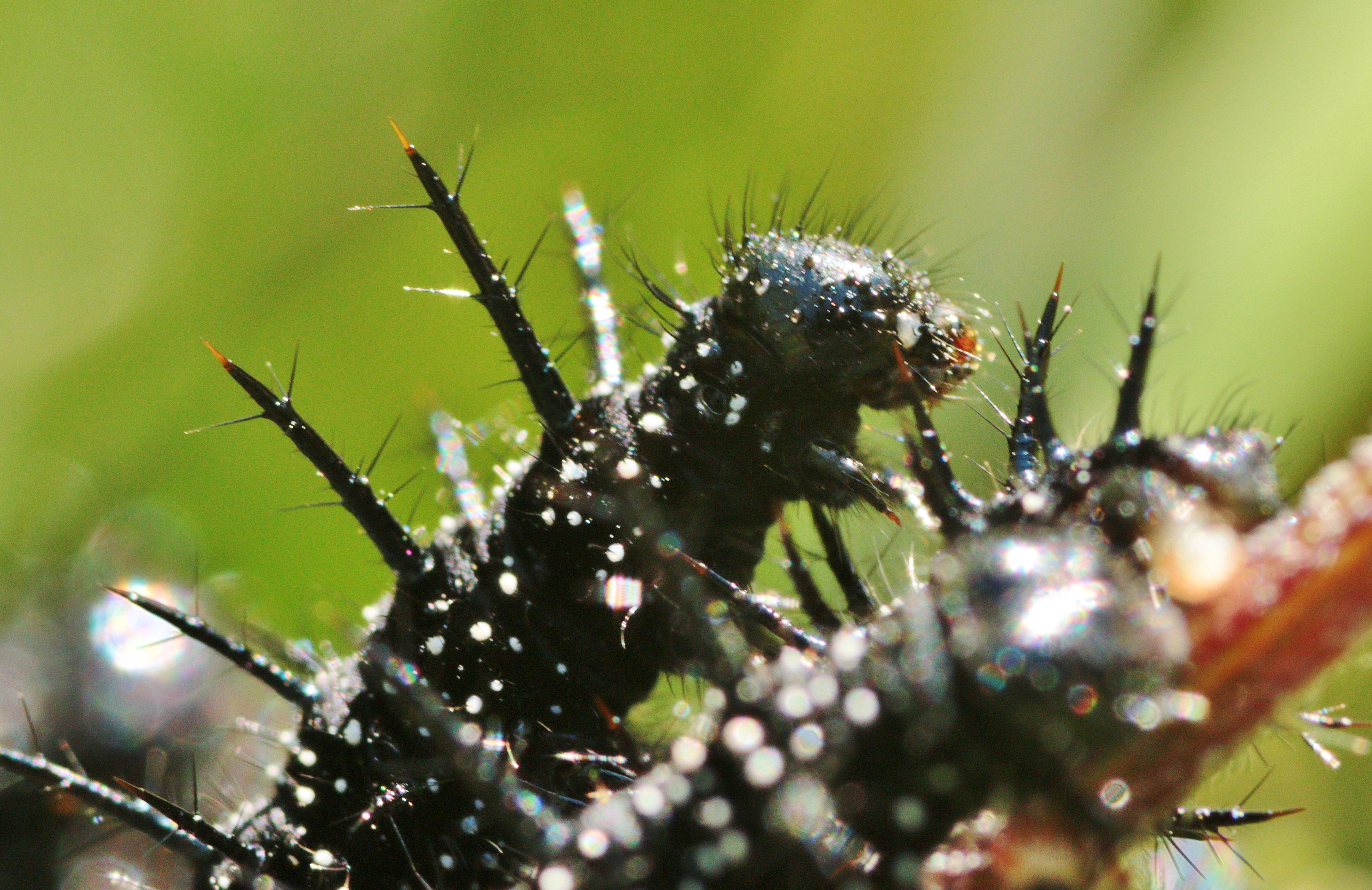 Tagpfauenauge (Aglais io (Linnaeus, 1758)), Larven in verschiedenen Entwicklungsstadien, bei Taubenheim, August 2016.