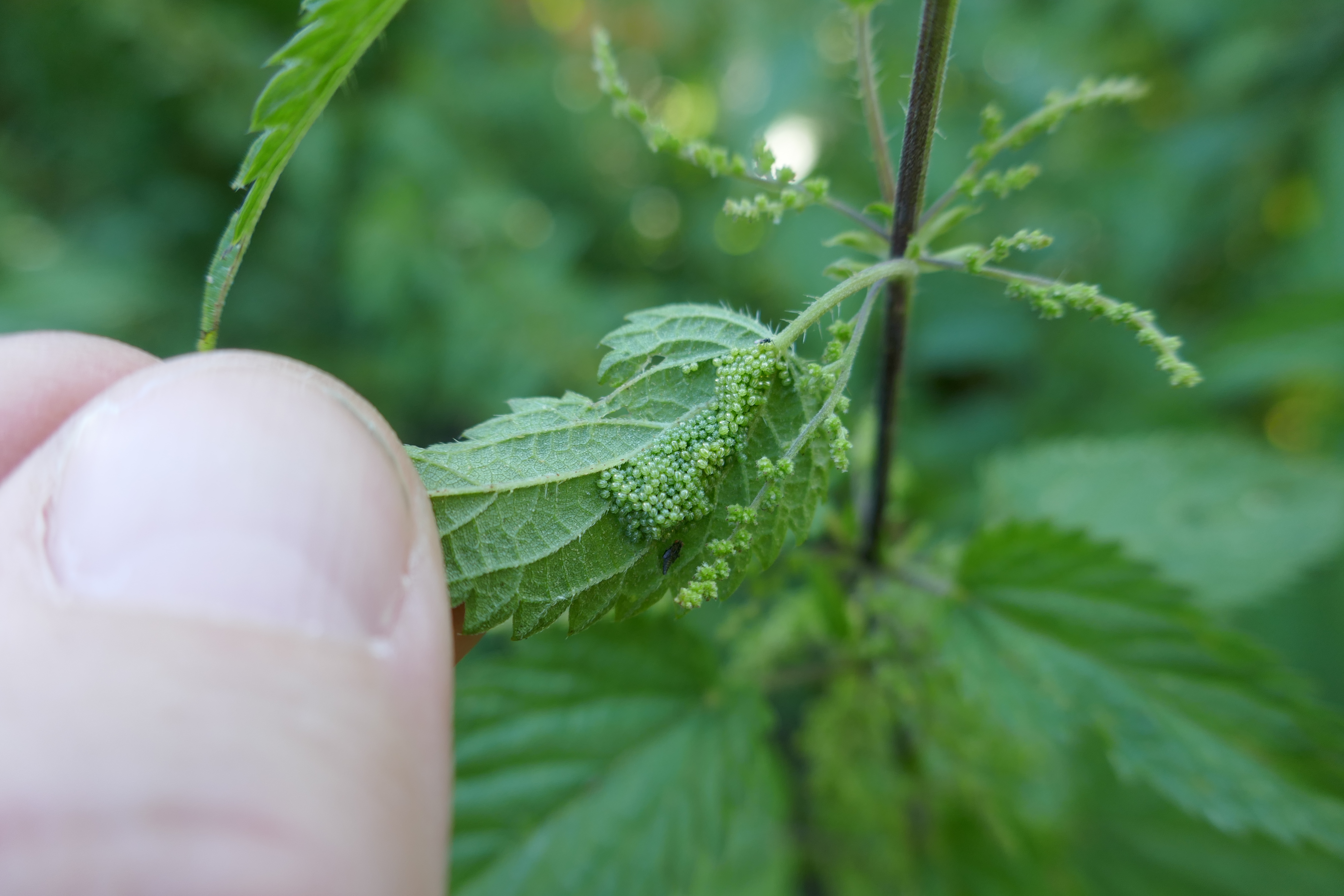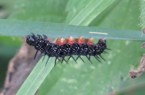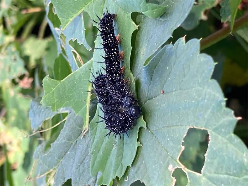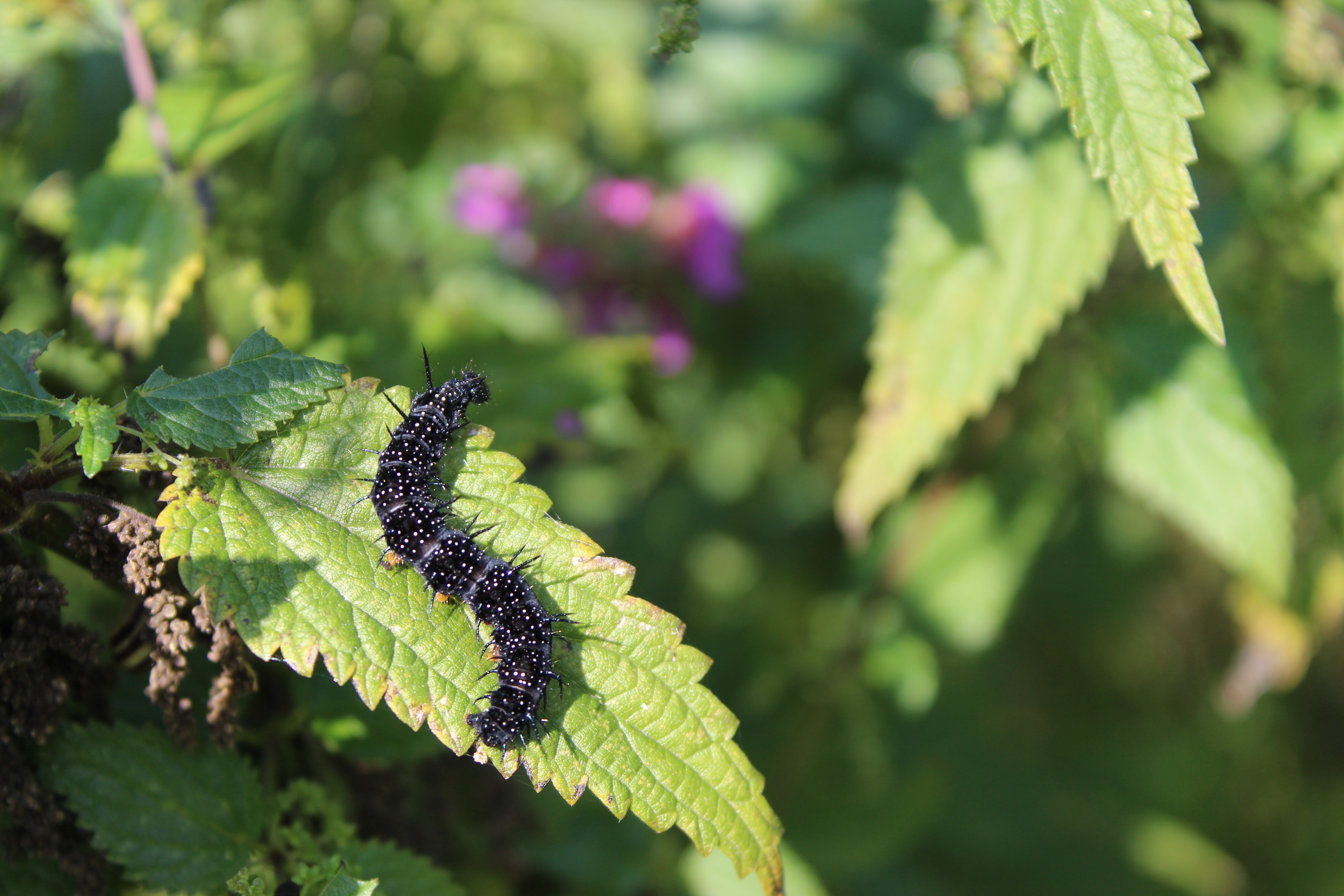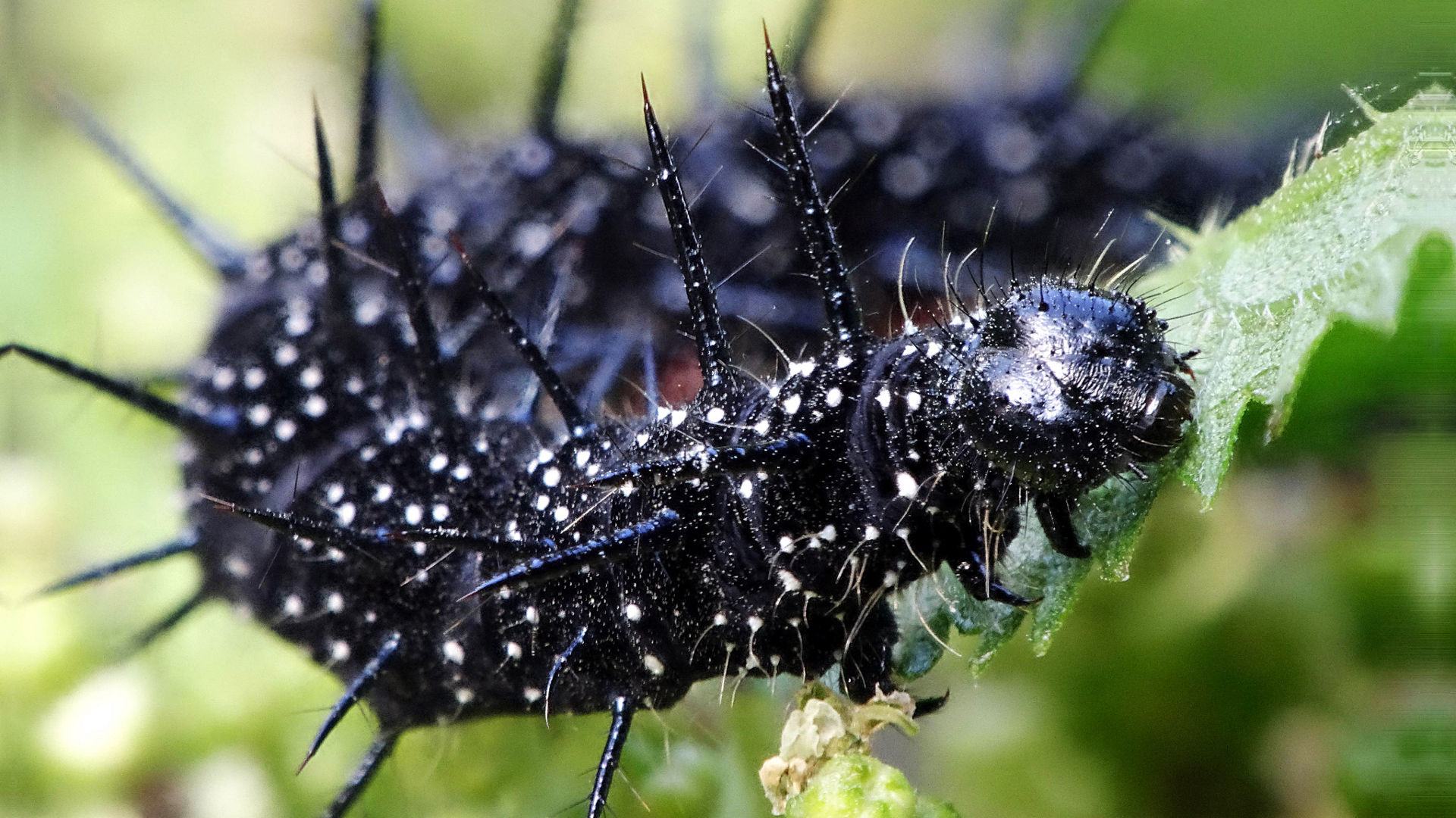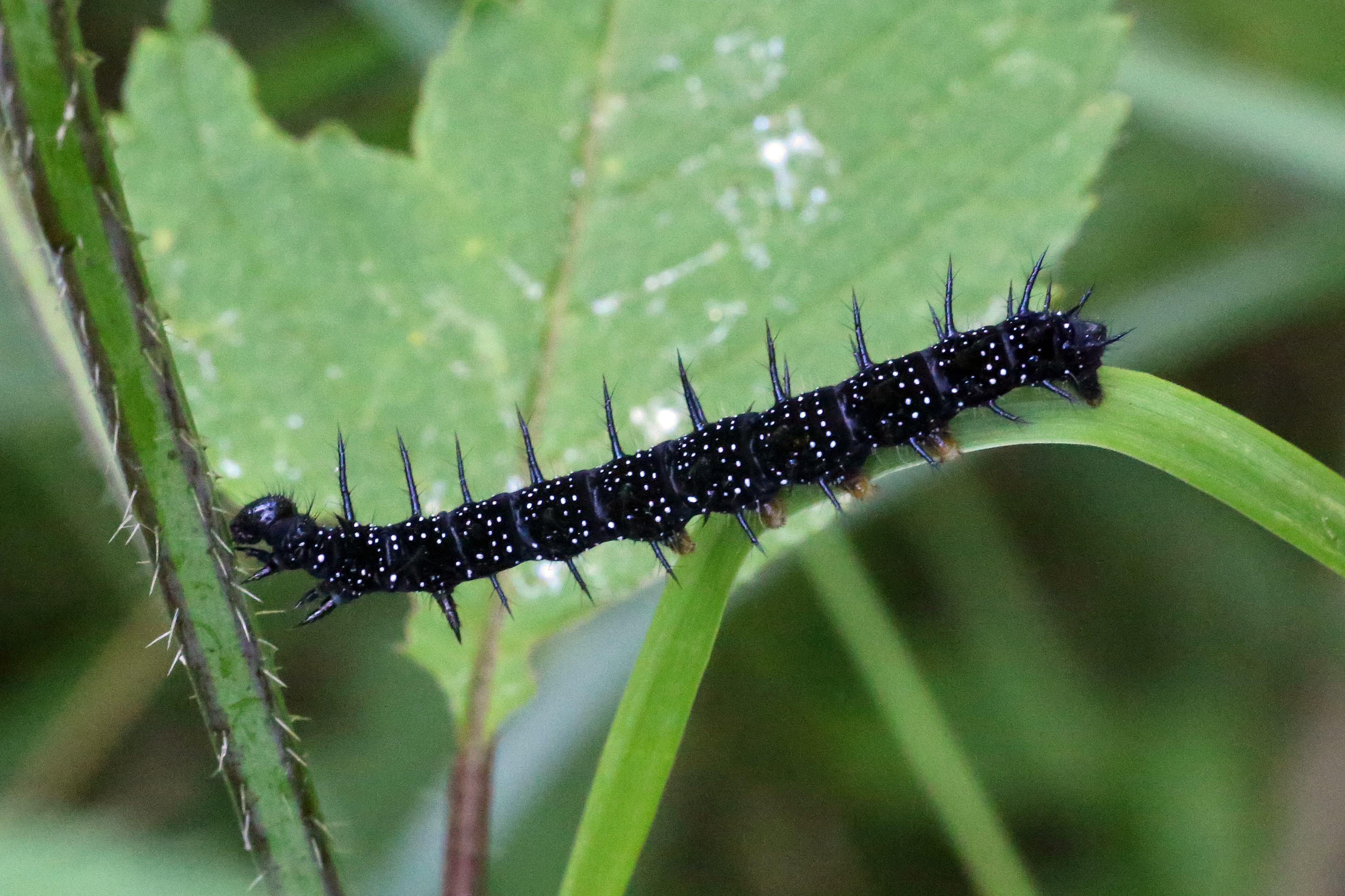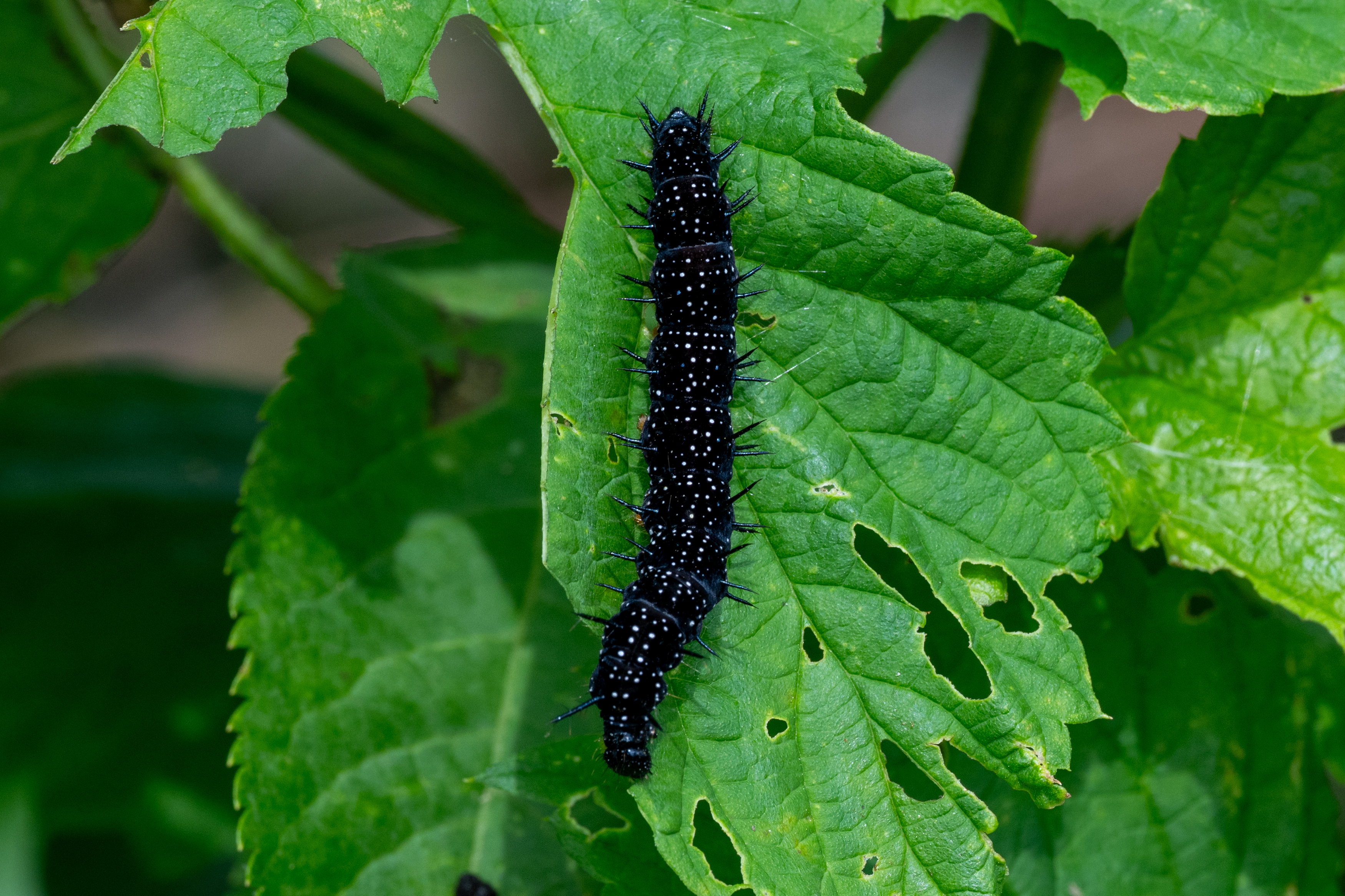 Tagpfauenauge (Aglais io (Linnaeus, 1758)), Larven in verschiedenen Entwicklungsstadien, bei Taubenheim, August 2016.
