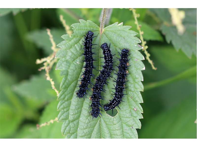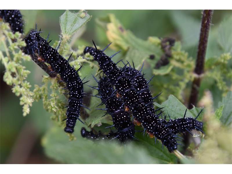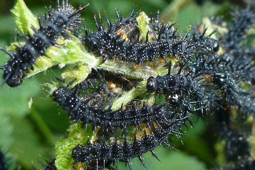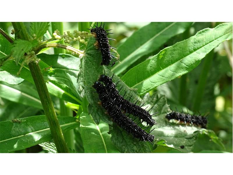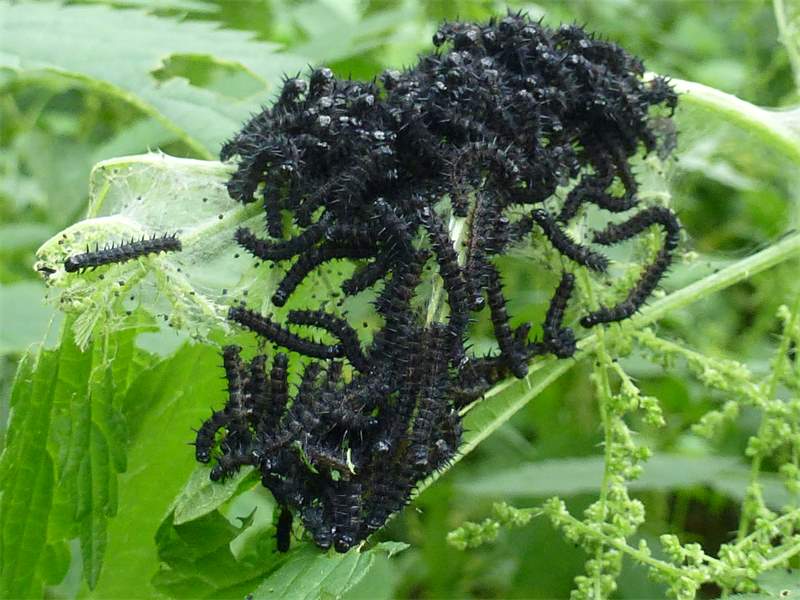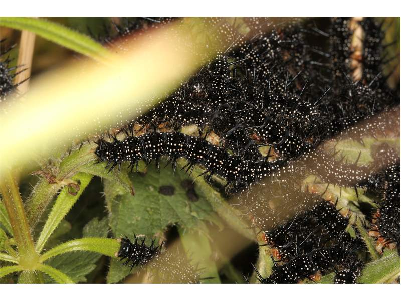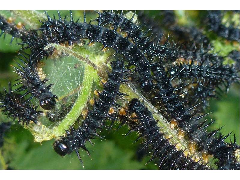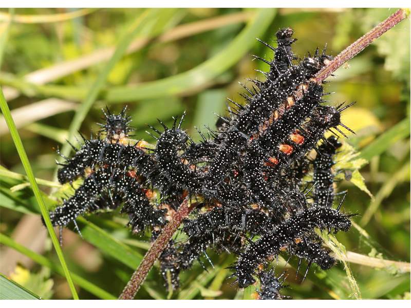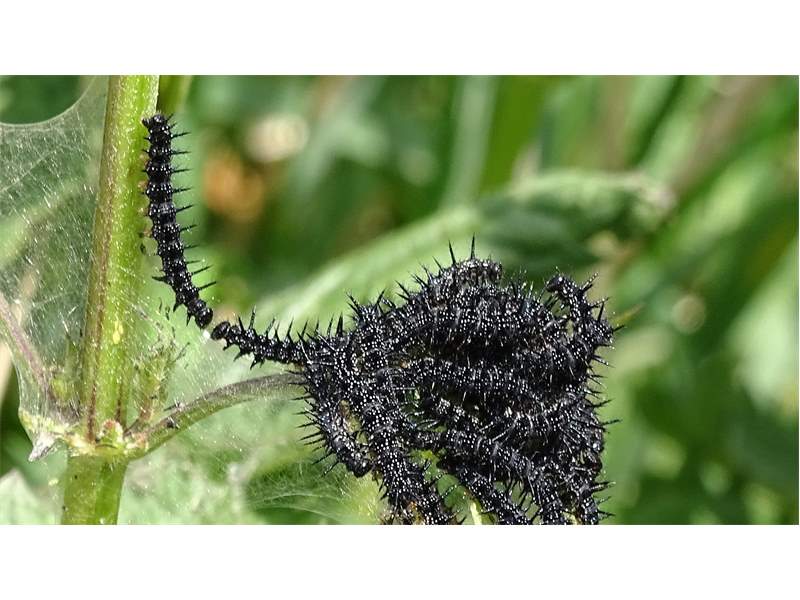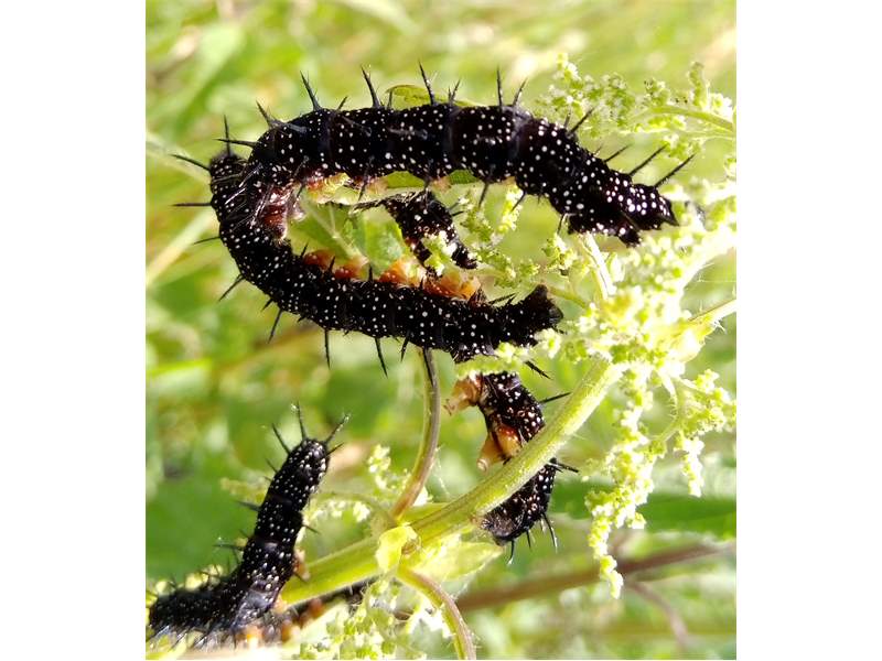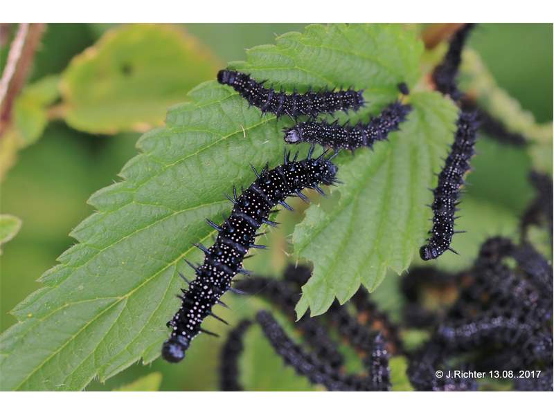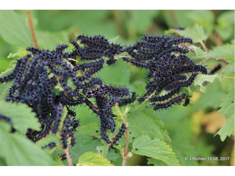 Tagpfauenauge (Aglais io (Linnaeus, 1758)), Larven in verschiedenen Entwicklungsstadien, bei Taubenheim, August 2016. (© Udo Lemke )( Bild vergrößern)