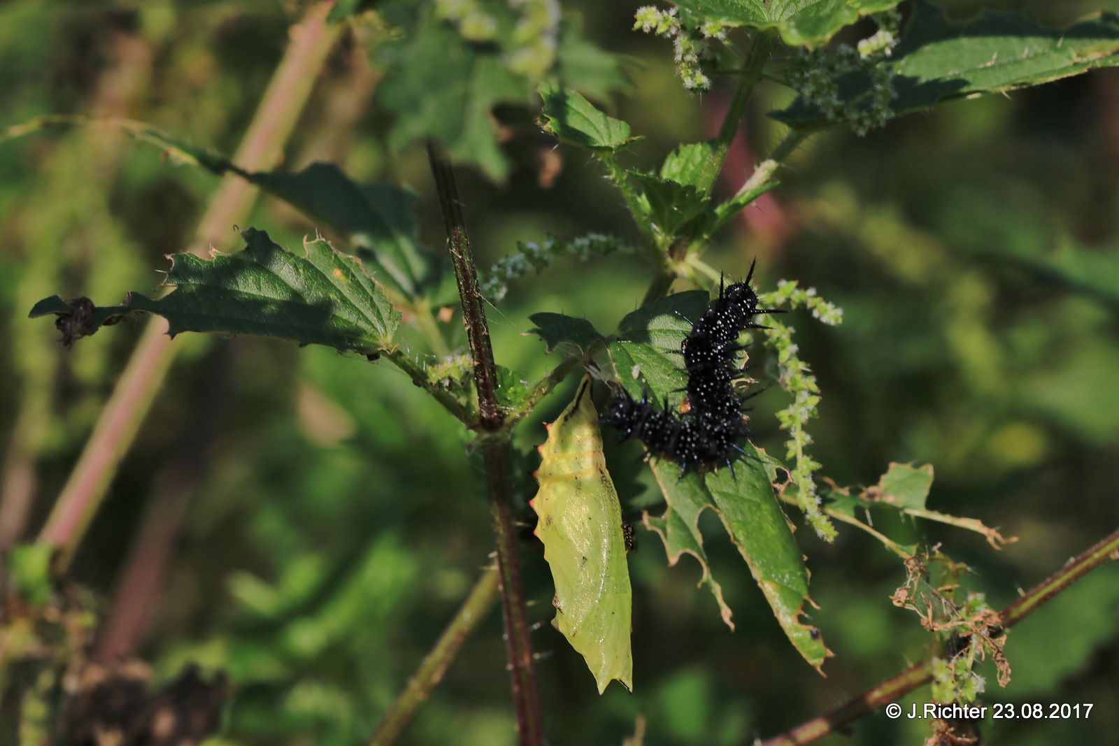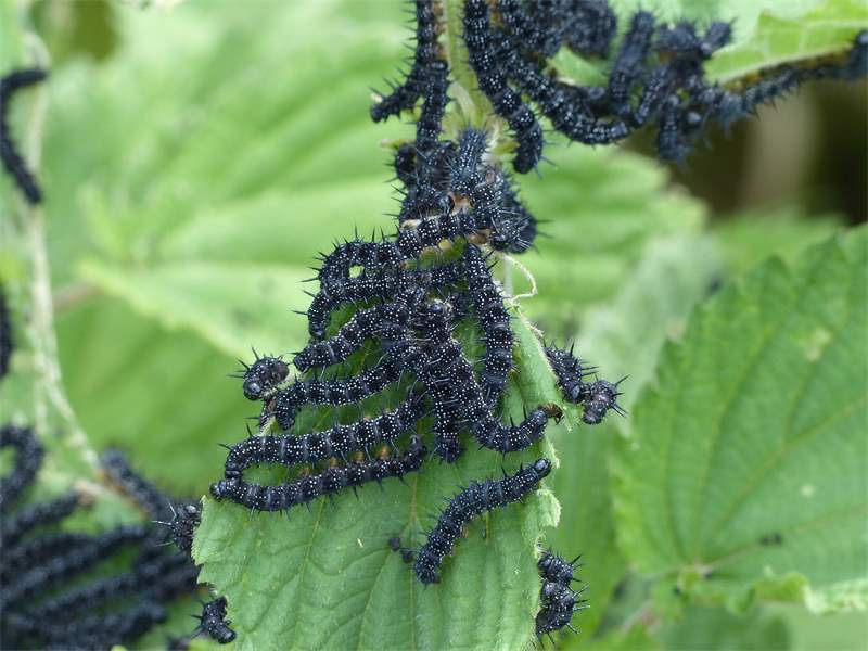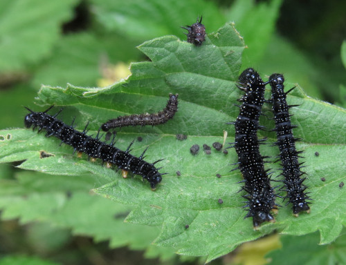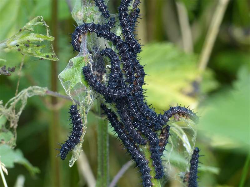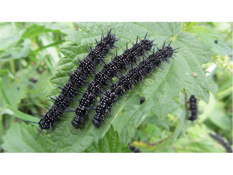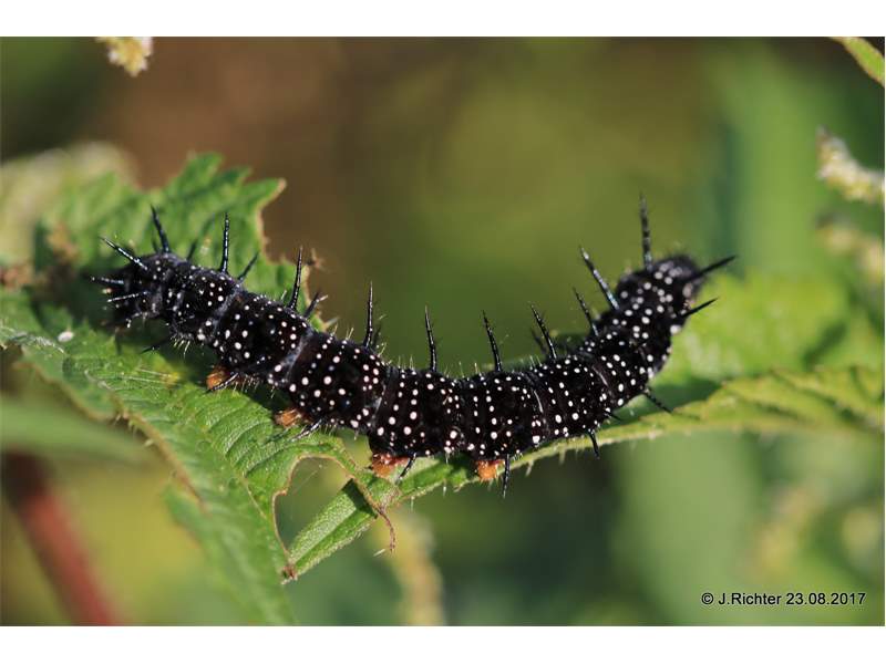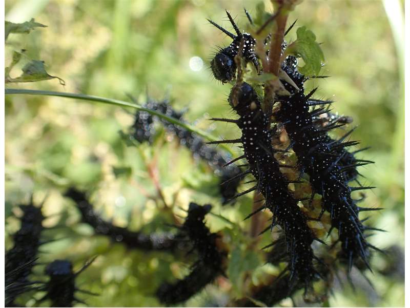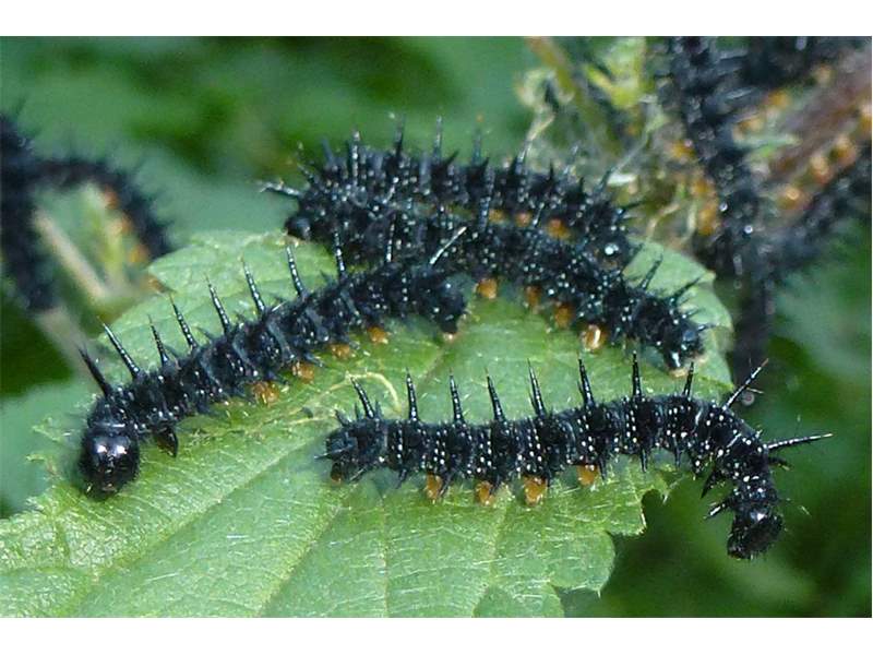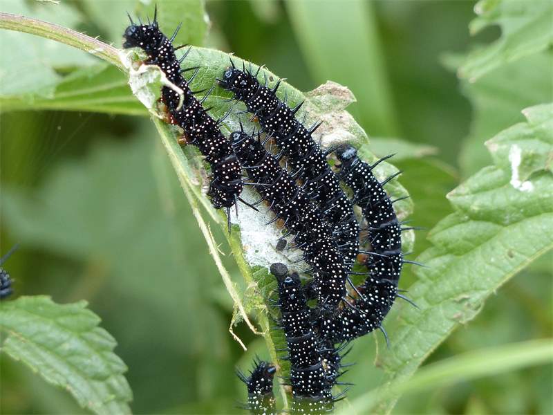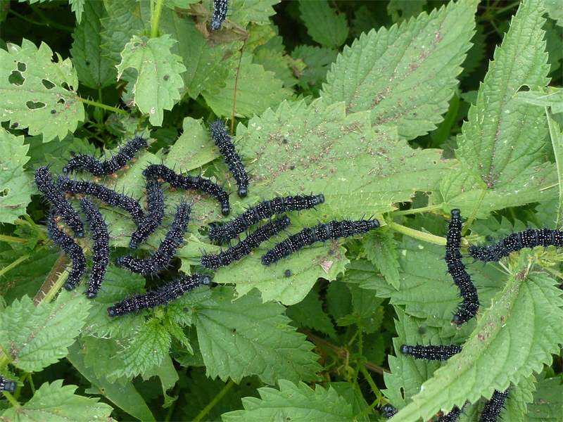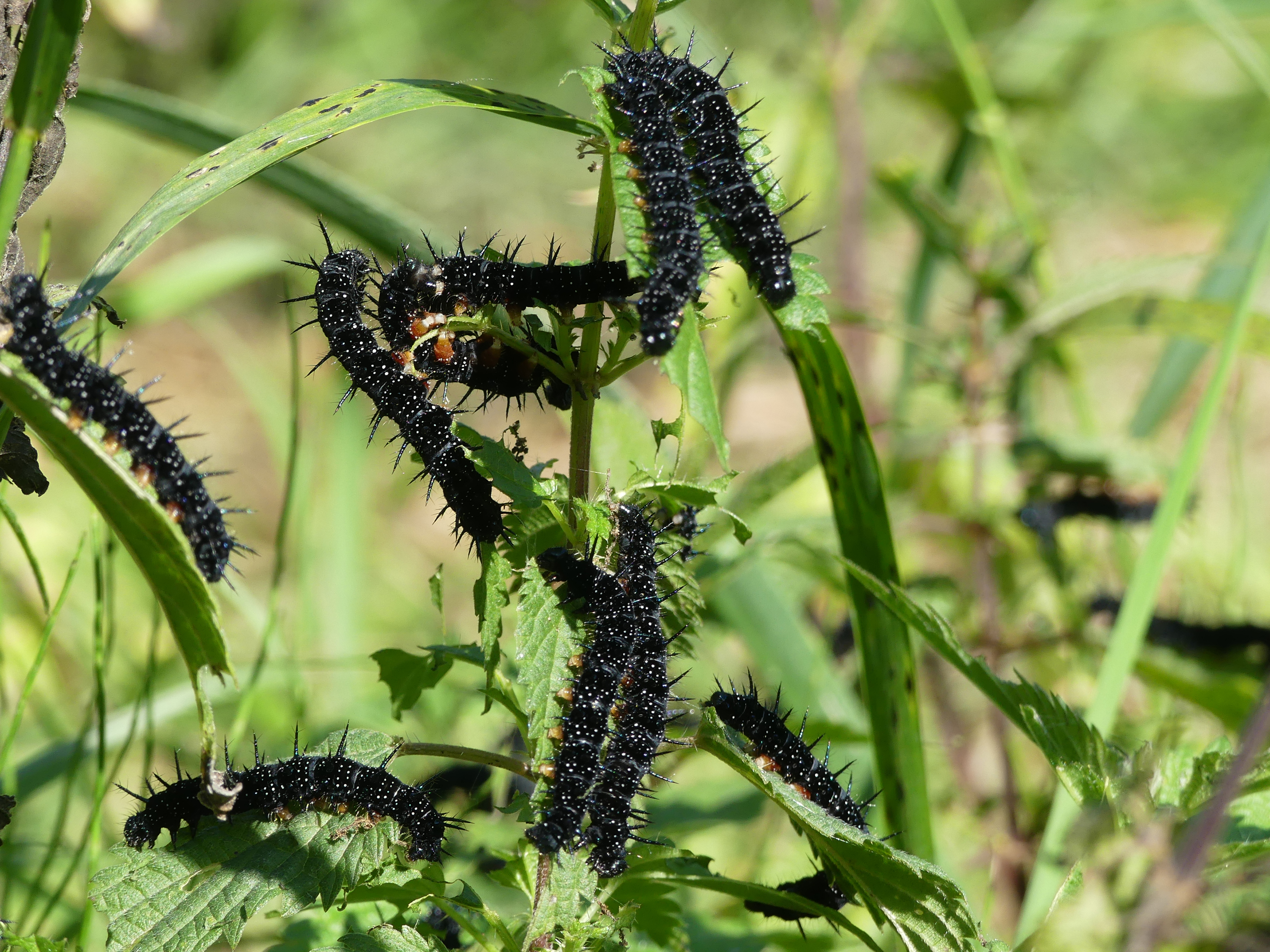 Tagpfauenauge (Aglais io (Linnaeus, 1758)), Larven in verschiedenen Entwicklungsstadien, bei Taubenheim, August 2016. (© Udo Lemke )( Bild vergrößern)