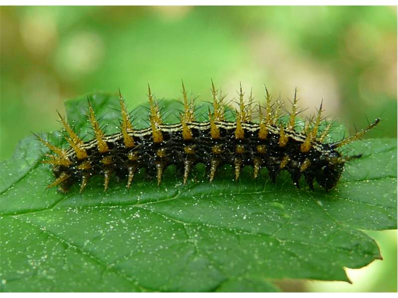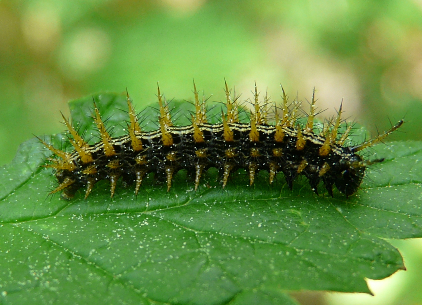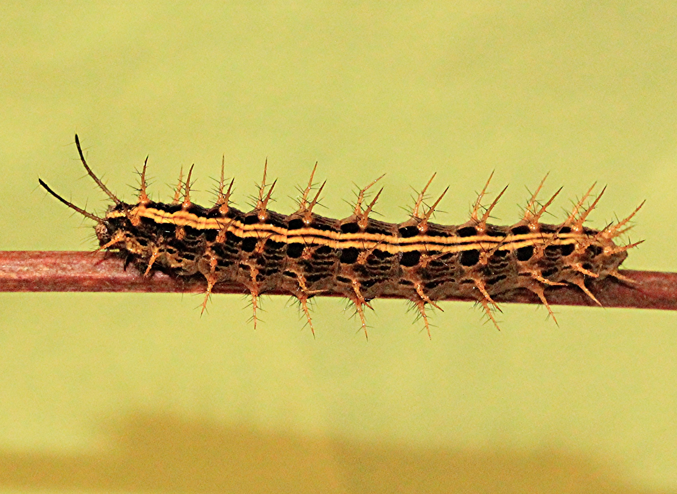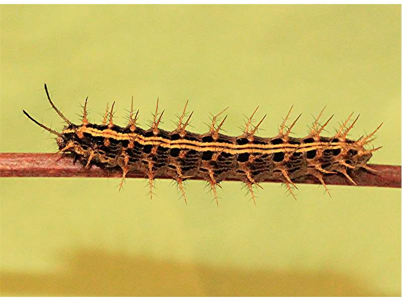 Die ausgewachsene Larve ist auf dem Rücken schwarz mit zwei gelben Längsstreifen, seitlich braun mit schwarzen Flecken und die einzelnen Segmente tragen auf dem Rücken und seitlich stachelartige Auswüchse.