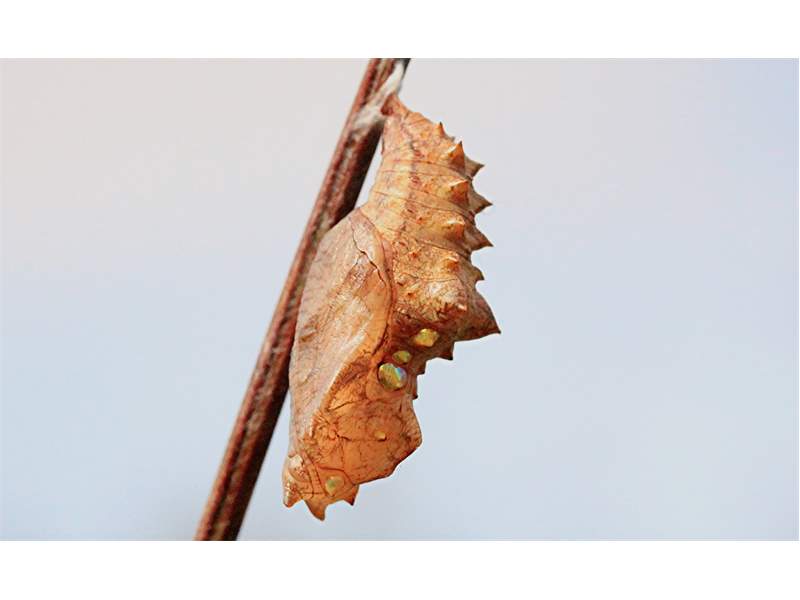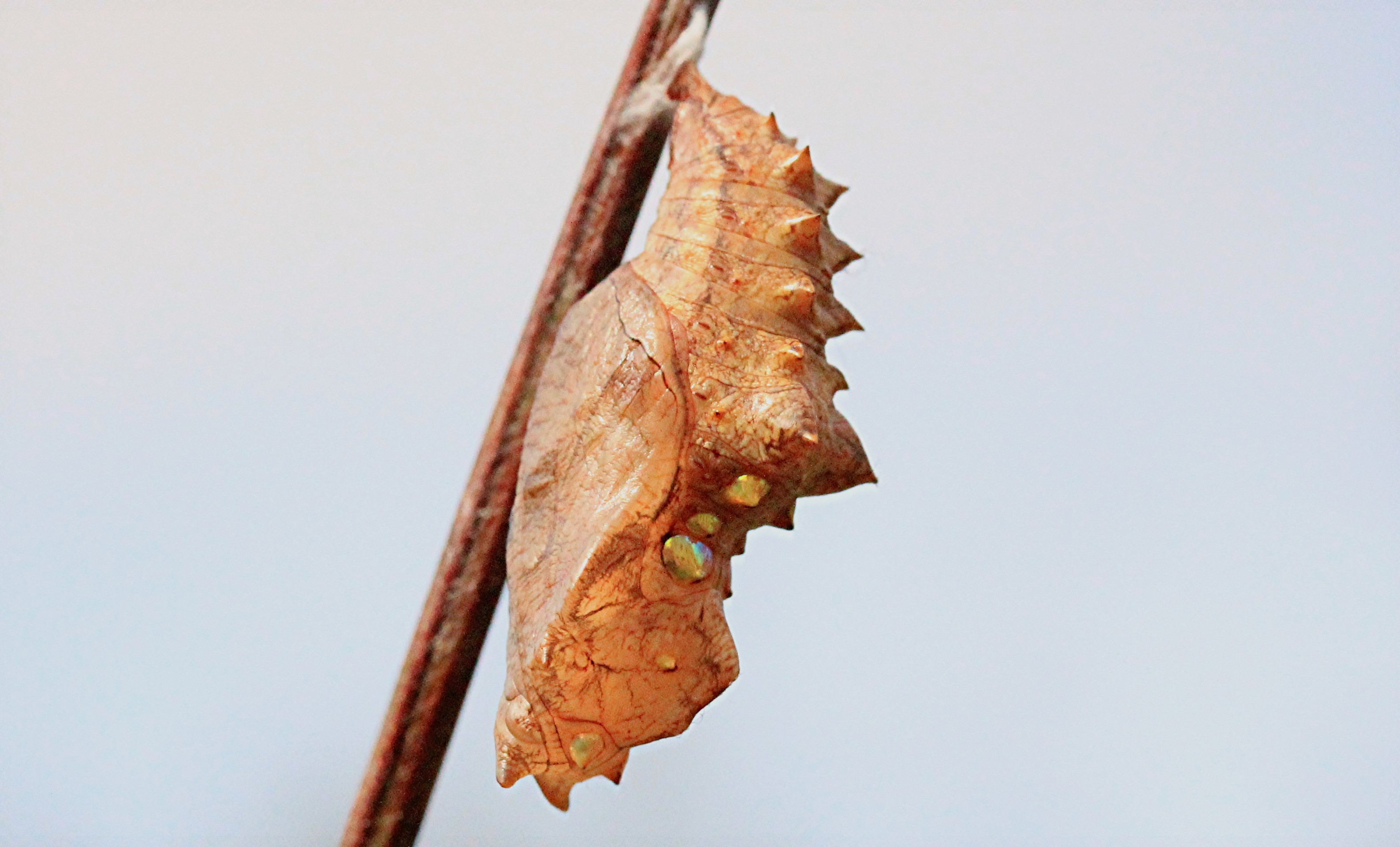 Die gezackte Stürzpuppe ist hellbraun, rotbraun oder schwarzbraun mit Gold glänzenden Dornen.