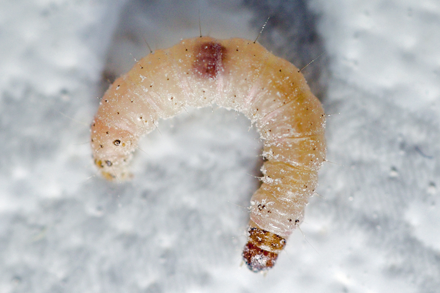 Raupe unpigmentiert hellgelblich, Kopfkapsel und Nackenschild dunkelrotbraun.