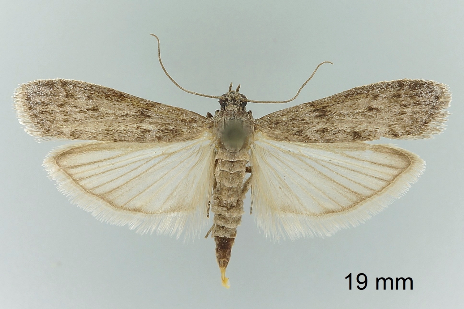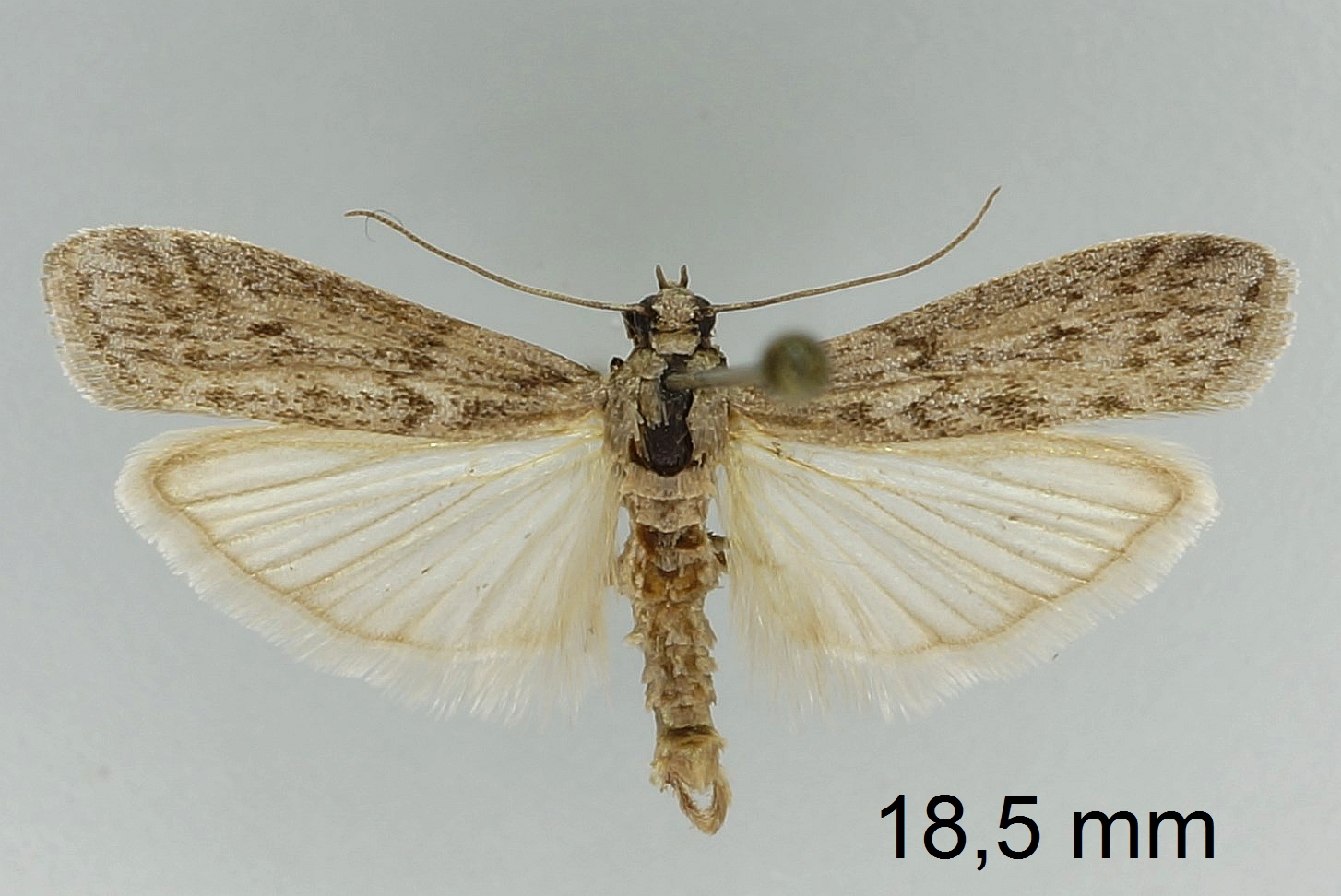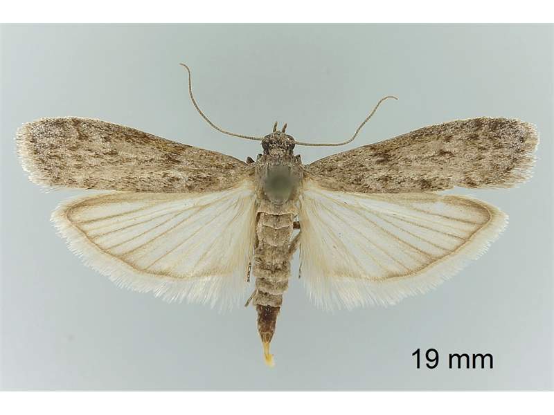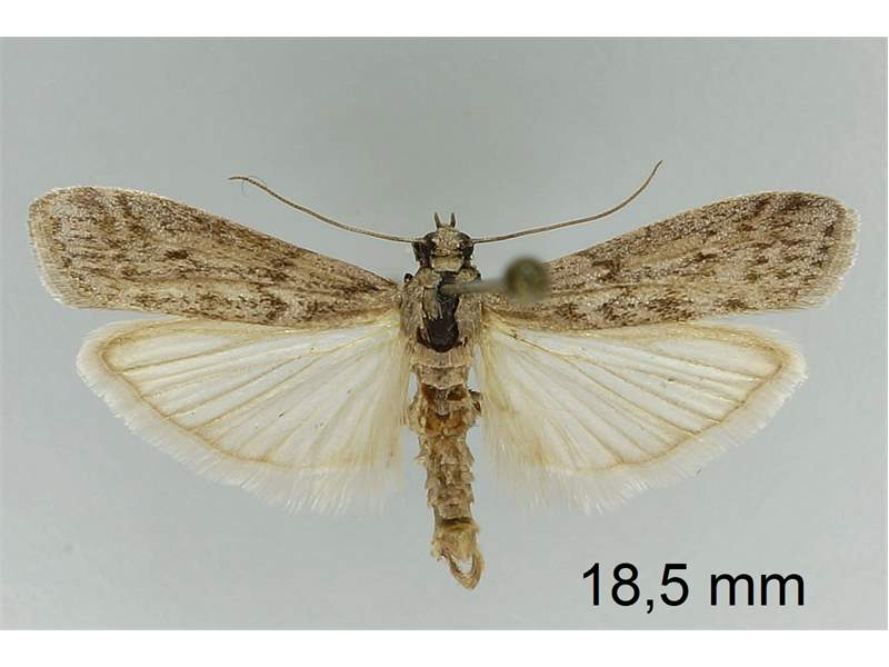 Ephestia welseriella, deren Mittelfeld in der vorderen Flügelhälfte eine grauweiße Aufhellung trägt.