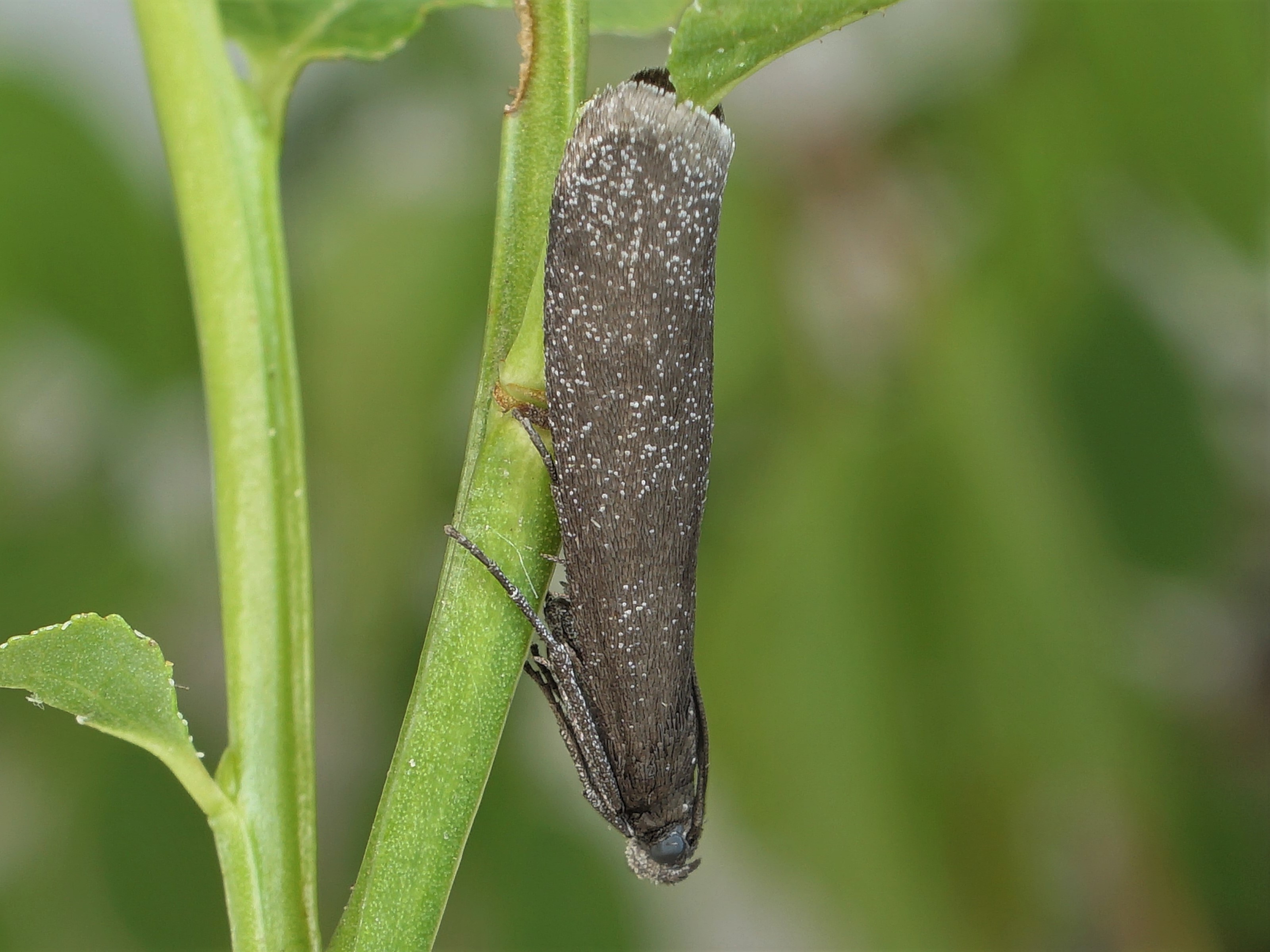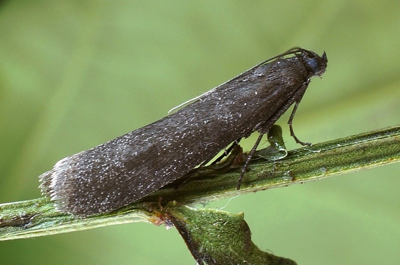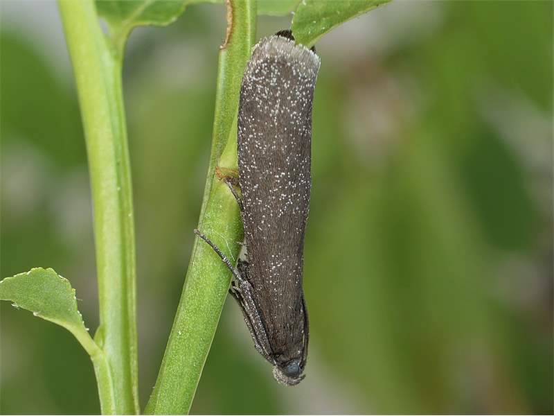 Vorderflügel einfarbig schwarzbraun mit zahlreichen apikal hellgrau gesäumten Schuppen; bei 2/5 und 4/5 zwei schwarzbraune Querlinien, die keine eingestreuten, hellgrau gesäumten Schuppen tragen; Mittelfeld im Vergleich zur restlichen Flügelfläche mit weniger hellgrau gesäumten Schuppen. Kopf schwarzbraun. Palpen dunkelgrau, ventral mit apikal weiß gesäumten Schuppen.
