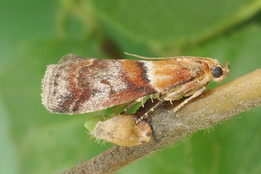 Vorderflügel X–Y mm lang; grau und (rot)braun; helle innere Querlinie bei 1/3 fehlend; Querbinde im Basalfeld weiß, distal schwarz gesäumt und ohne aufgewölbte Schuppen; Basalfeld vor der Querbinde gelbbraun; distale Querbinde im Basalfeld rotbraun; Mittelfeld grau, am Flügelvorderrand und entlang der äußeren Querlinie rotbraun; zwei (dunkel)rotbraune Diskalflecken, die bisweilen verbunden sind; Außenfeld grau, rotbrauner Saum entlang der äußeren Querlinie mit dunkelgrauer Verdunklung am Apex; Marginalflecken dunkelgrau; Fransensaum graubraun.