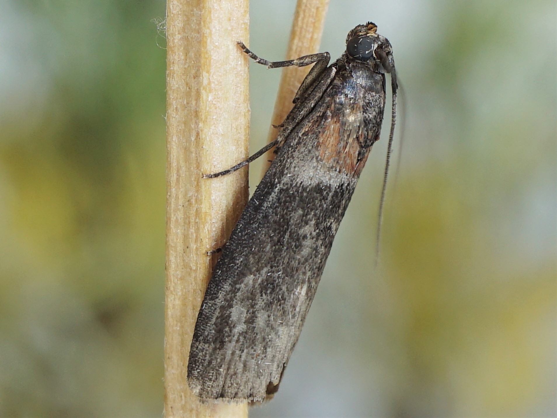 Kopf und Thorax dunkelgrau. Palpen nach oben gebogen, den Kopf leicht überragend. Antennenbasis beim Männchen mit Schuppenbusch.
