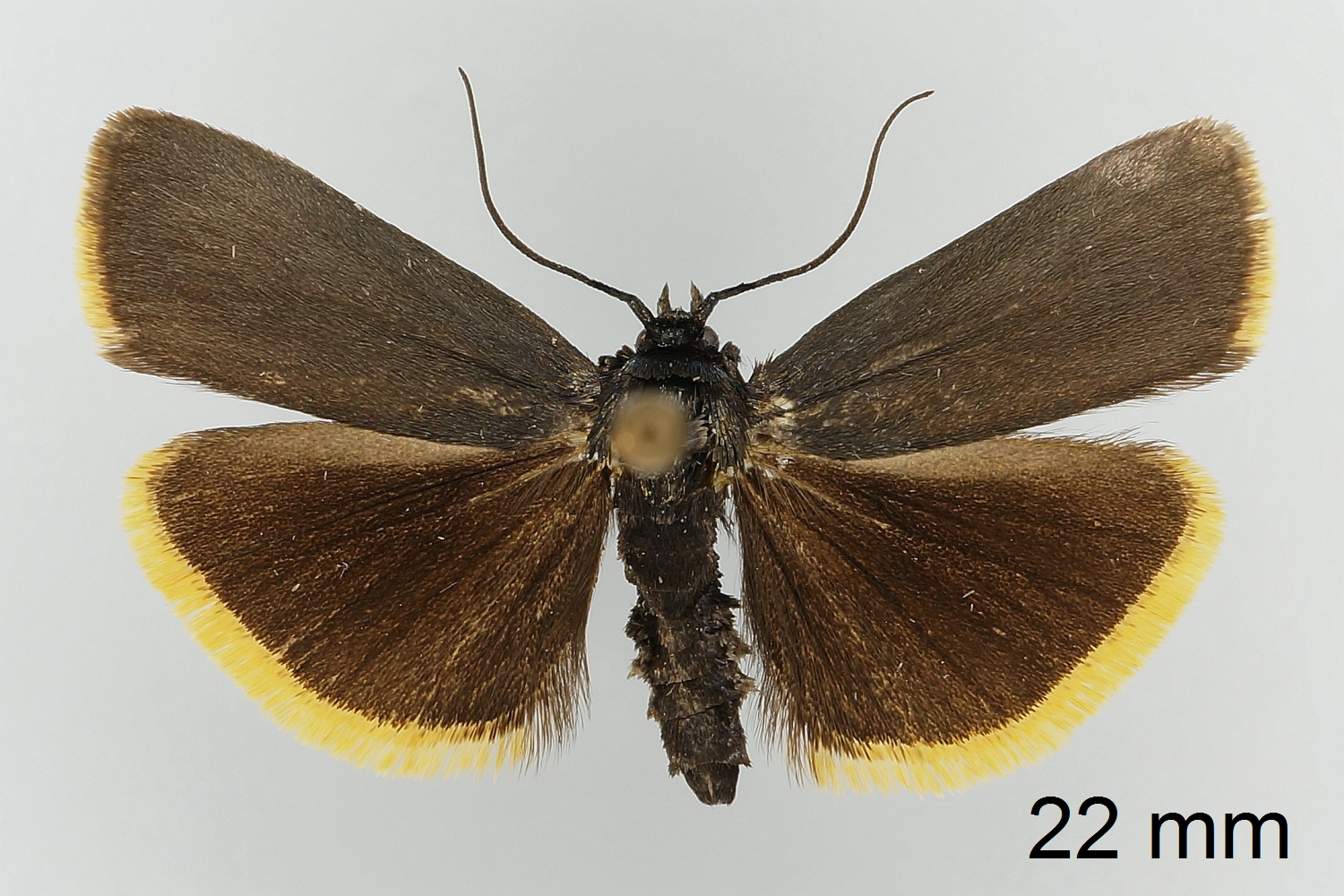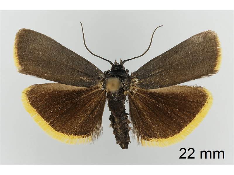 Alle Körperteile komplett dunkelblauschwarz beschuppt, Abdomenende beim Weibchen gelb. Vorderflügel und Hinterflügel einfarbig dunkelblauschwarz schimmernd; Fransensaum gelb.