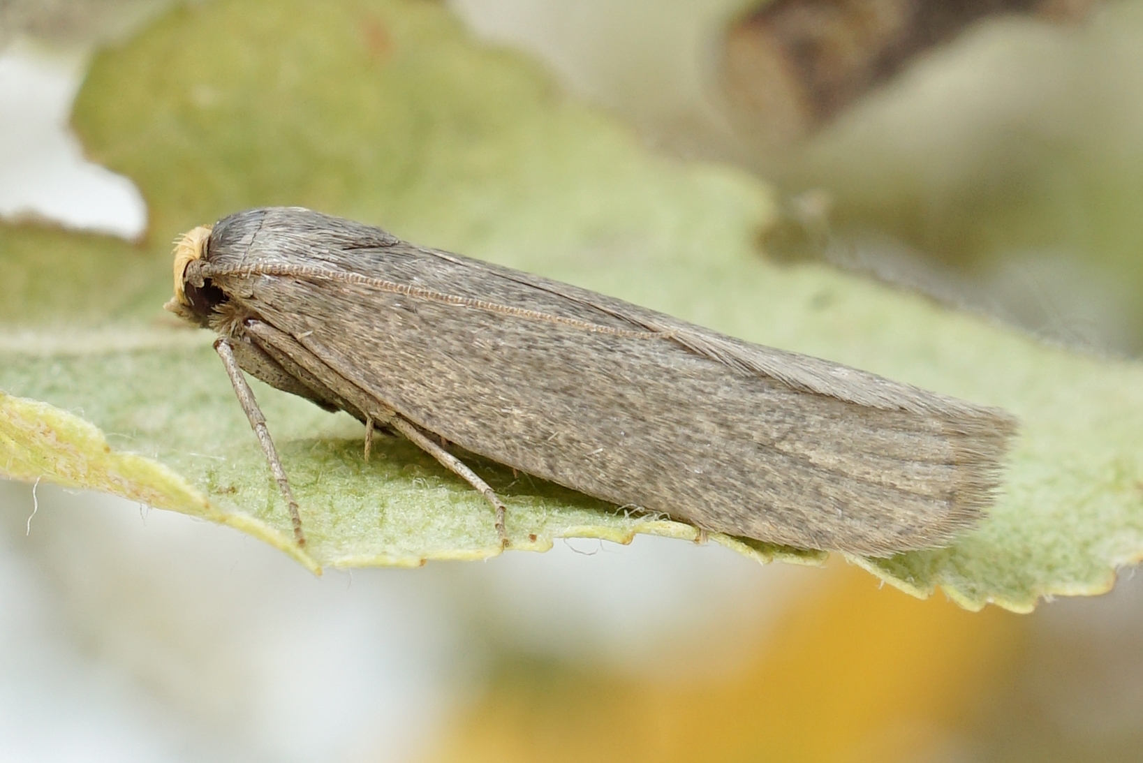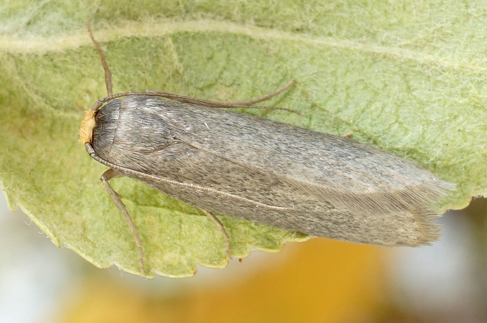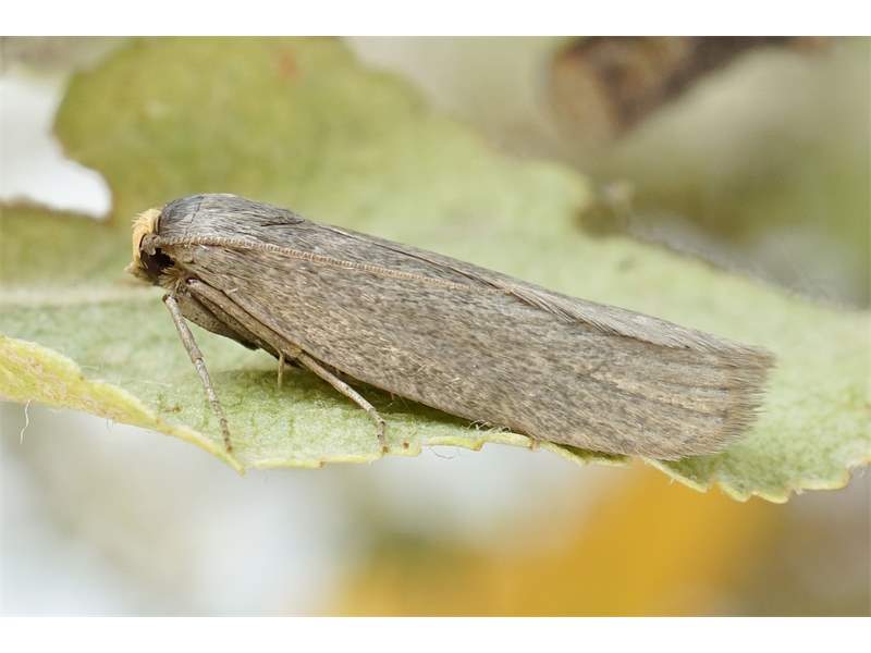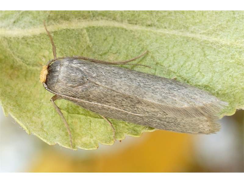 Hinterflügel hellgrau; Apex in spitzem Winkel zulaufend. Antennen und Antennenbasis einfarbig dunkelbraun, mit hellgrauem basalen Schuppenbusch. Palpen hellgelb, sehr kurz und nach vorn oben gestreckt. Beine einfarbig hellbraungrau.