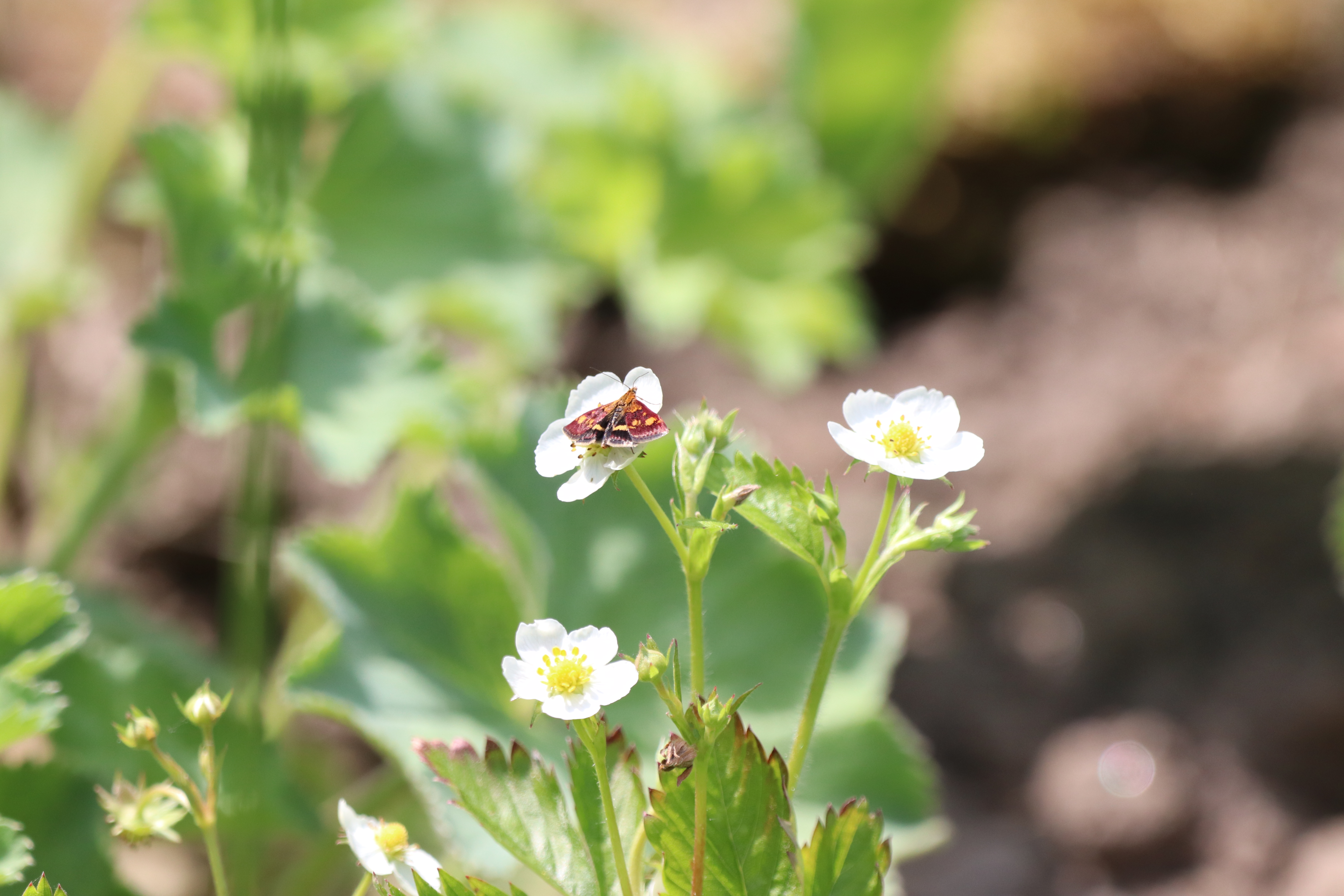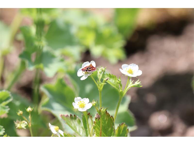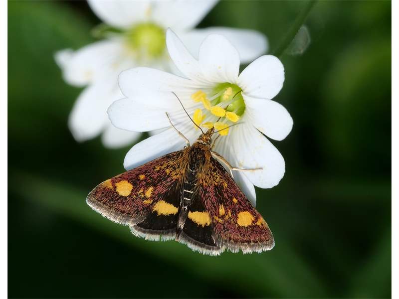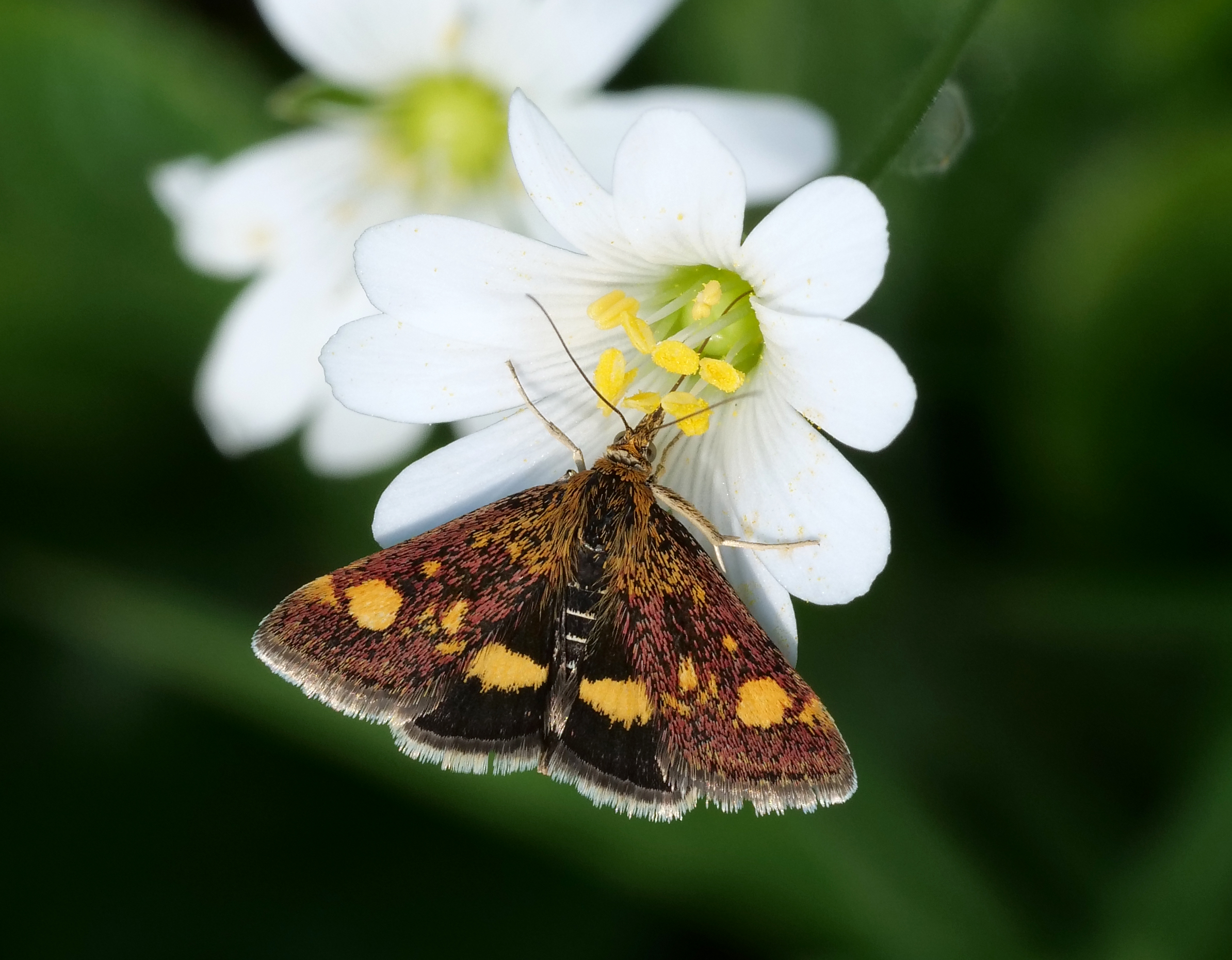Pyrausta aurata auf Großer Sternmiere (Stellaria holostea), Garten in Fuhlendorf (Vorpommern-Rügen), Mai 2019
