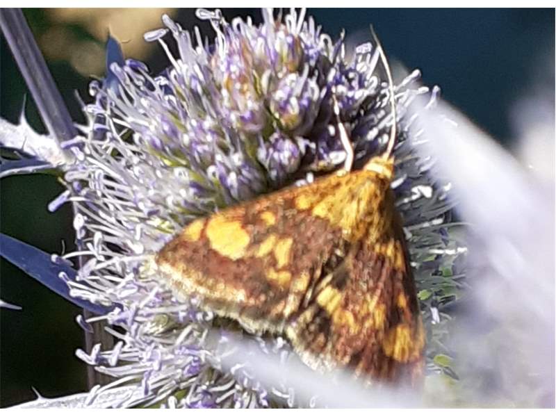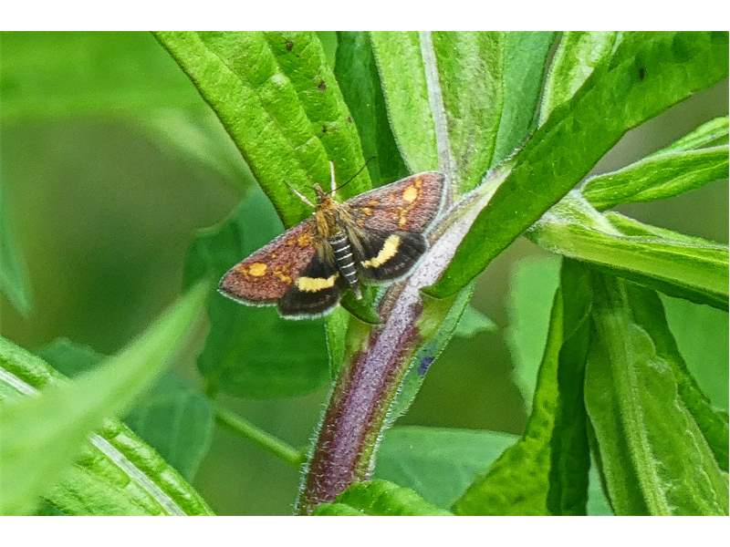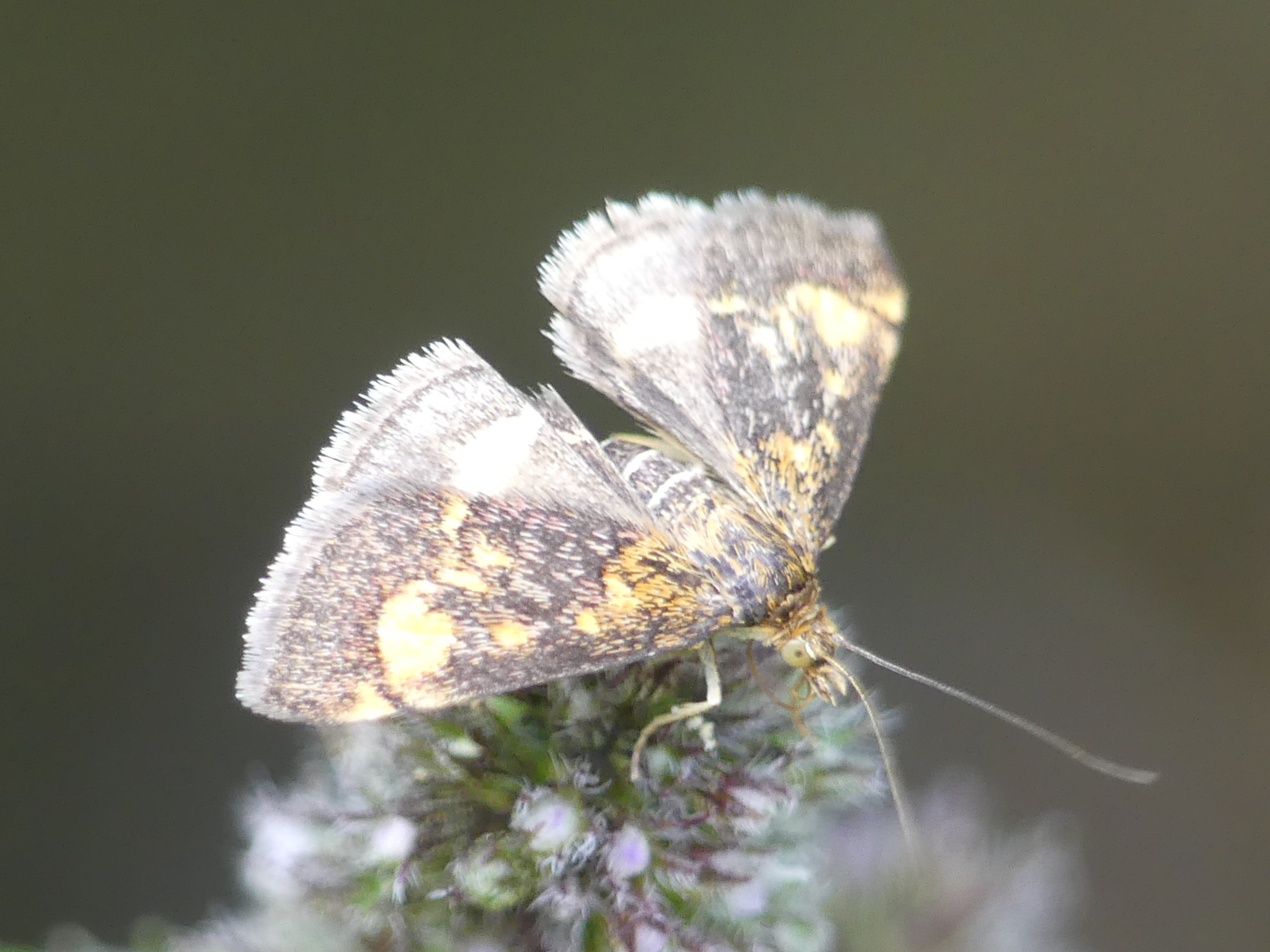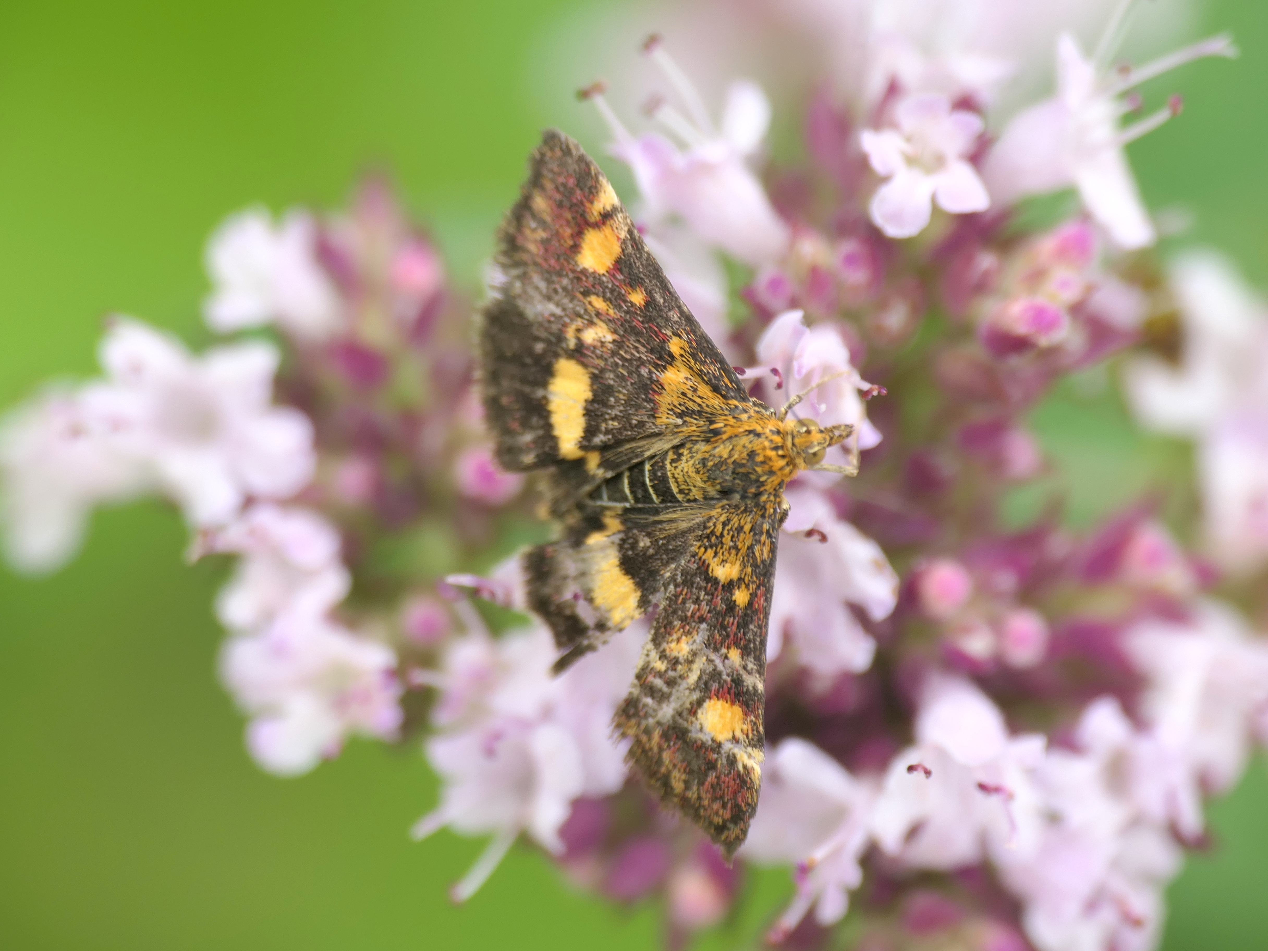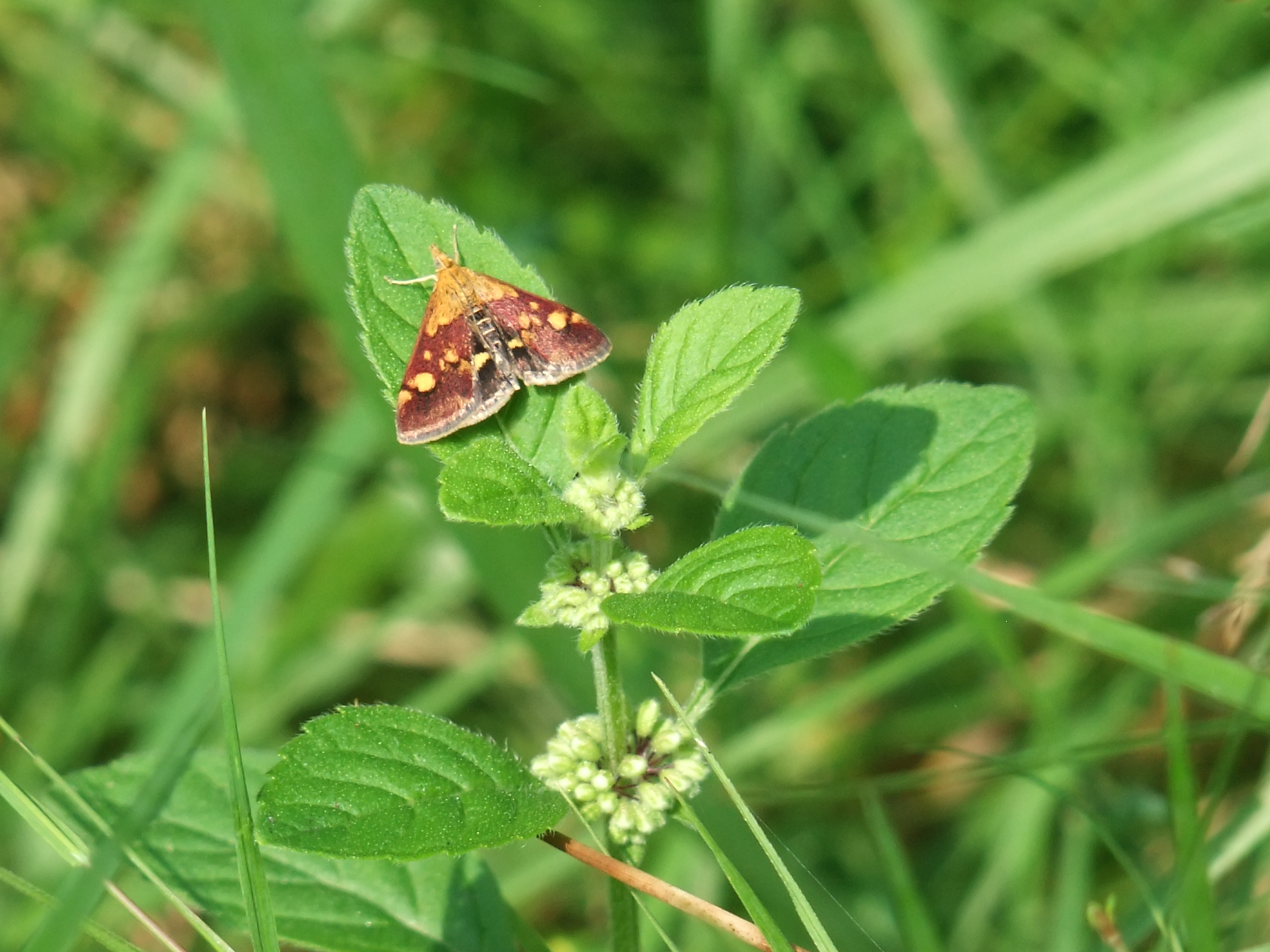 Pyrausta aurata, an einem Waldweg bei Neuendorf-Heide (Vorpommern-Rügen), Ende Juli 2018