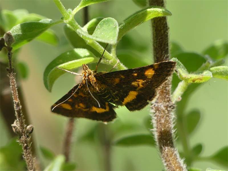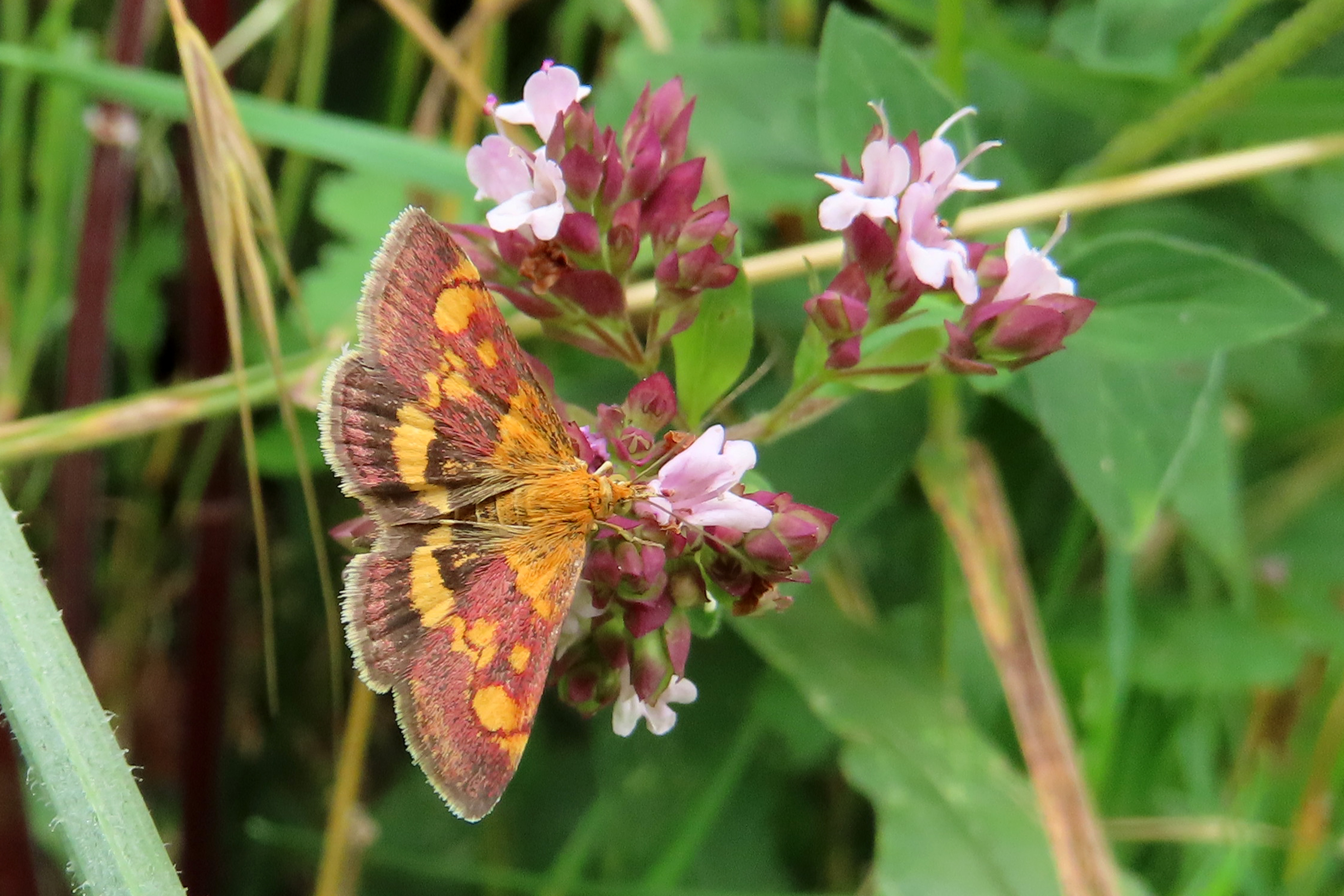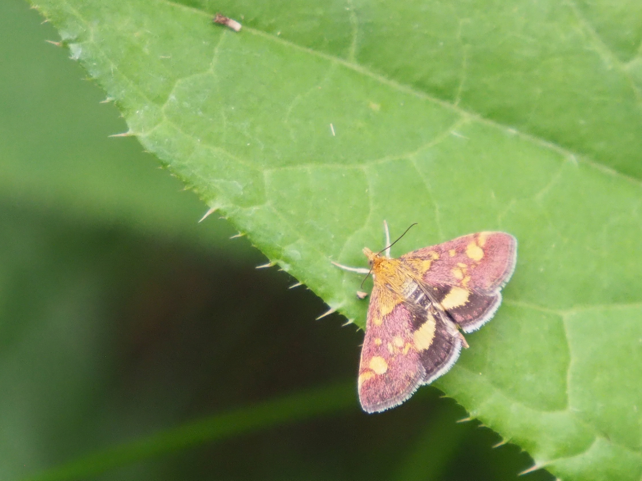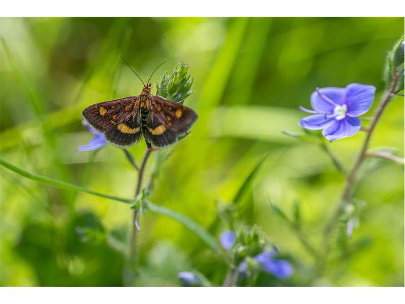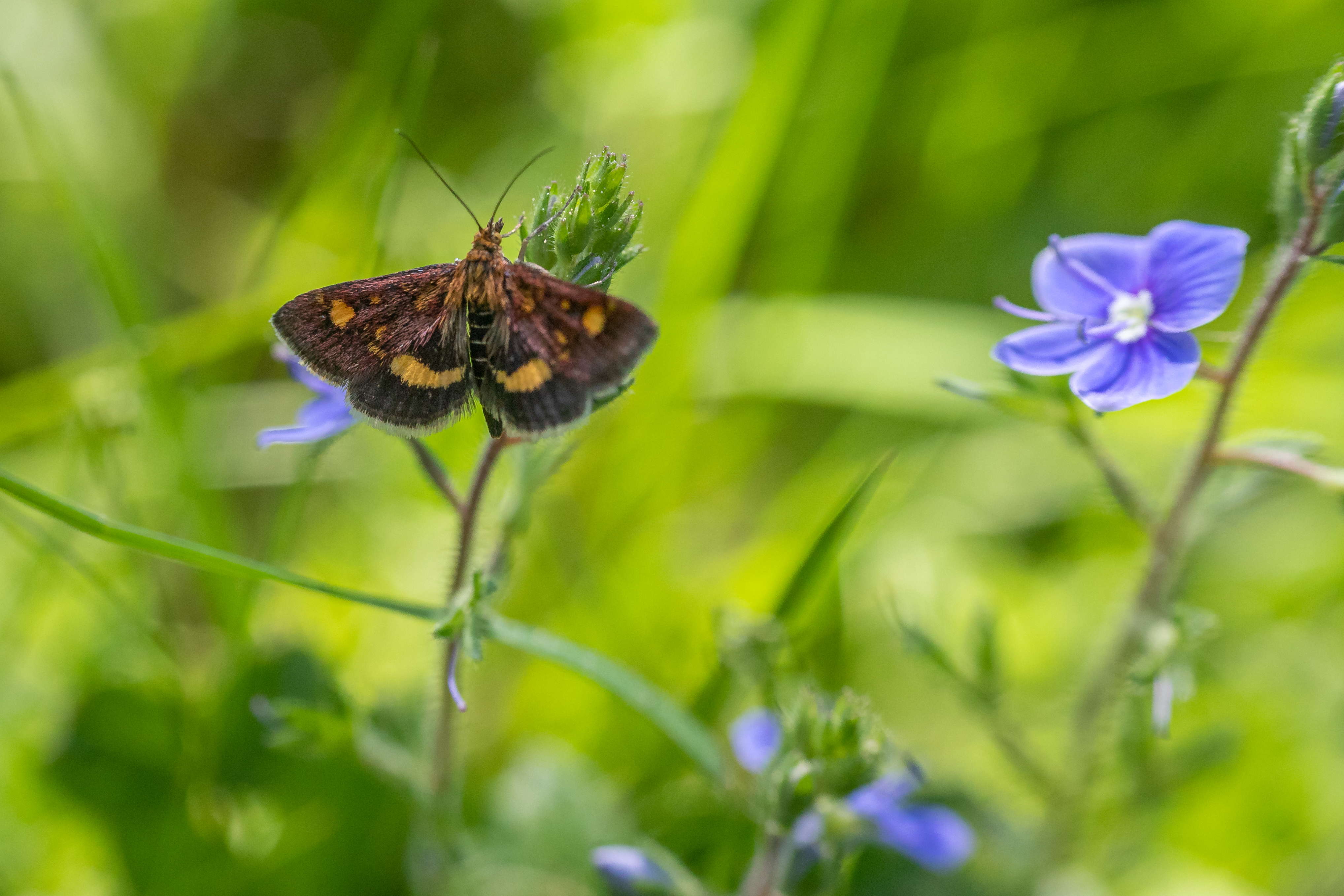Pyrausta aurata, an einem Waldweg bei Neuendorf-Heide (Vorpommern-Rügen), Ende Juli 2018