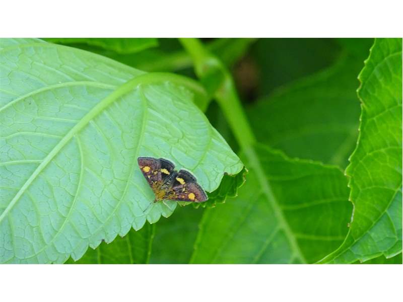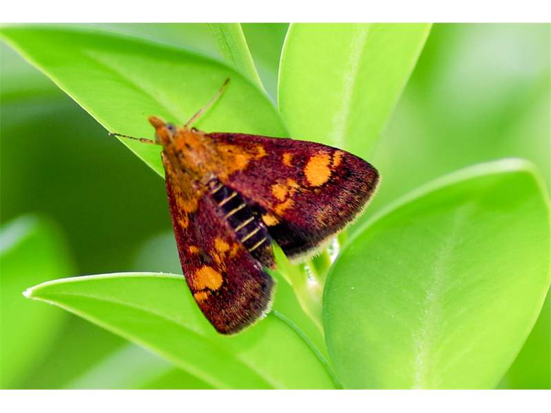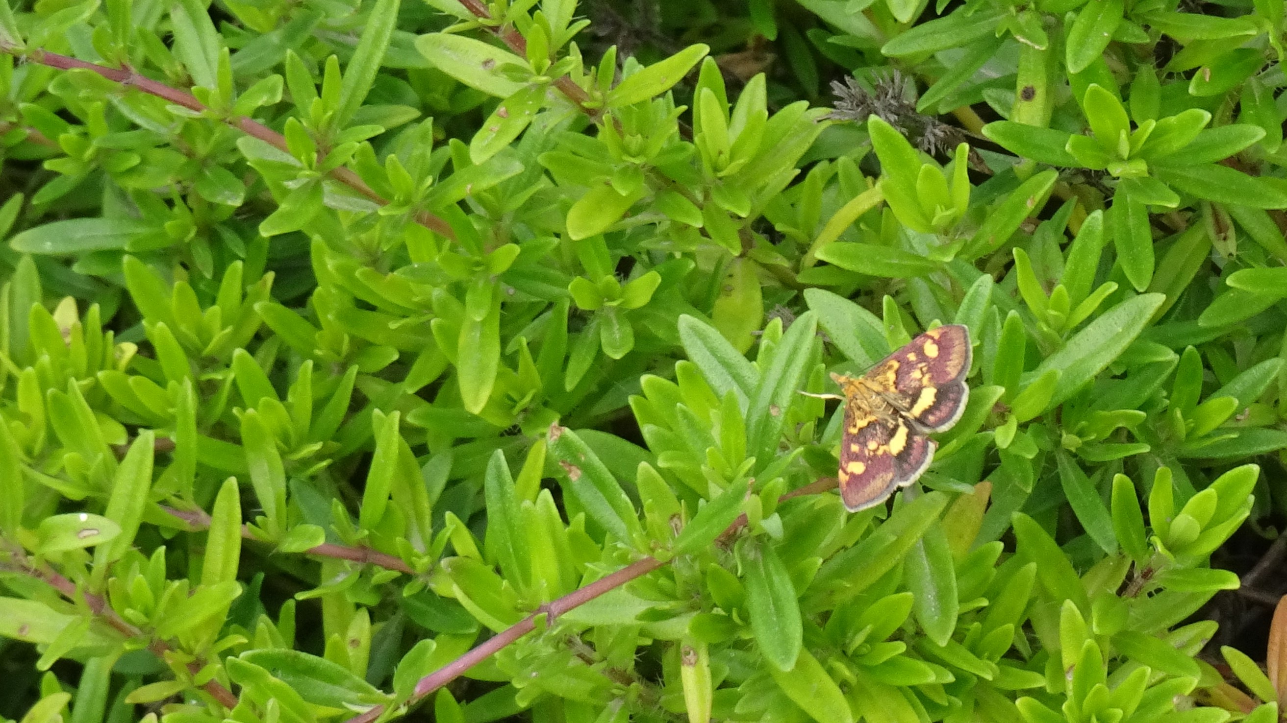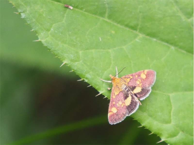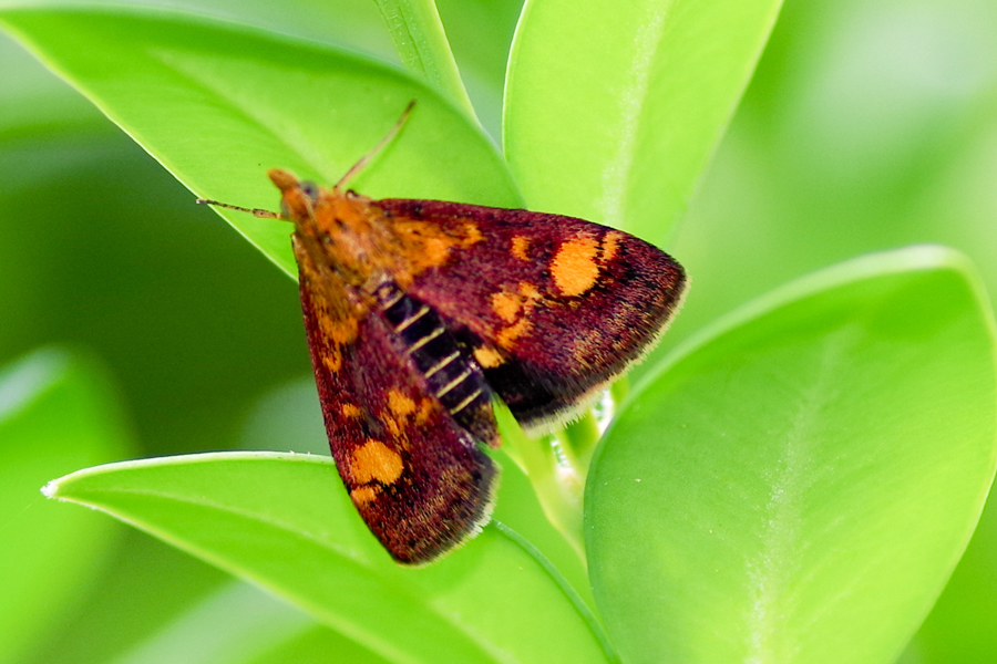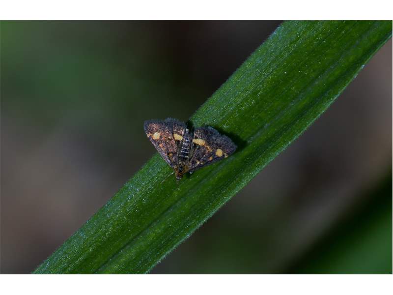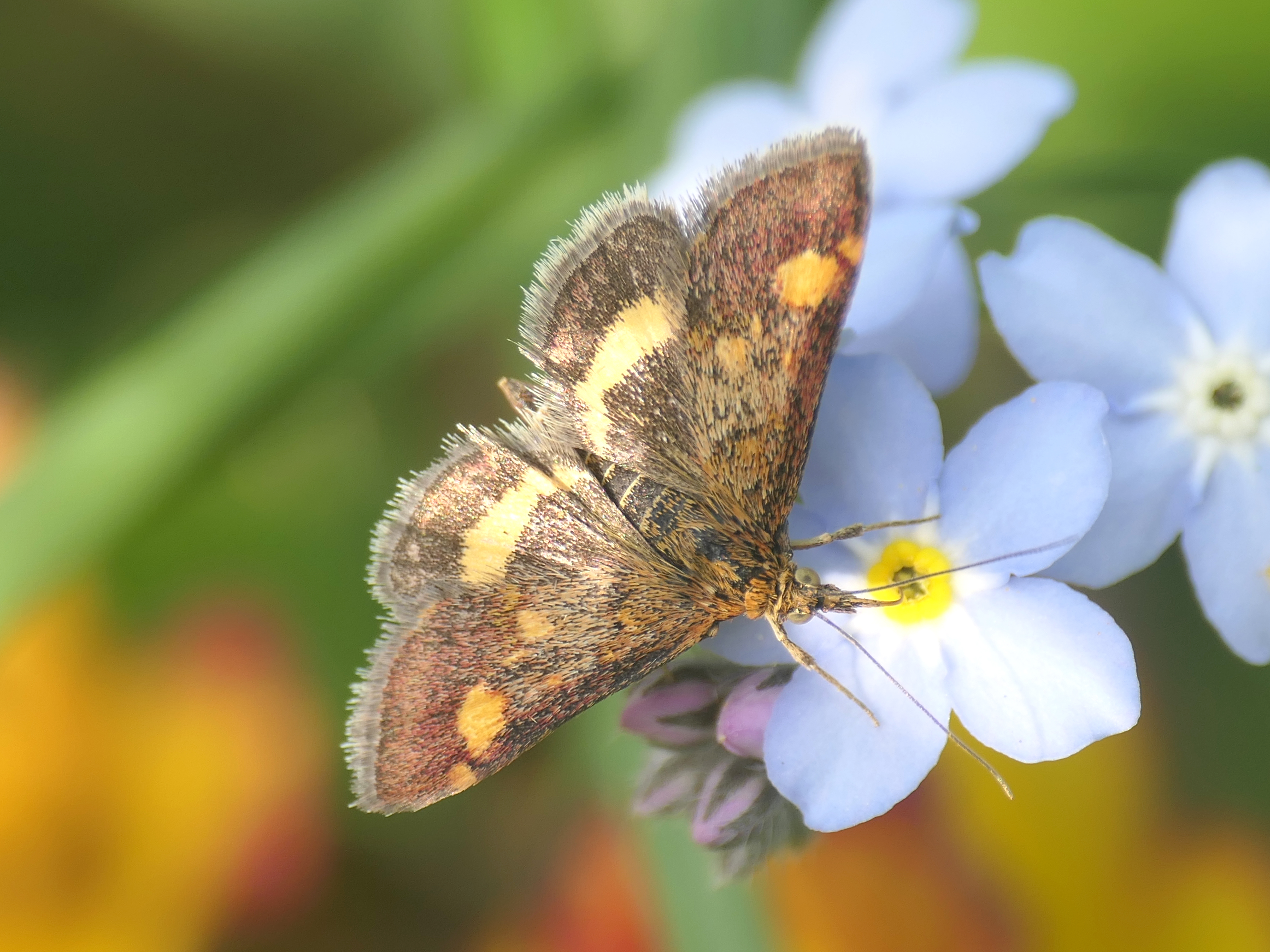 Pyrausta aurata, an einem Waldweg bei Neuendorf-Heide (Vorpommern-Rügen), Ende Juli 2018