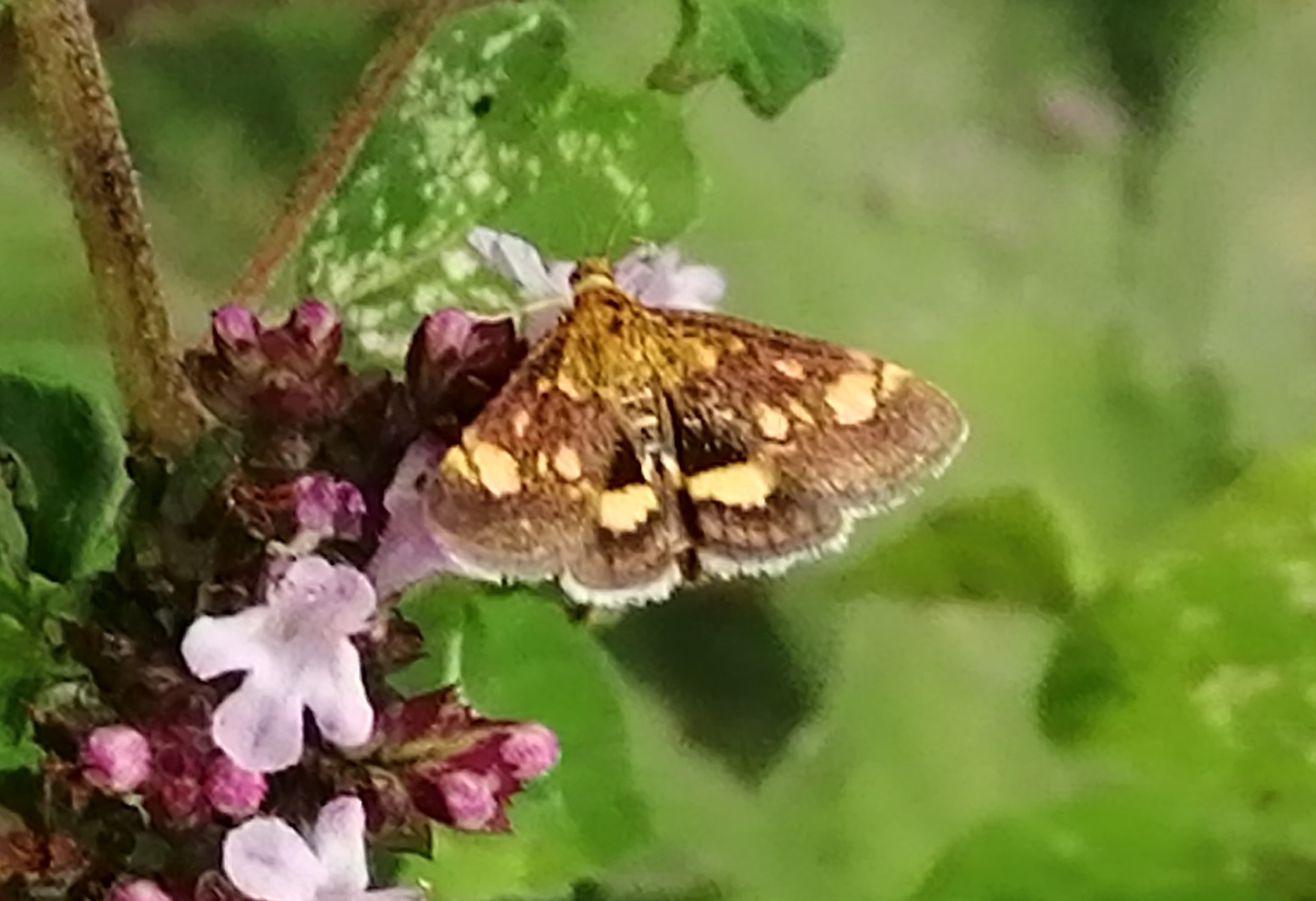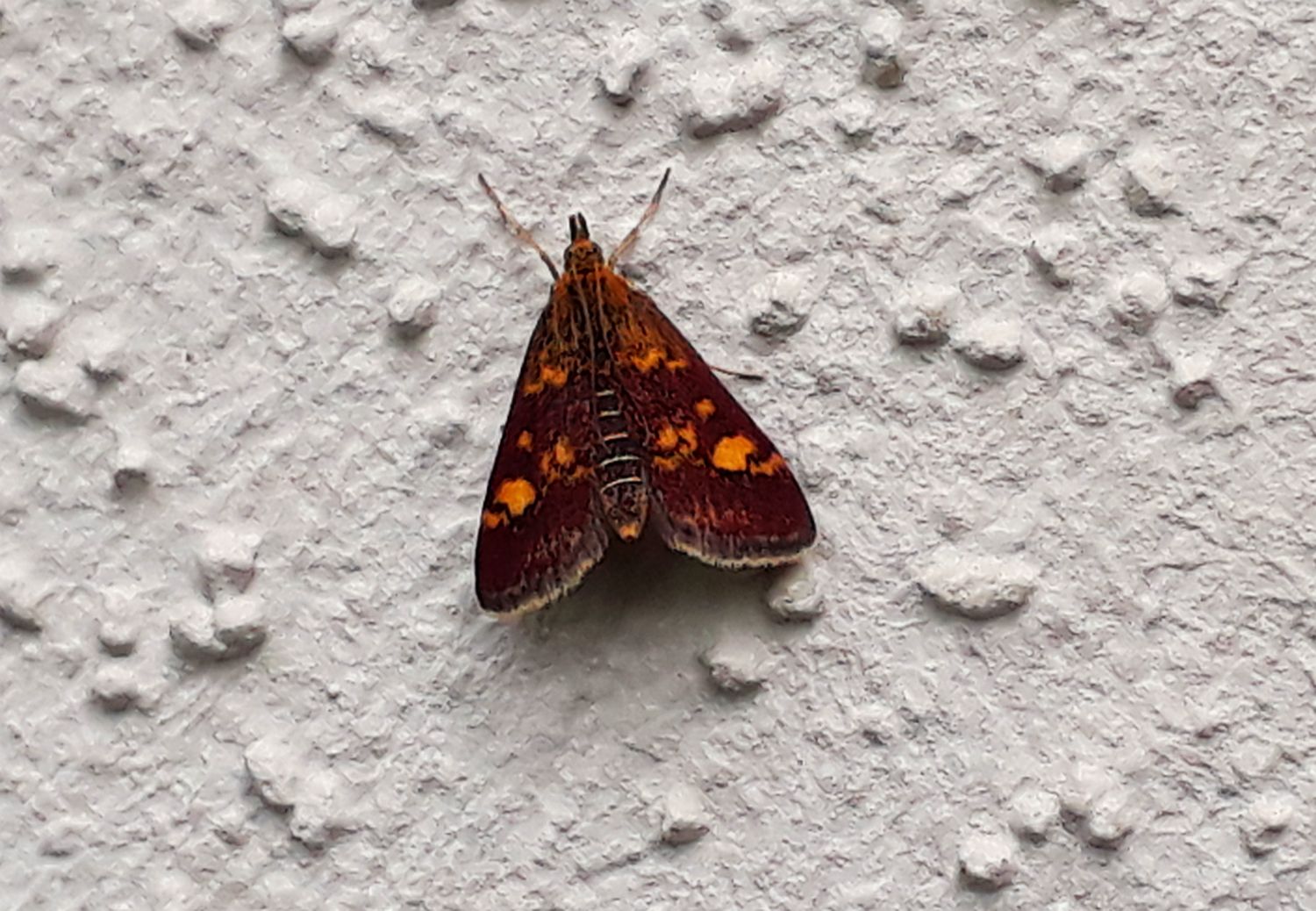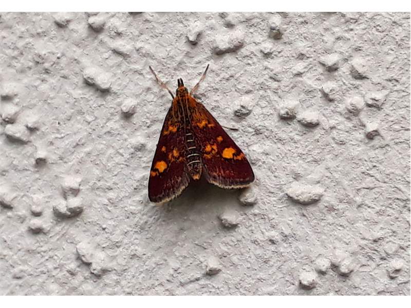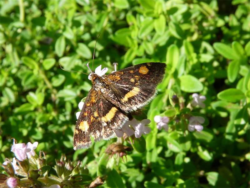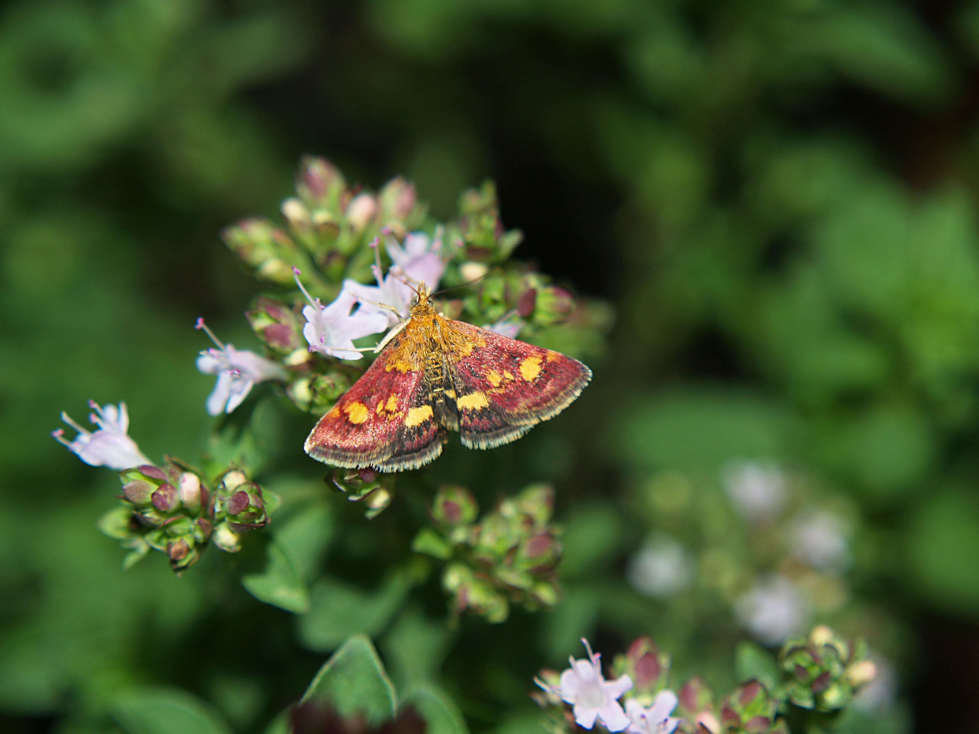 Pyrausta aurata in Leipzig an der Hauswand neben unserem Kräutergarten mit Minze, Salbei und Thymian.