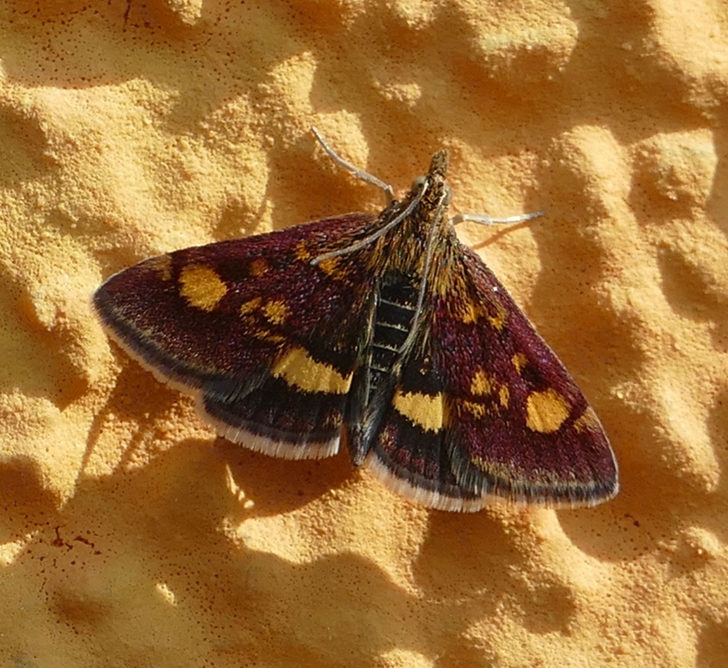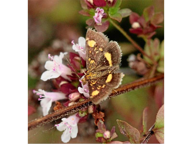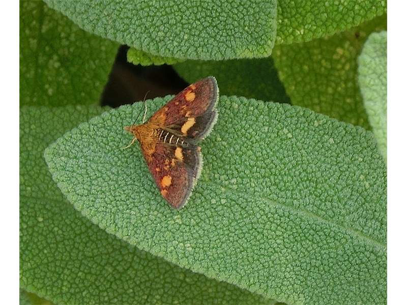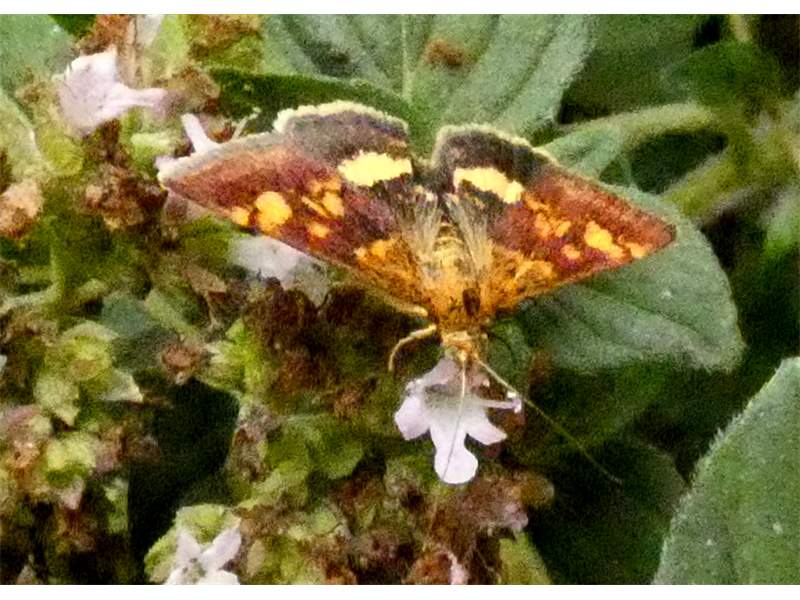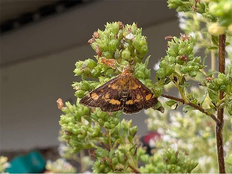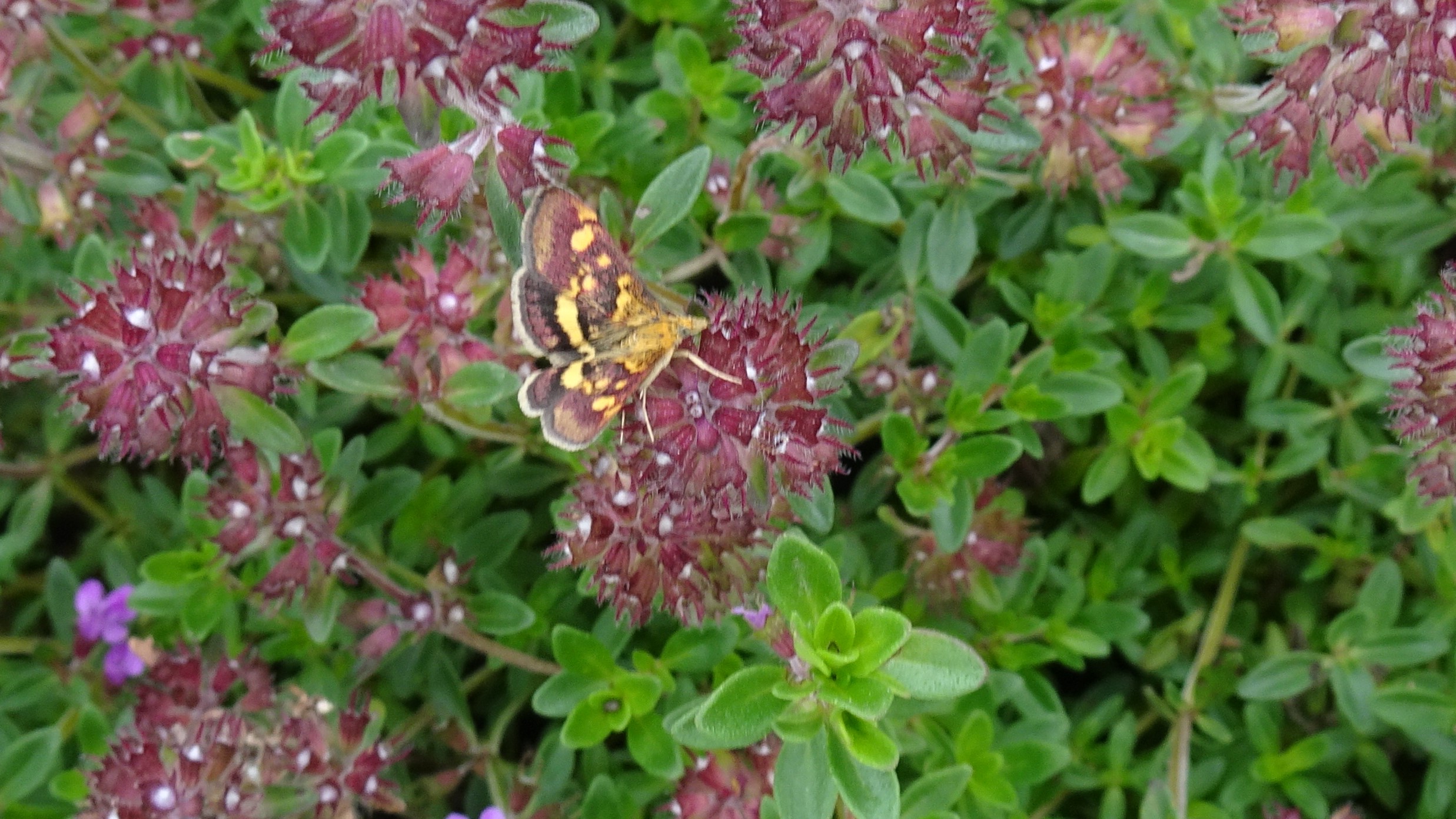 Pyrausta aurata in Leipzig an der Hauswand neben unserem Kräutergarten mit Minze, Salbei und Thymian.
