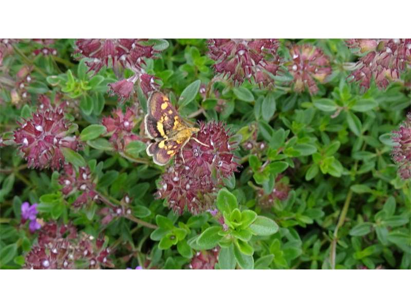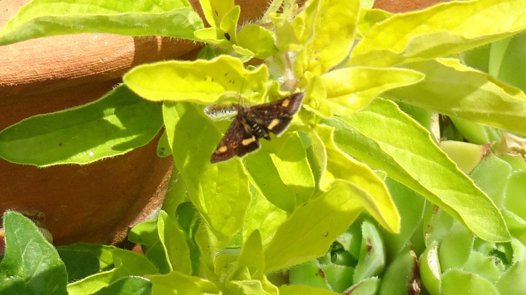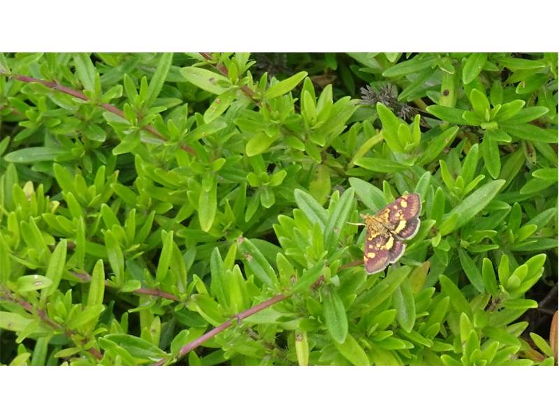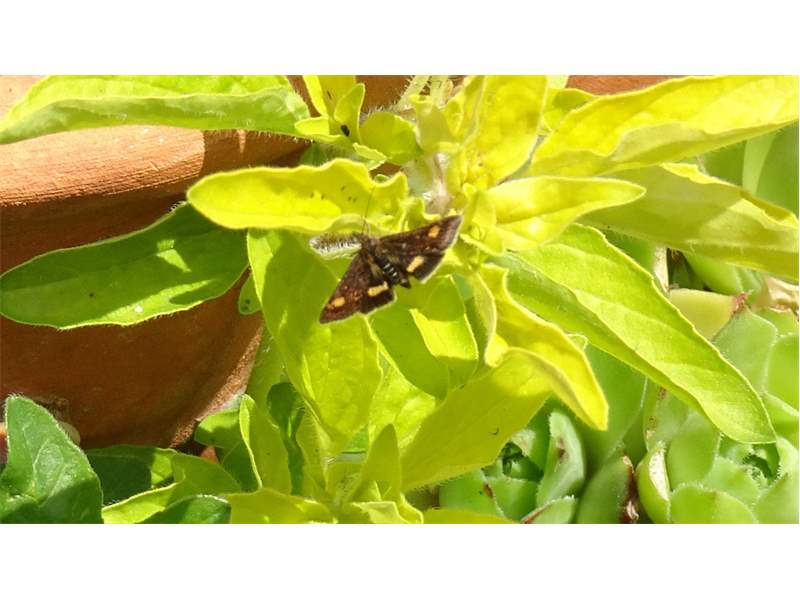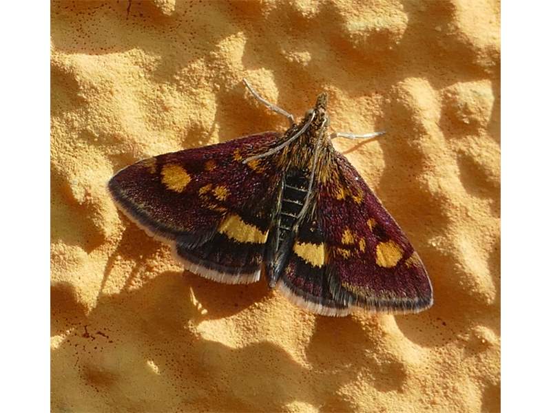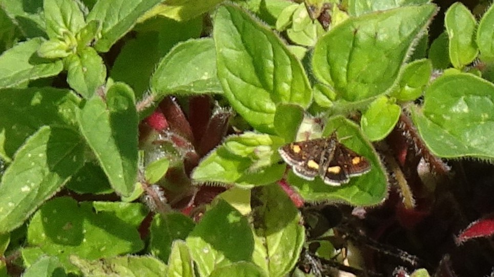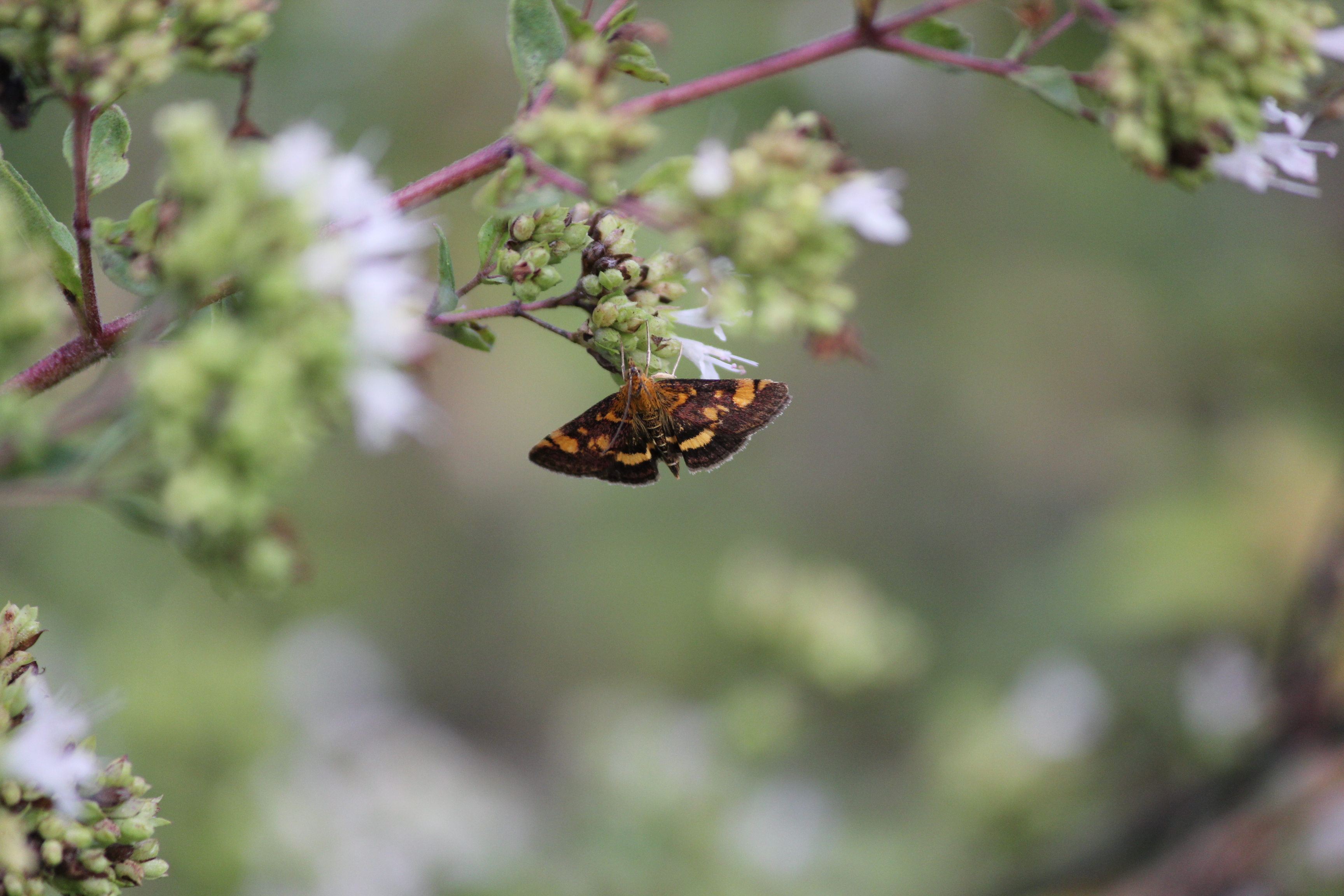 Pyrausta aurata in Leipzig an der Hauswand neben unserem Kräutergarten mit Minze, Salbei und Thymian.