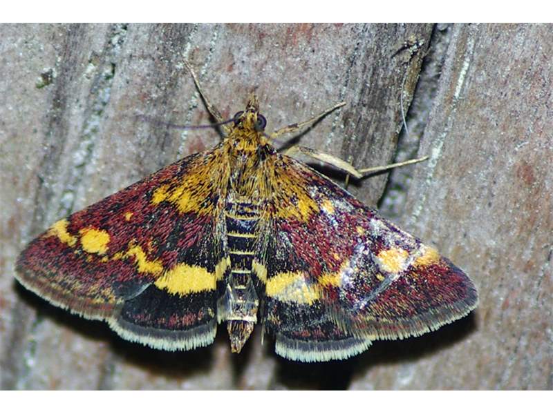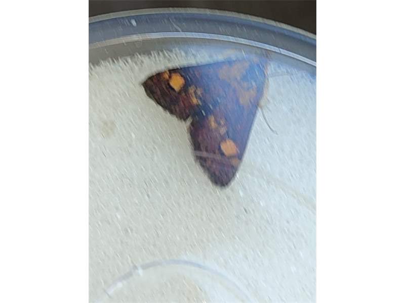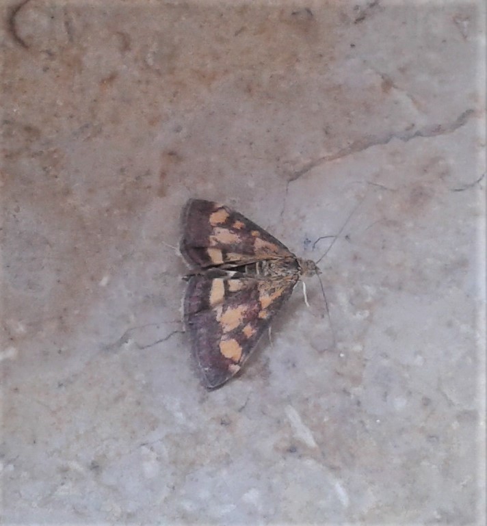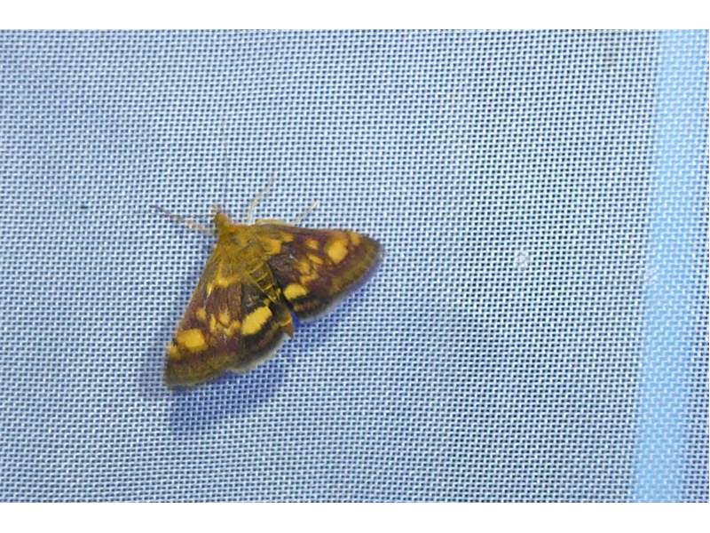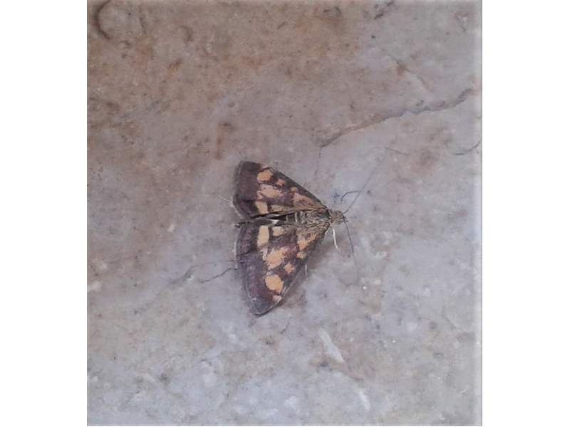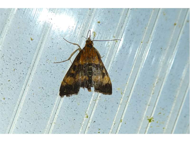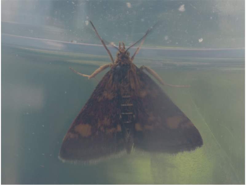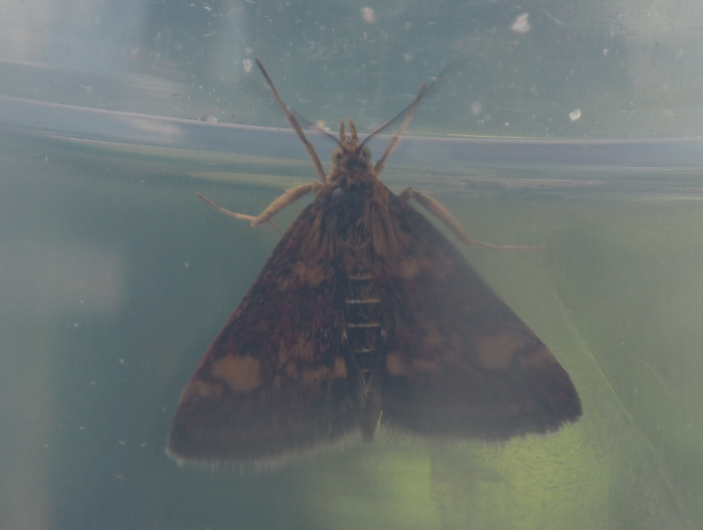 Pyrausta aurata im Oktober 2014 als Larve an Basilikum in Radebeul gefunden. Der Falter schlüpfte am 24.01.2015 in einer Wohnung