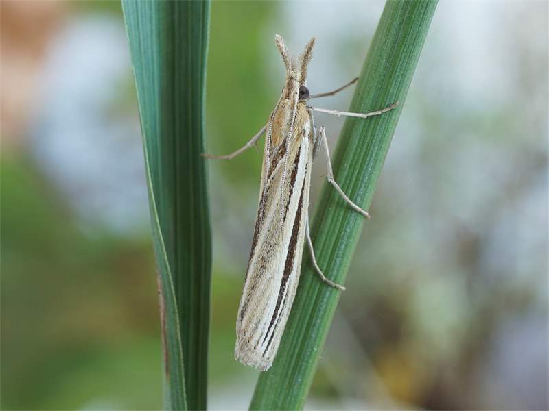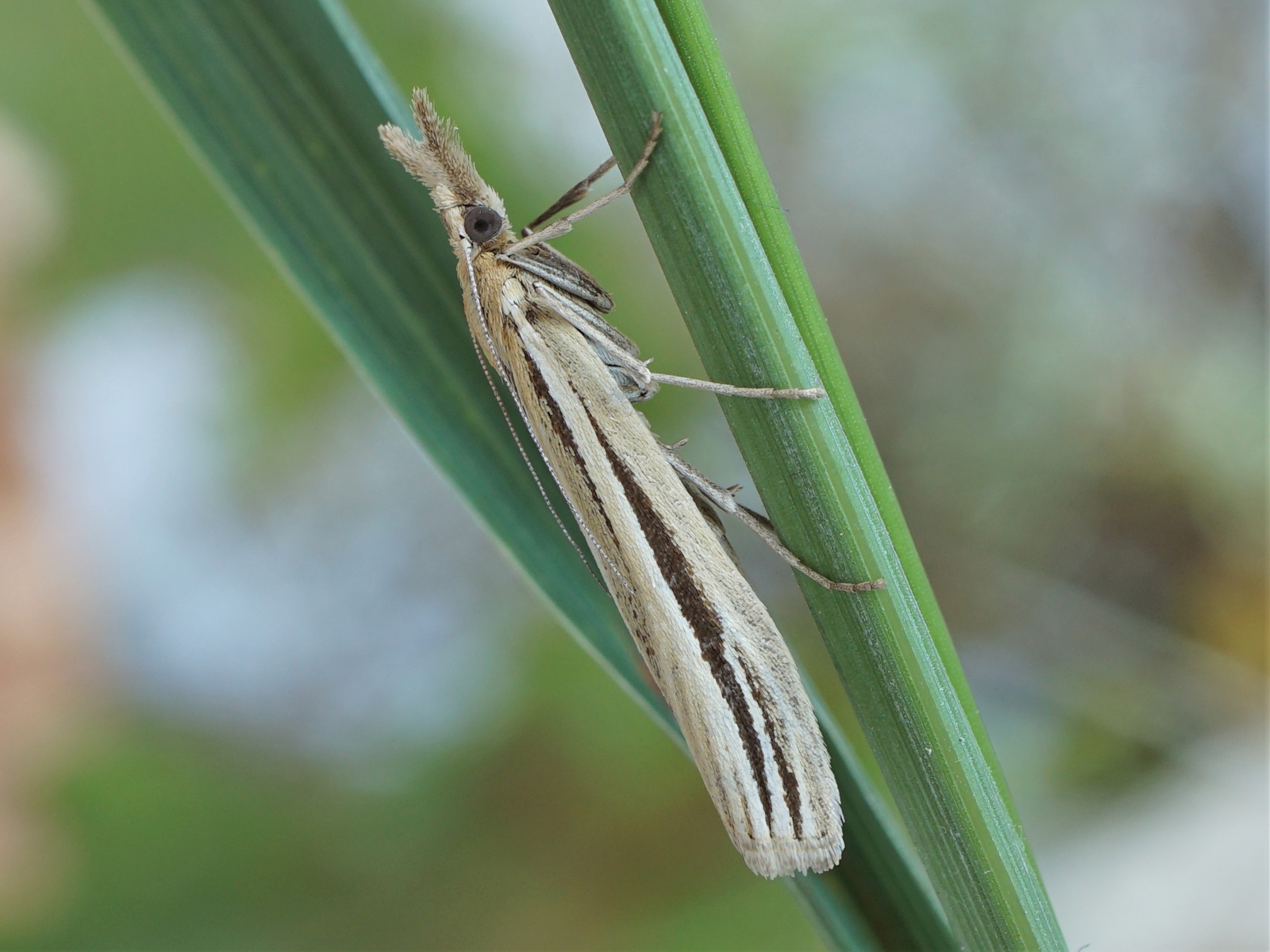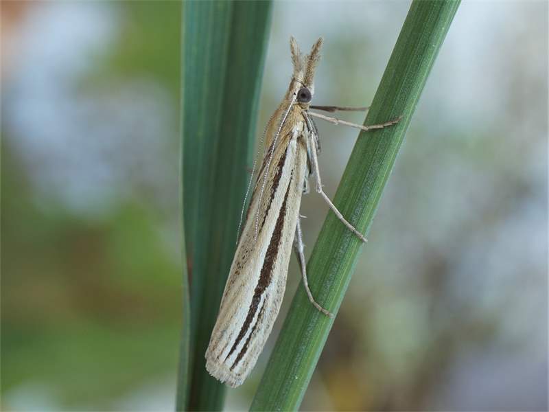 Vorderflügel X–Y mm lang; hellbraun; median ein cremefarbener Längsstreifen über die gesamte Flügellänge; Medianstreifen vorn von etwa 1/3 bis Flügelaußenrand mit dunkelbraunem Streifen gesäumt, der sich distal der Diskalzelle gabelt; Medianstreifen hinten von der Basis bis etwa 1/3 dunkelbraun gesäumt.