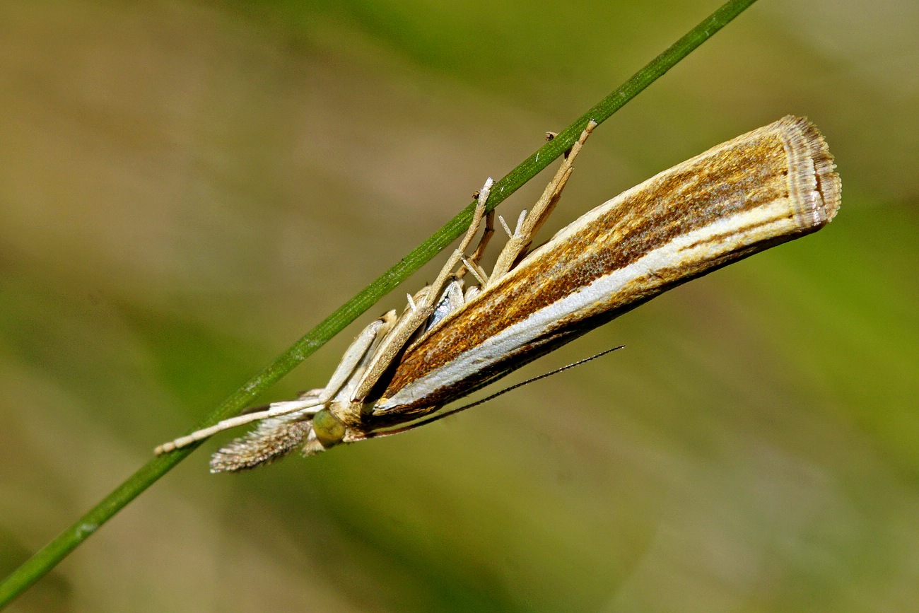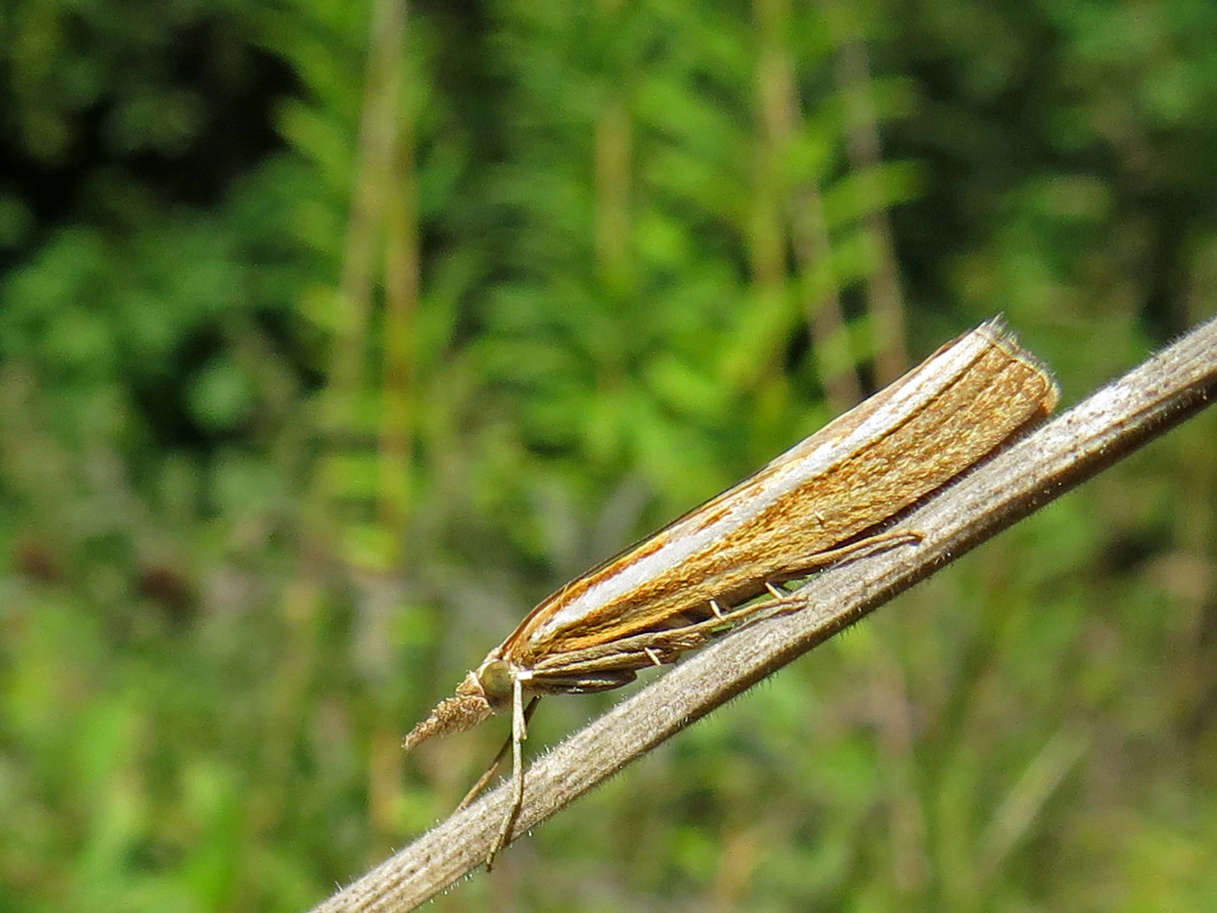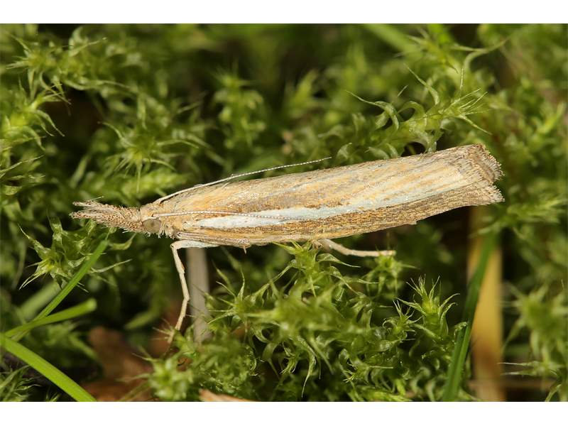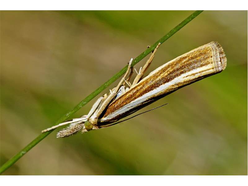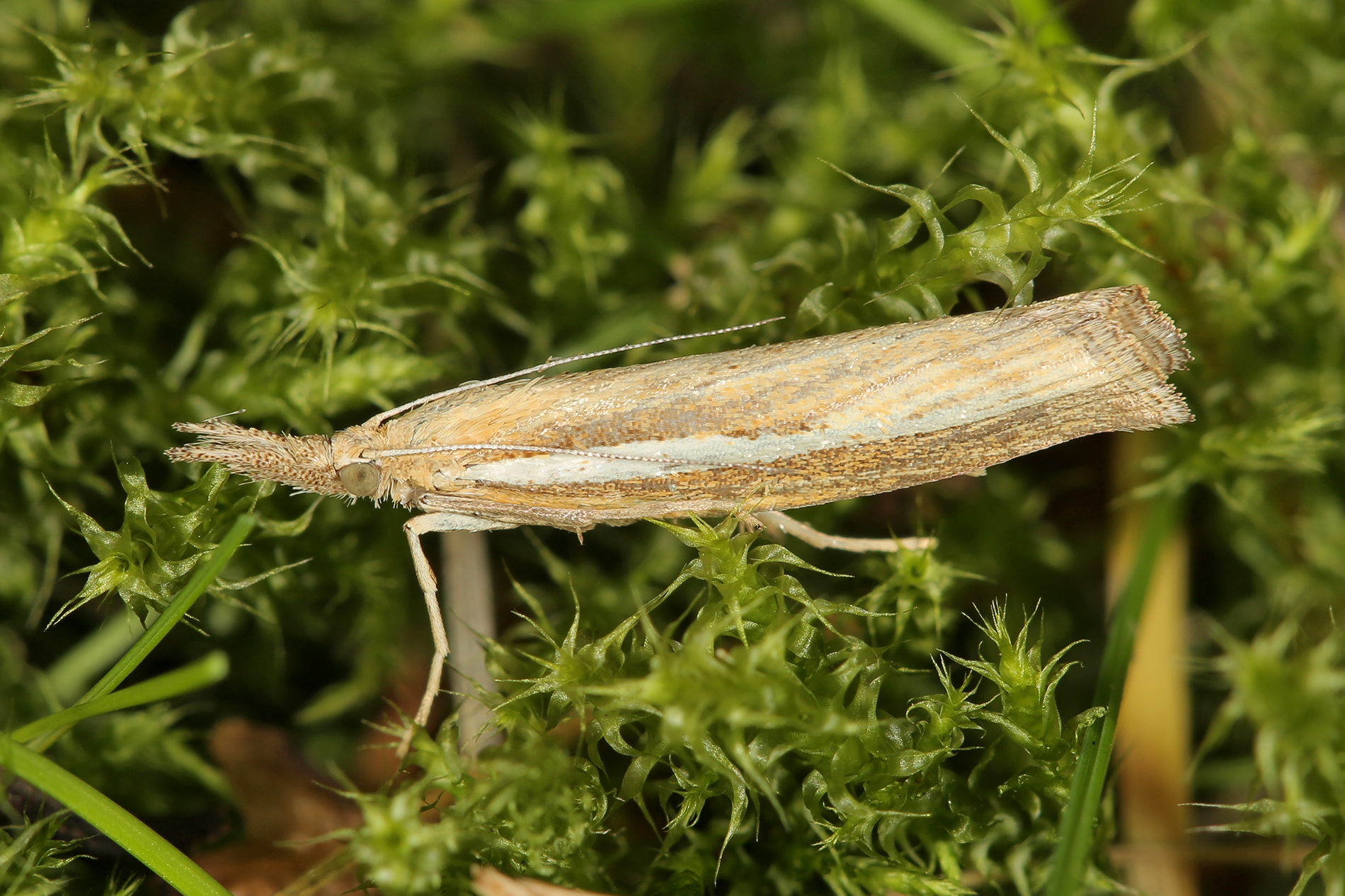 Ähnliche Arten: Bei Agriphila selasella ist der weiße Medianstreifen am Vorderrand braun begrenzt und die Stirn ist rund gewölbt. Agriphila latistria, deren weißer medianer Längsstreifen breiter ist, bis zum Flügelaußenrand reicht und sich kaum distal verjüngt. Agriphila poliellus, die einen baunen Costalstreifen und meistens einen schwarzbraunen Diskalfleck besitzt. Pediasia luteella ist sehr ähnlich, besitzt jedoch oberseits schmutzig weiß oder hellbraun beschuppte Antennen.
