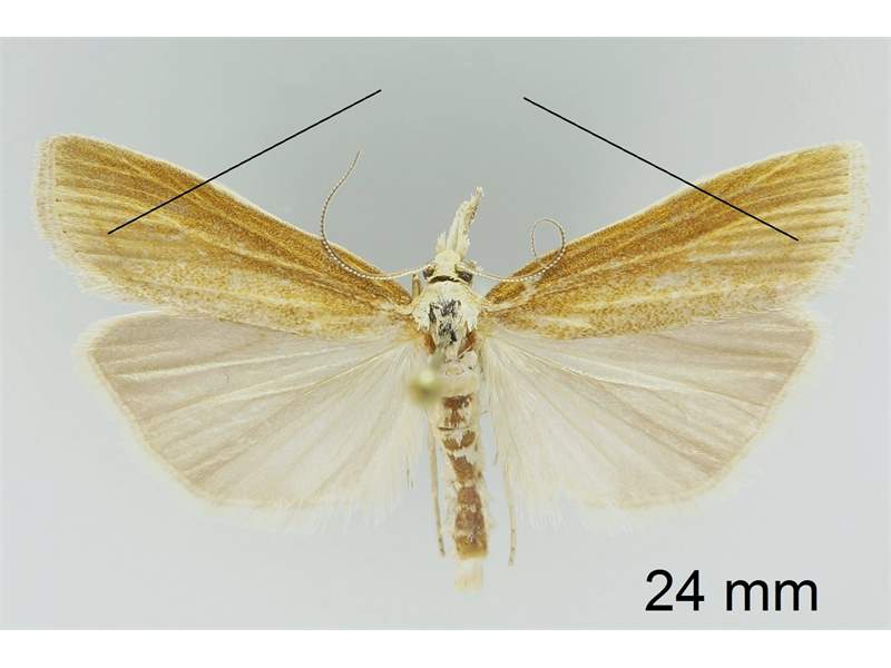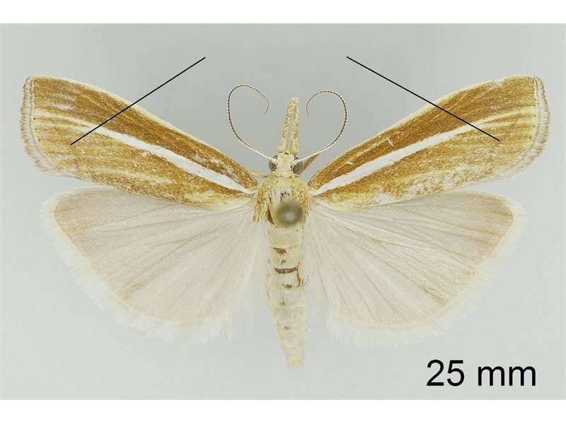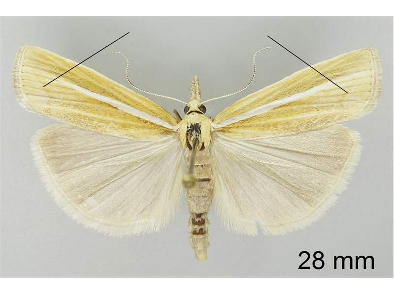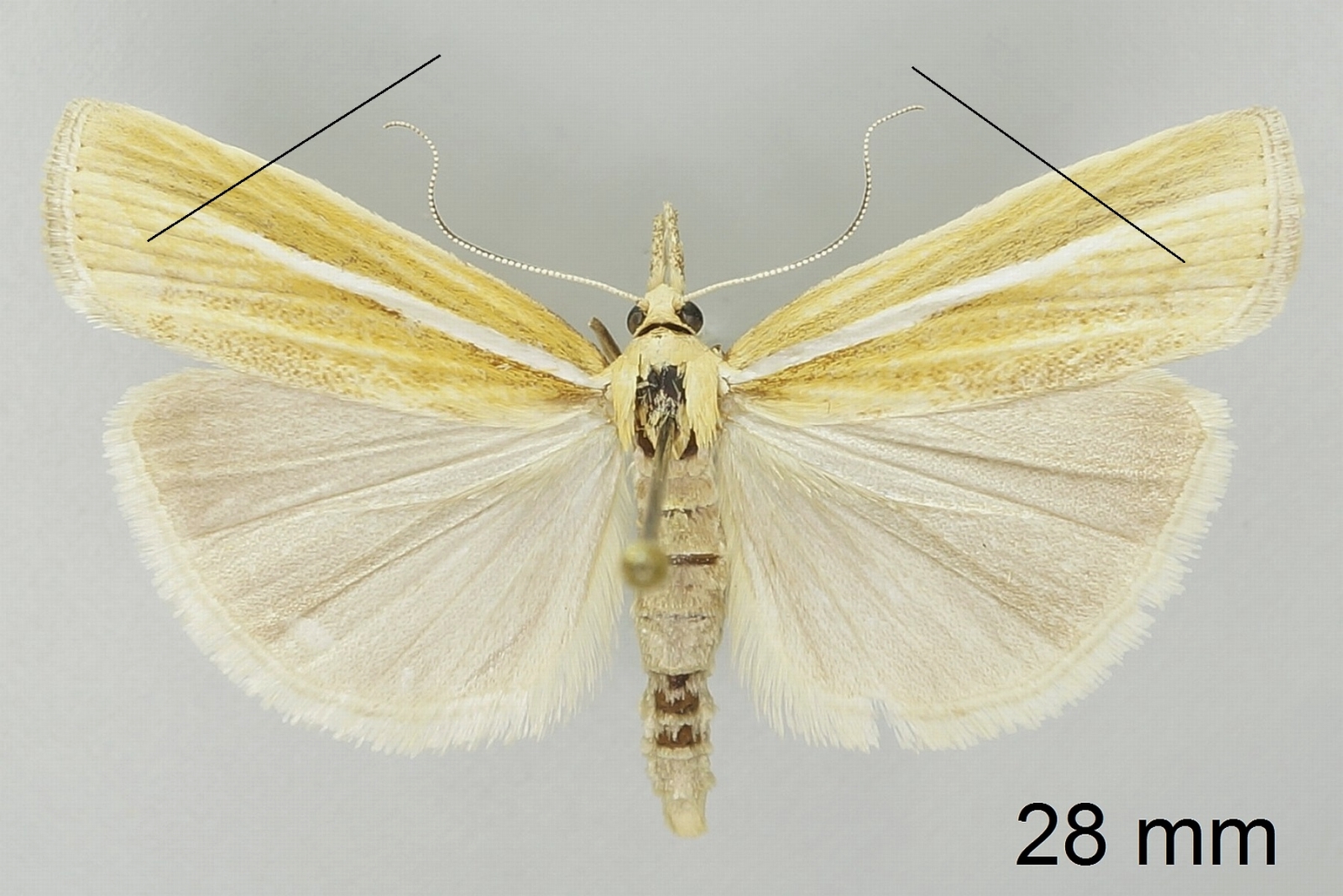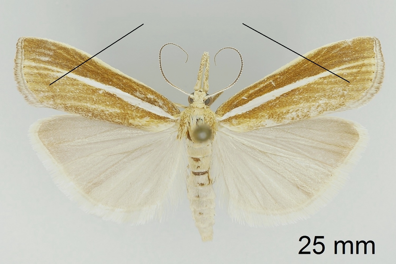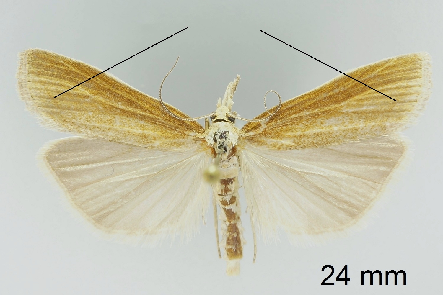 Vorderflügel X–Y mm lang; variabel von hell gelbbraun über rotbraun bis dunkelbraun; von der Basis bis etwa 2/3 (manchmal auch bis zum Flügelaußenrand reichender) weißer, sich distal verjüngender medianer Längsstreifen, der jedoch auch völlig fehlen kann. Manche Individuen mit undeutlicher äußerer Querlinie. Antennen oberseits perlweiß beschuppt.
