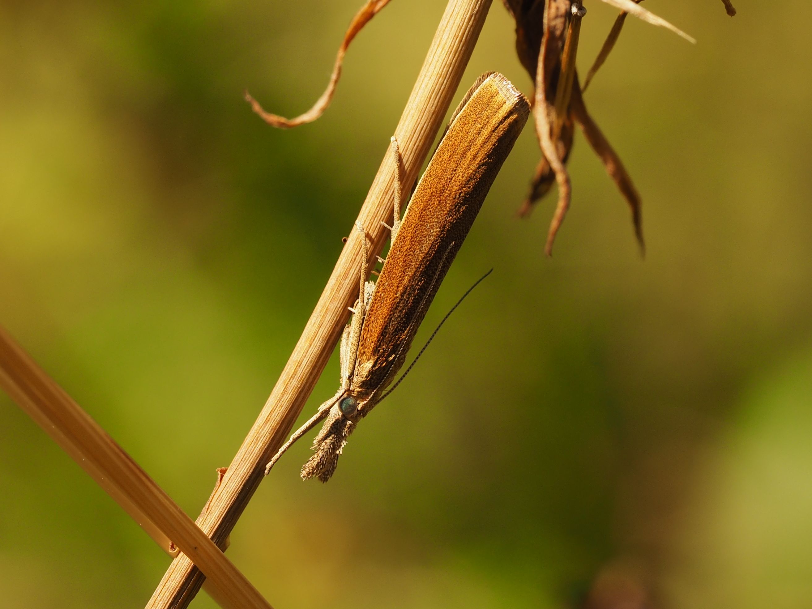 Thorax braun wie Flügel. Kopf und Palpen mit leichtem Graueinschlag. Palpen nach vorn gestreckt und etwa doppelt so lang wie der Kopf. Stirn ohne kegelförmige Spitze (vgl. Agriphila selasella).