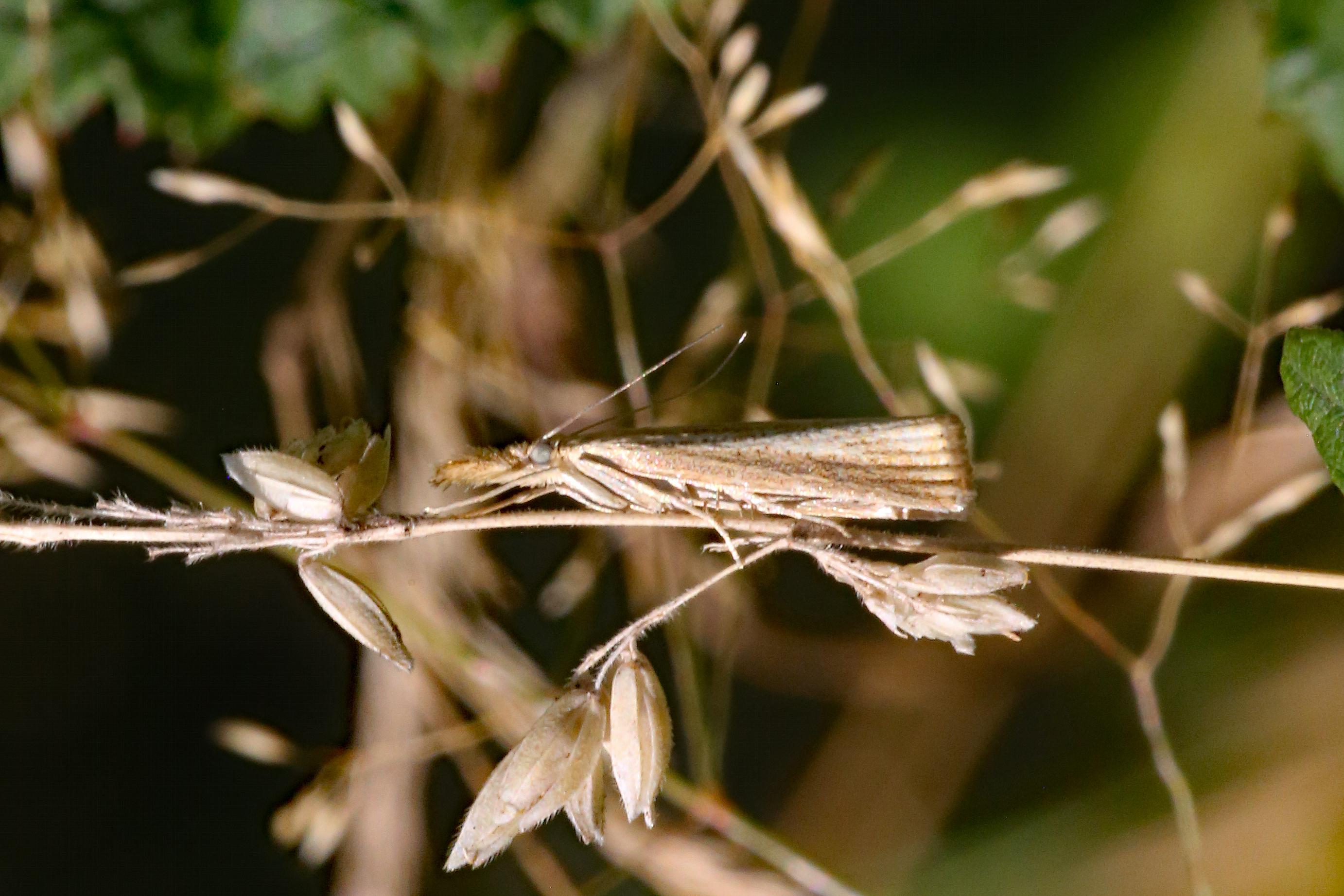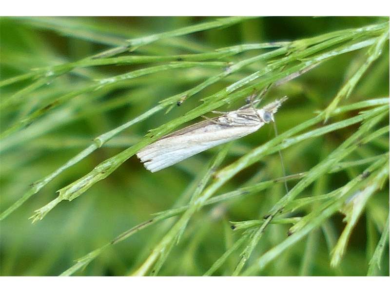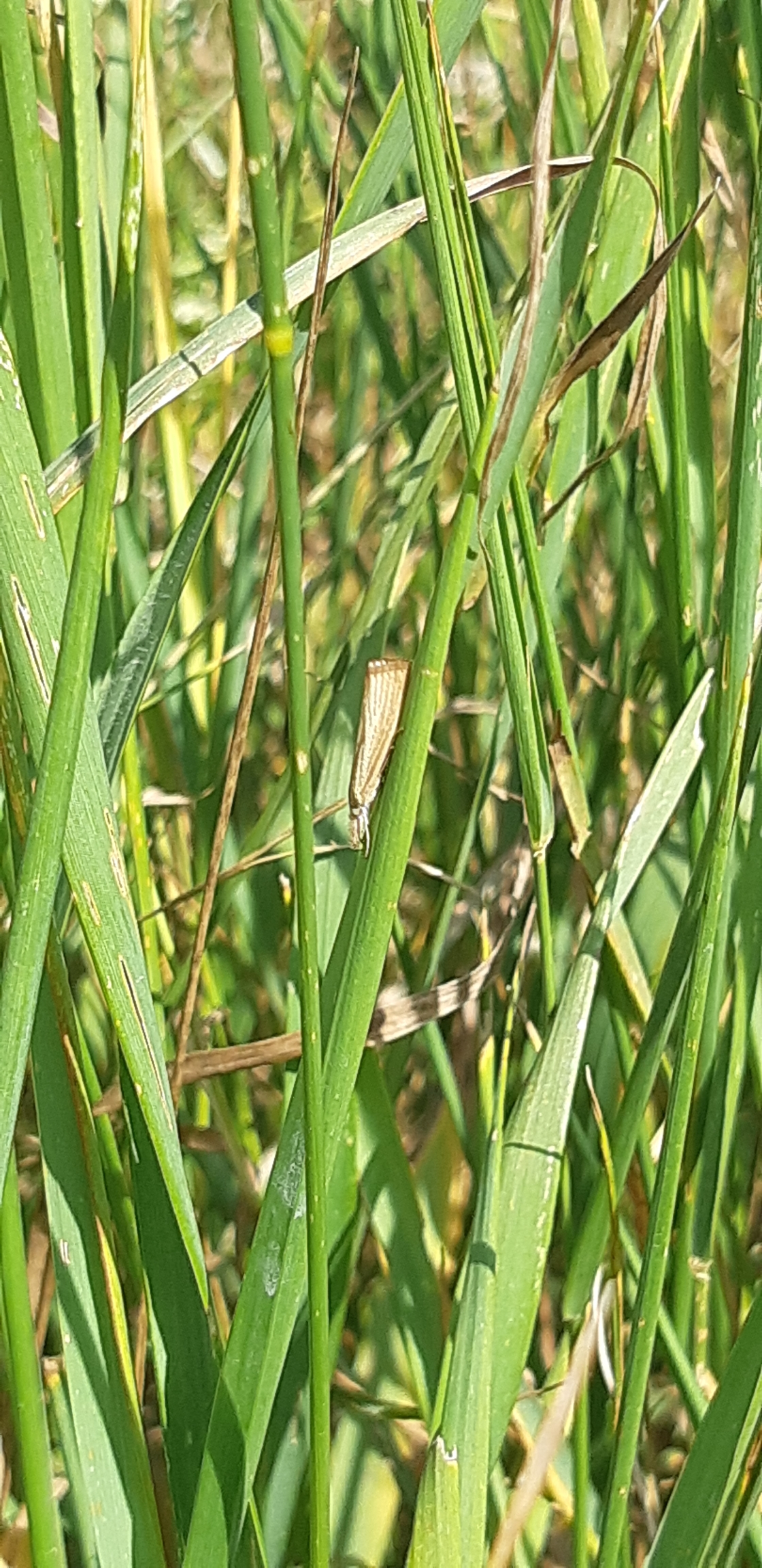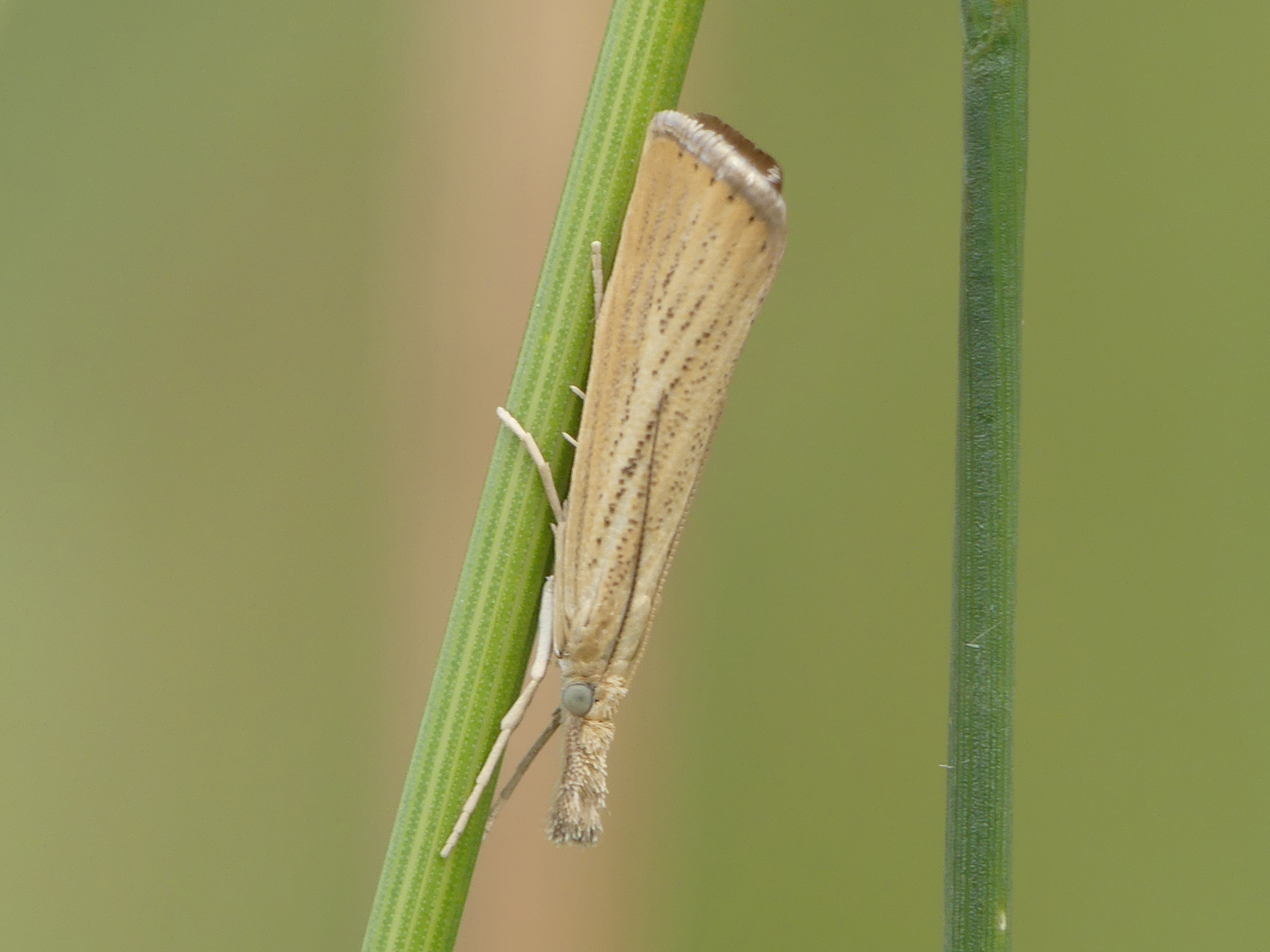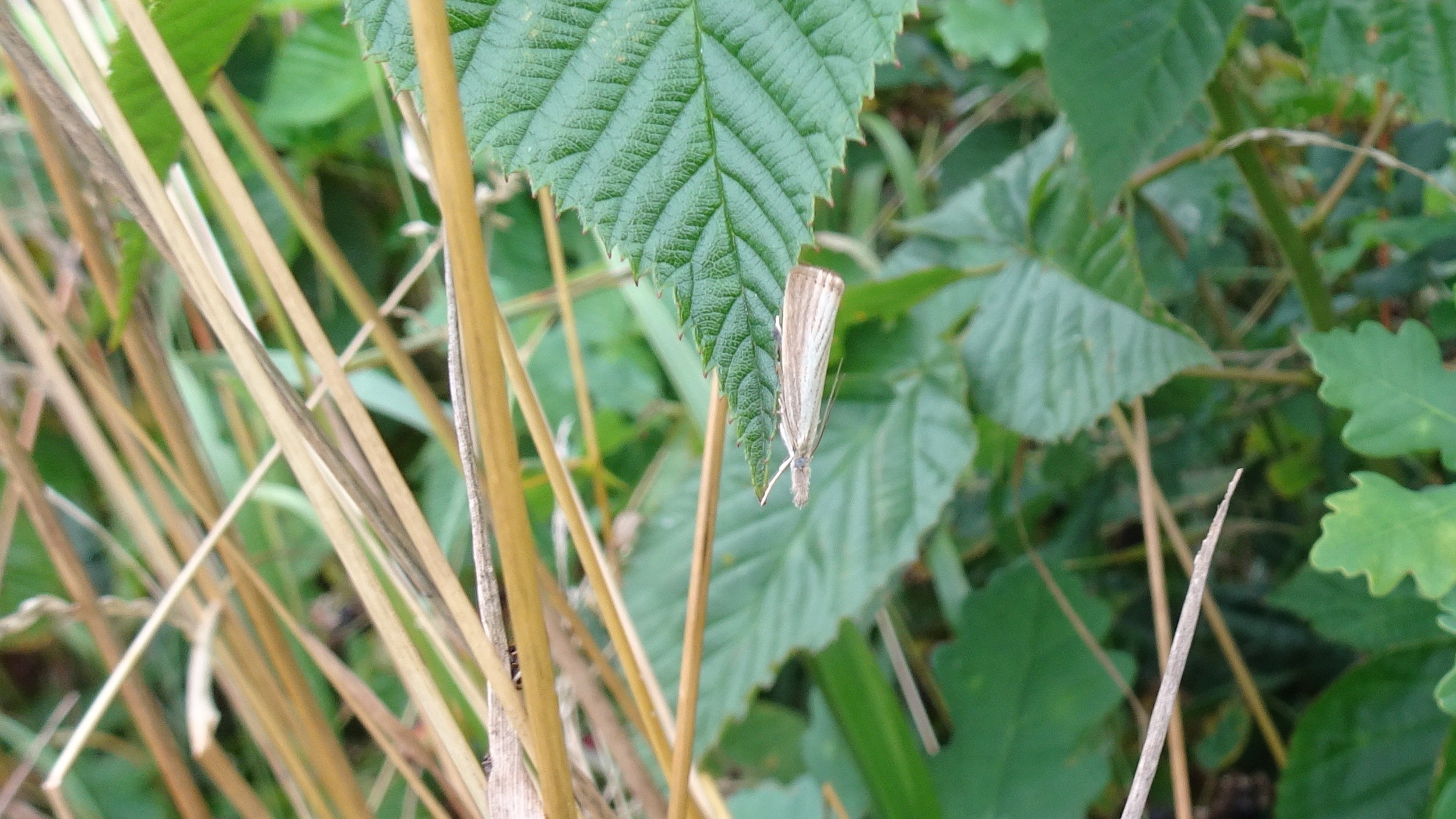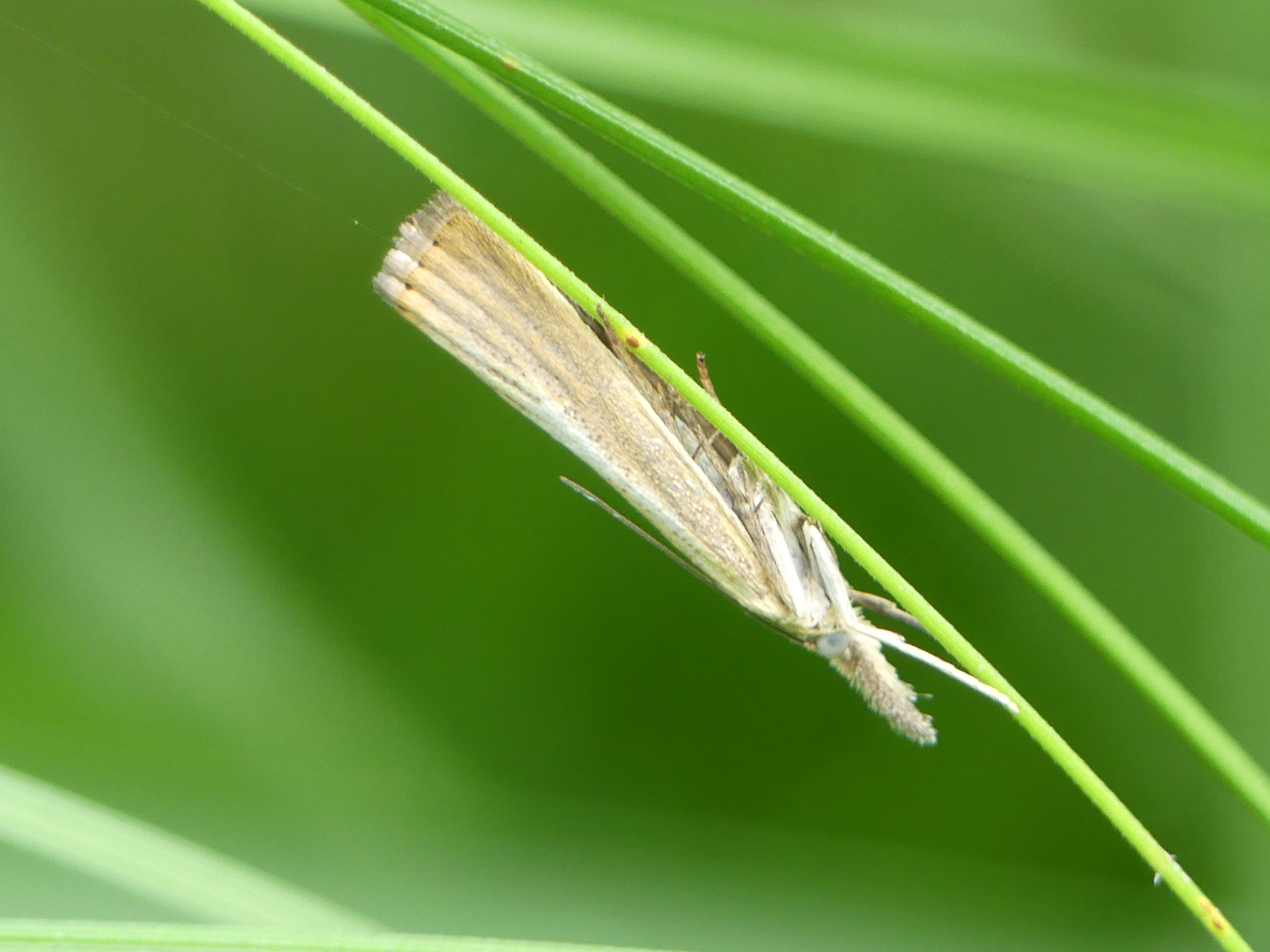 Agriphila straminella (Denis & Schiffermüller, 1775), bei Scheibenberg, auf Schilfblatt, 01.08.2018