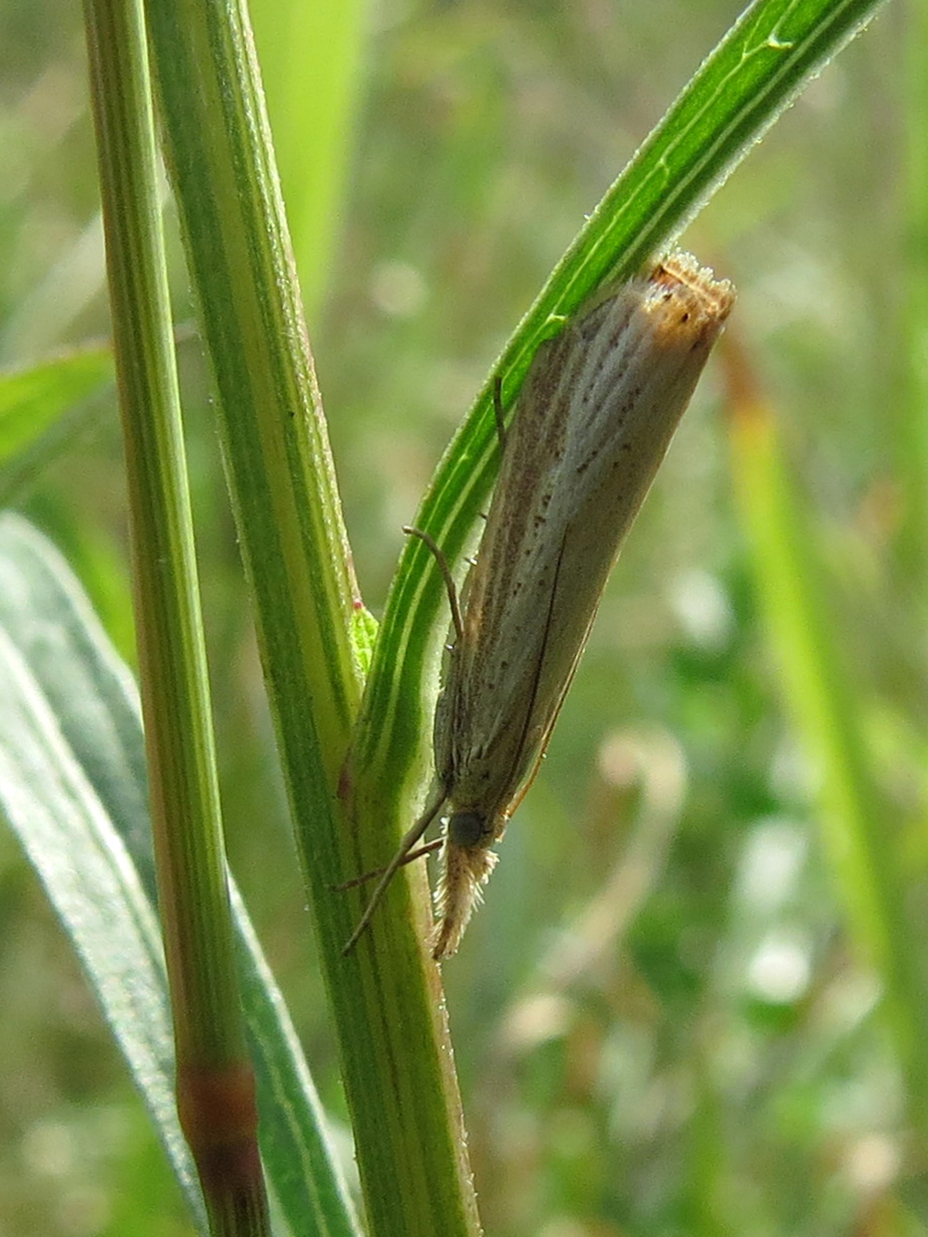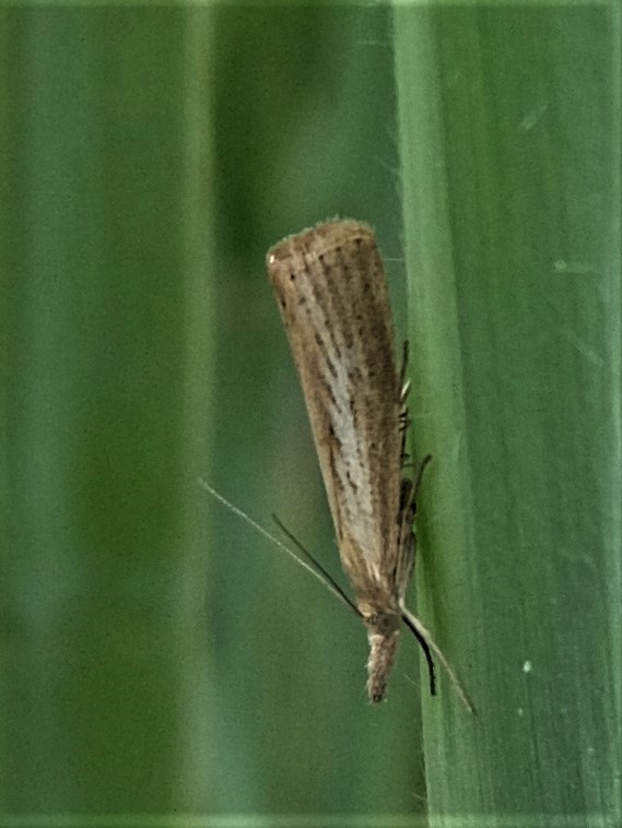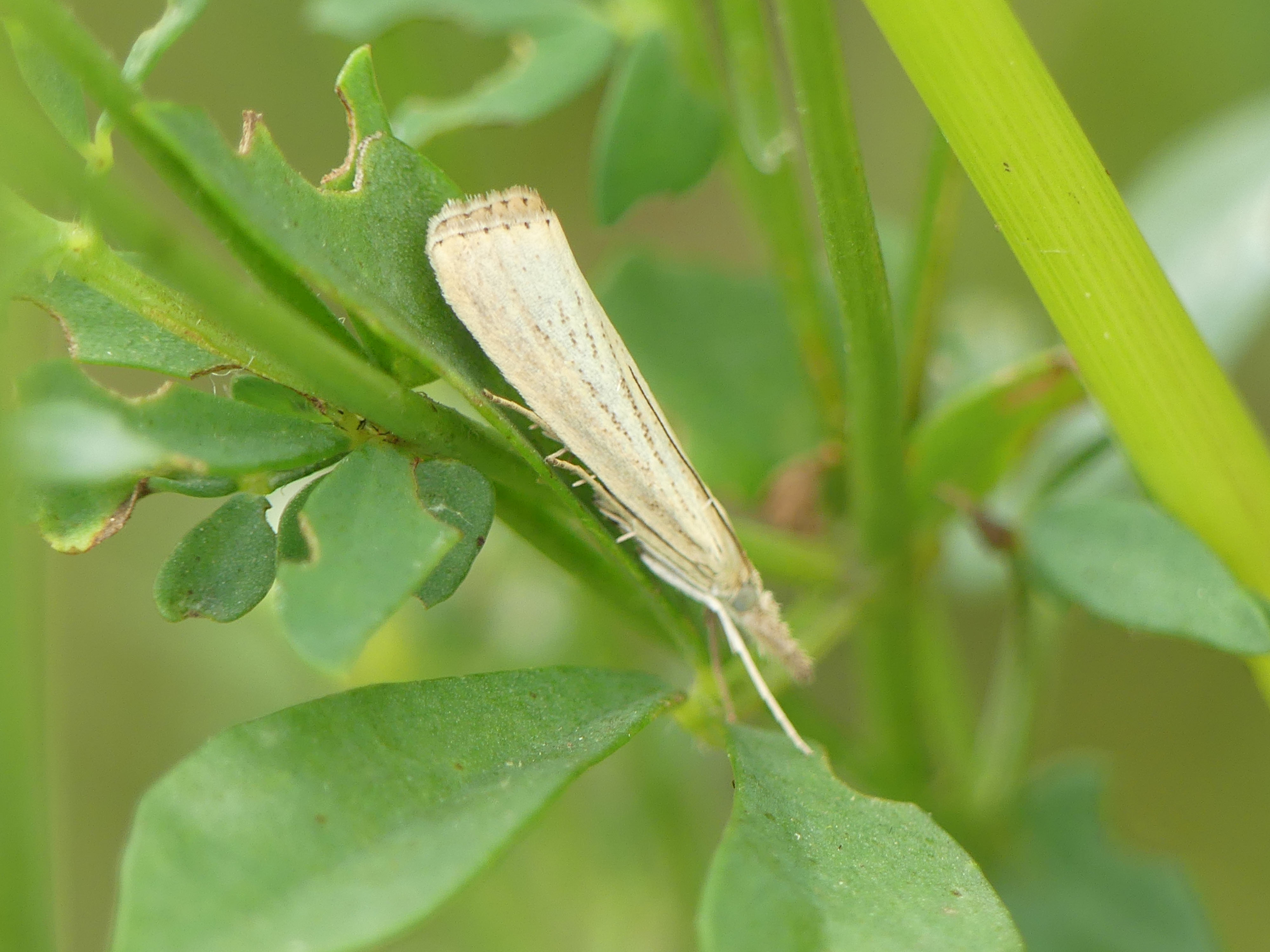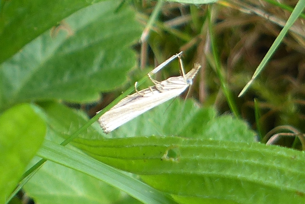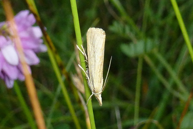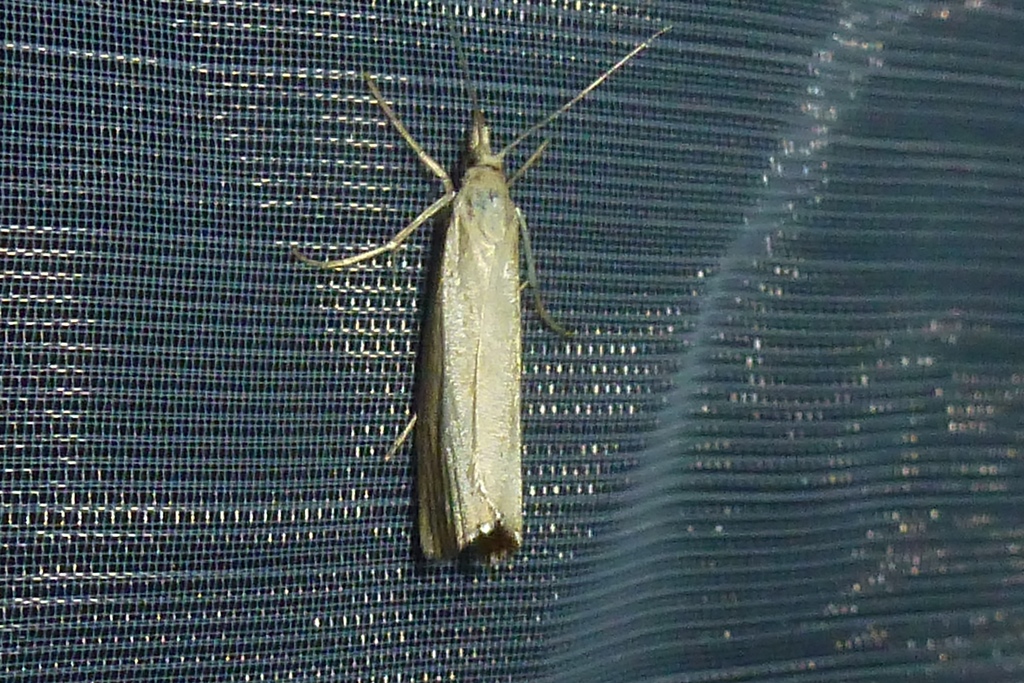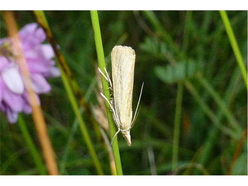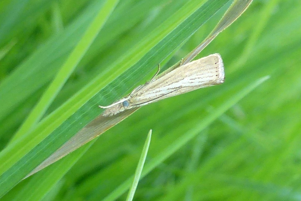 Agriphila straminella (Denis & Schiffermüller, 1775), bei Scheibenberg, auf Schilfblatt, 01.08.2018