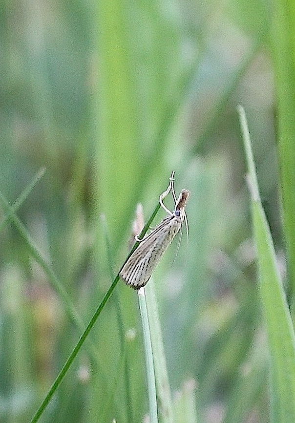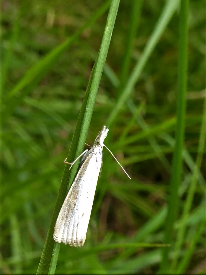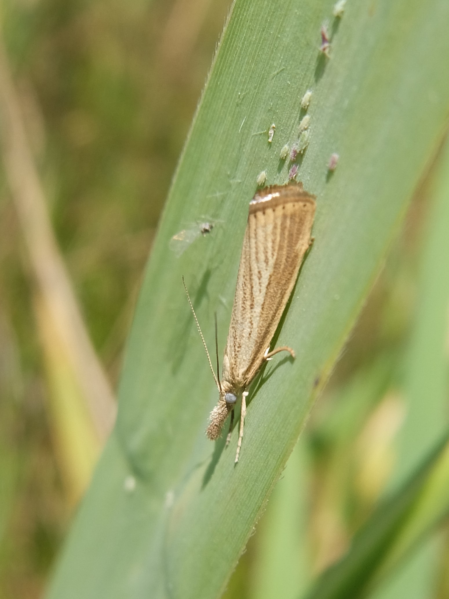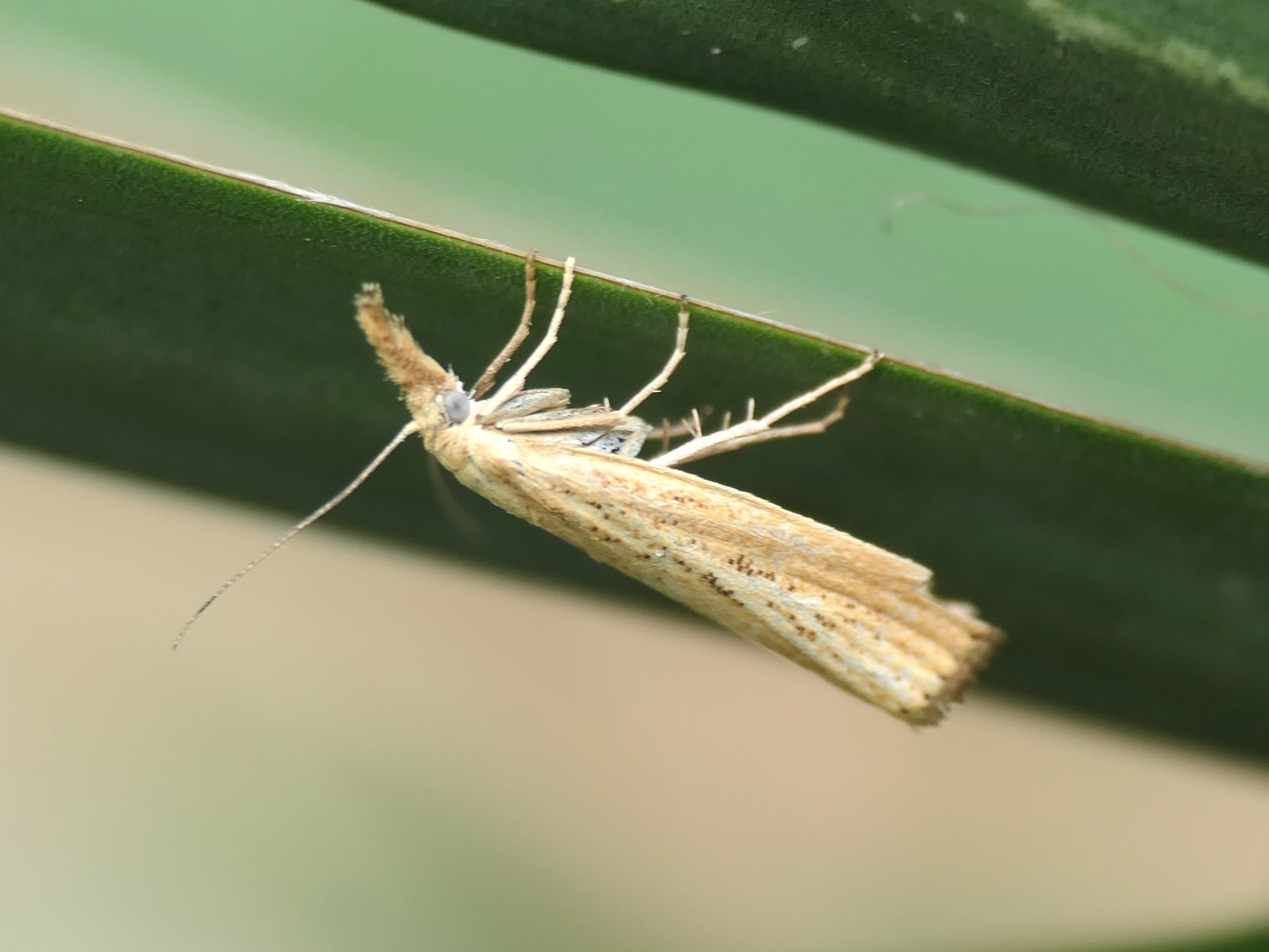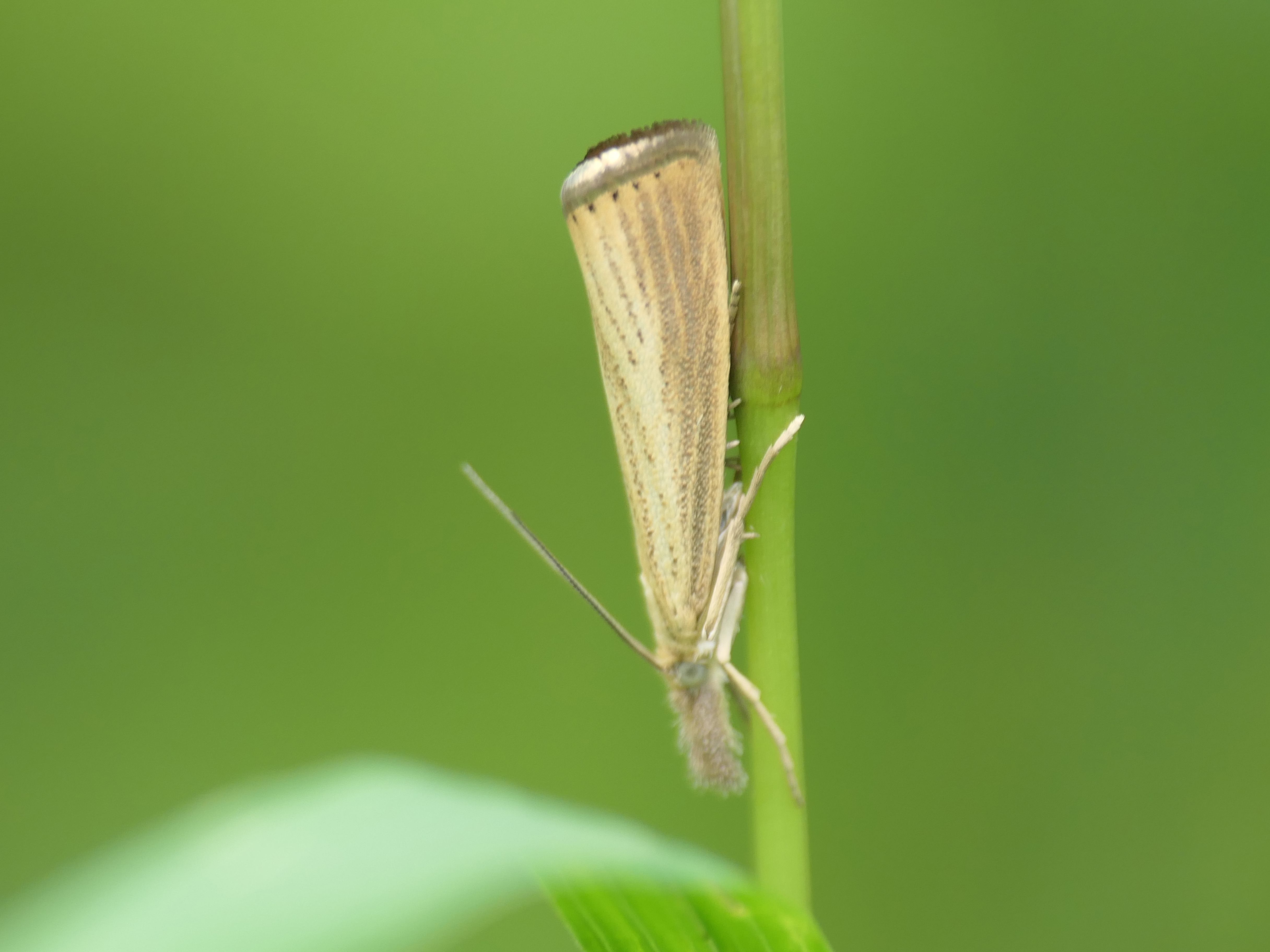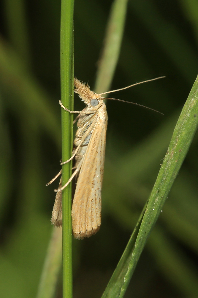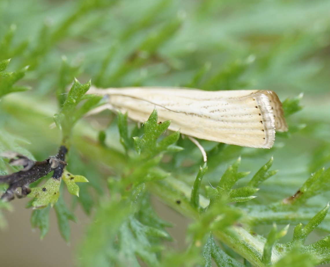 Agriphila straminella (Denis & Schiffermüller, 1775), bei Scheibenberg, auf Schilfblatt, 01.08.2018