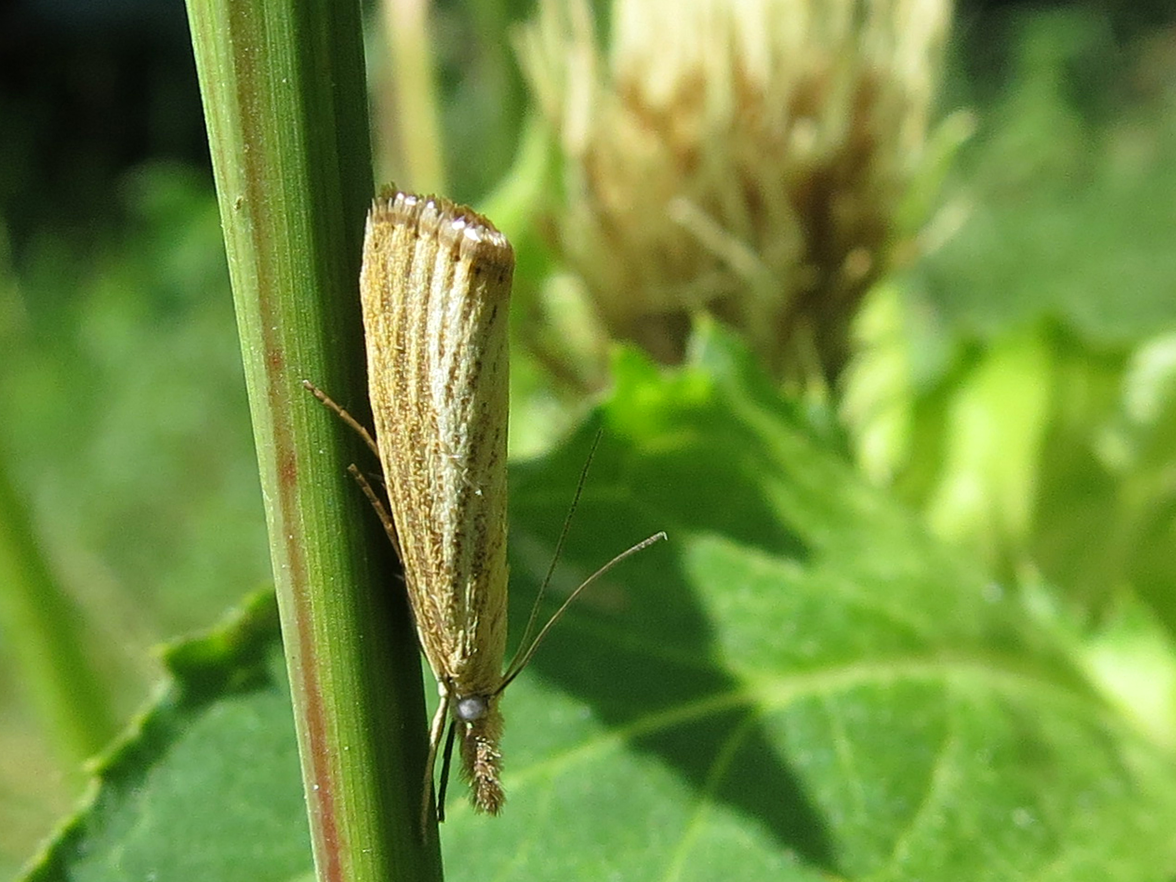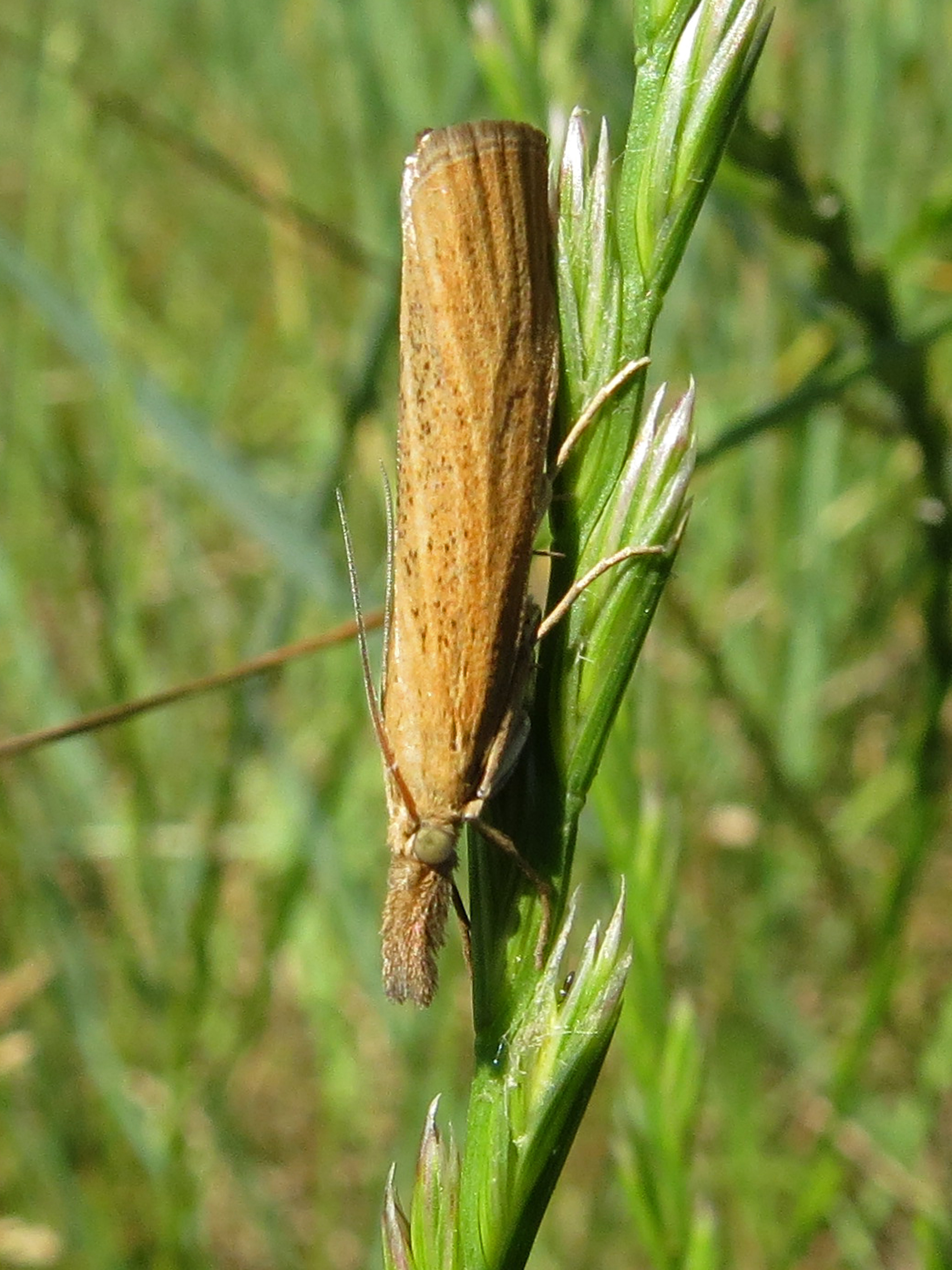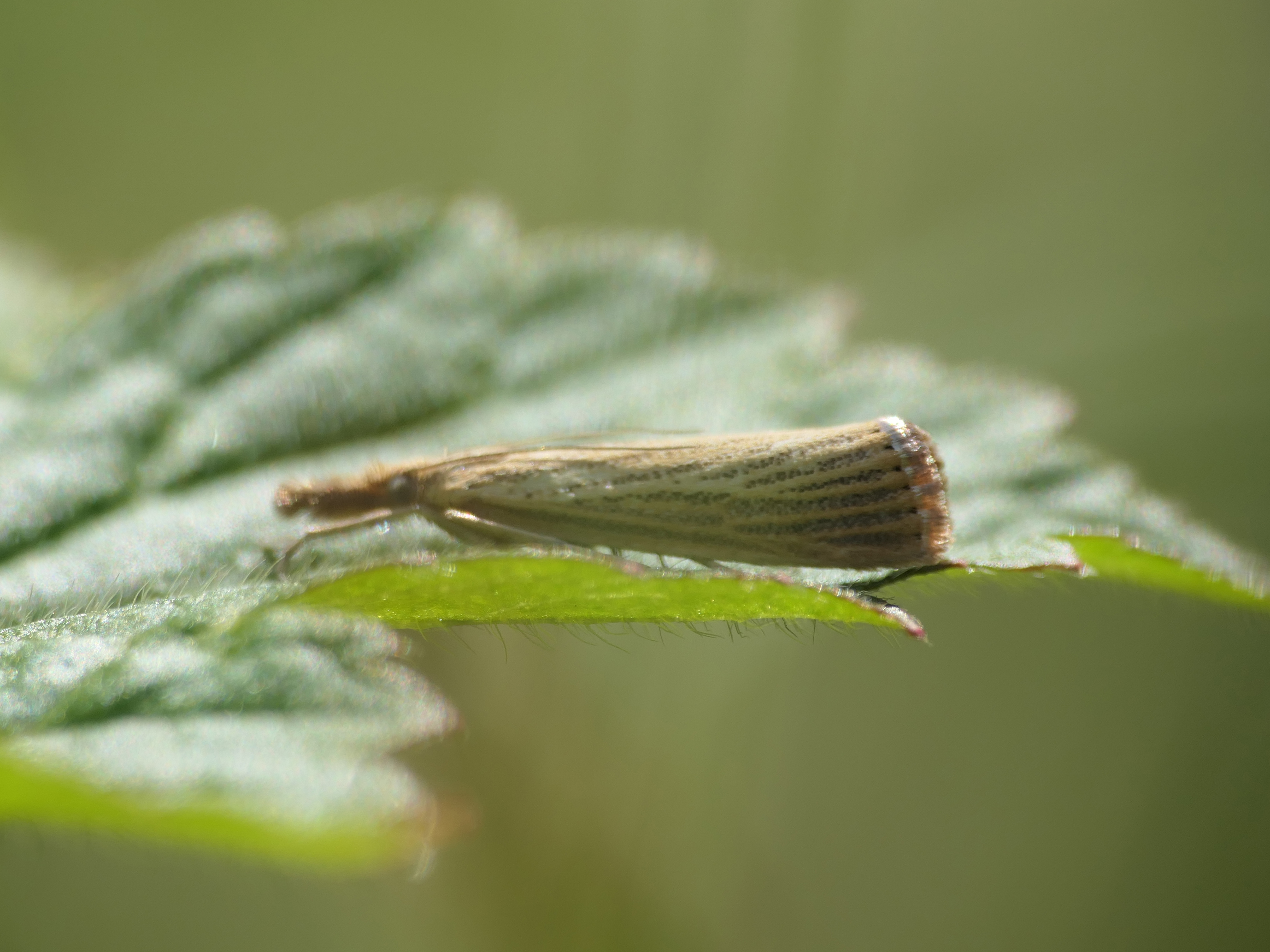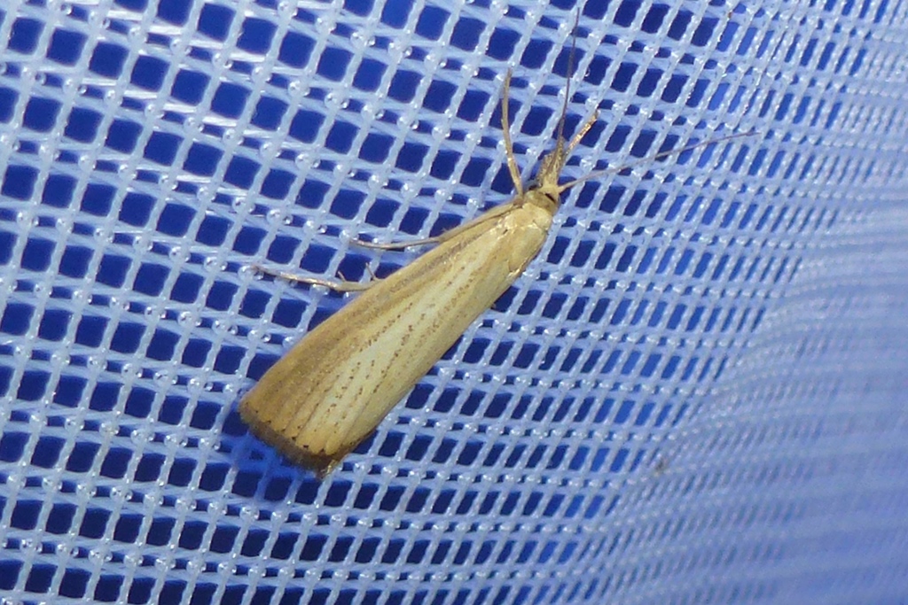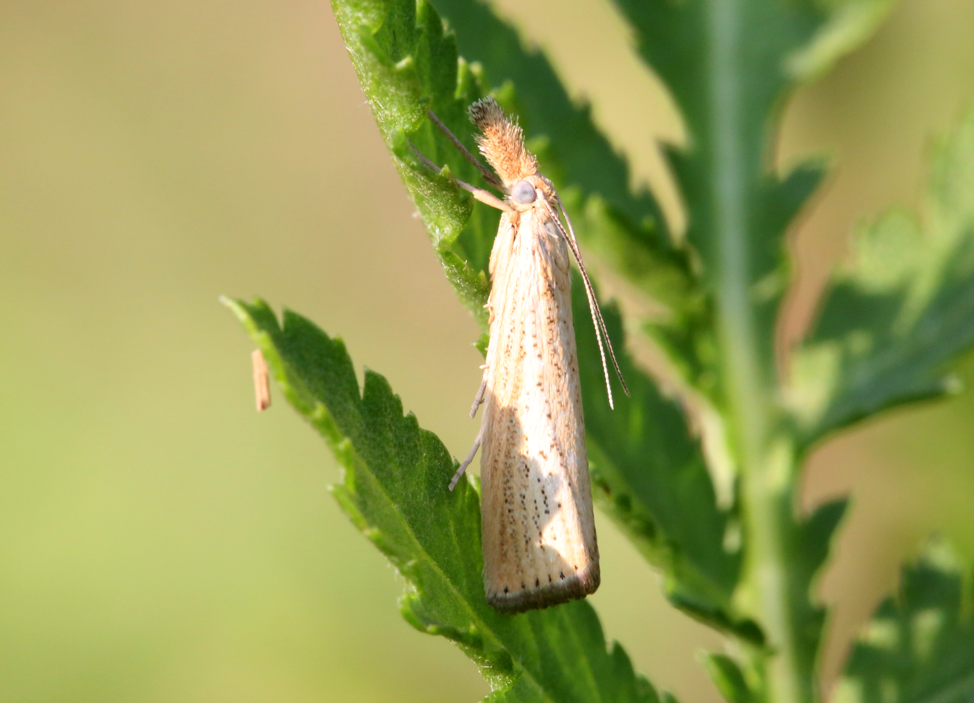 Agriphila straminella (Denis & Schiffermüller, 1775), bei Scheibenberg, auf Schilfblatt, 01.08.2018
