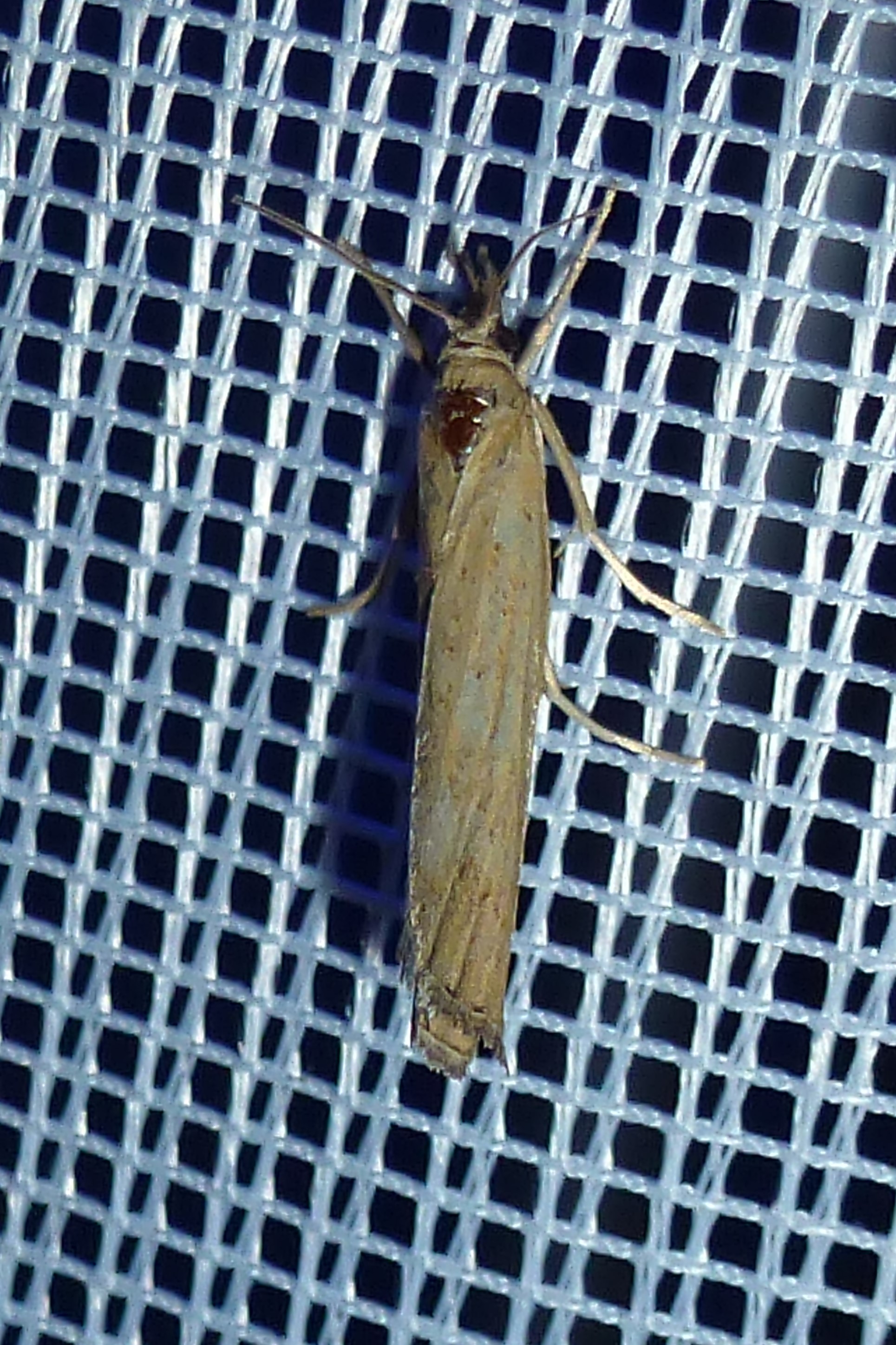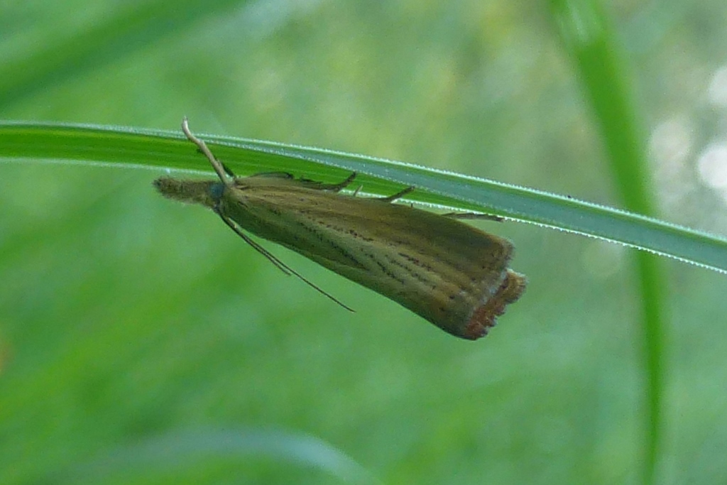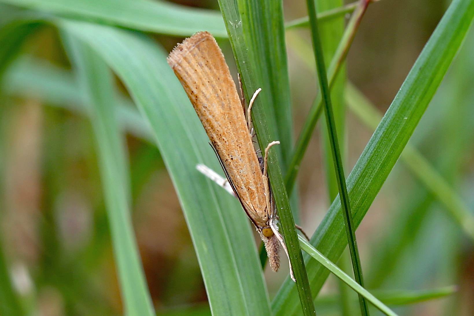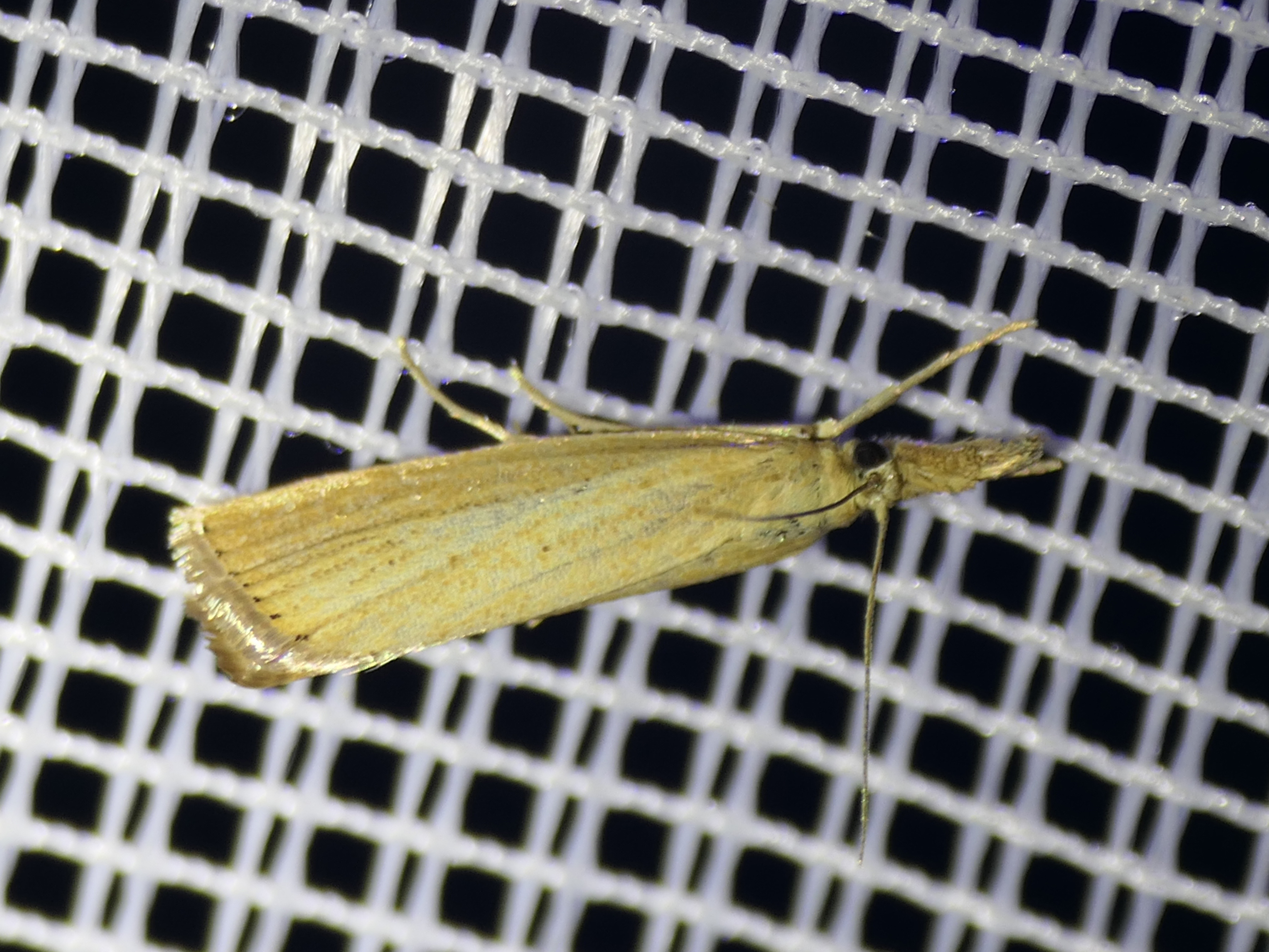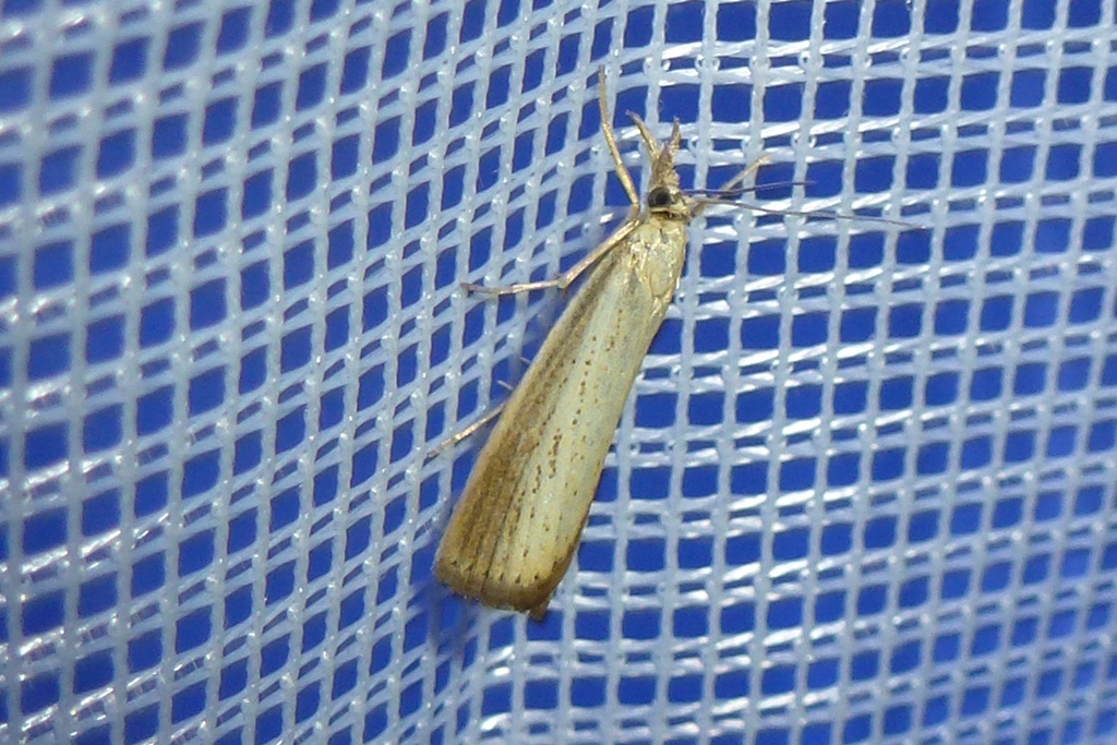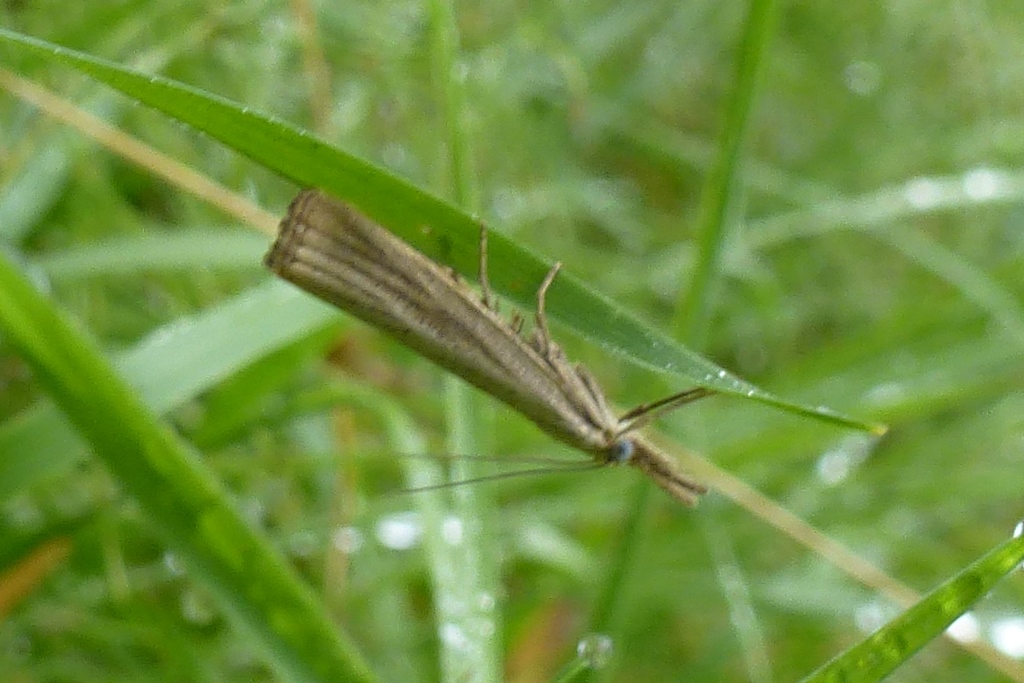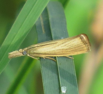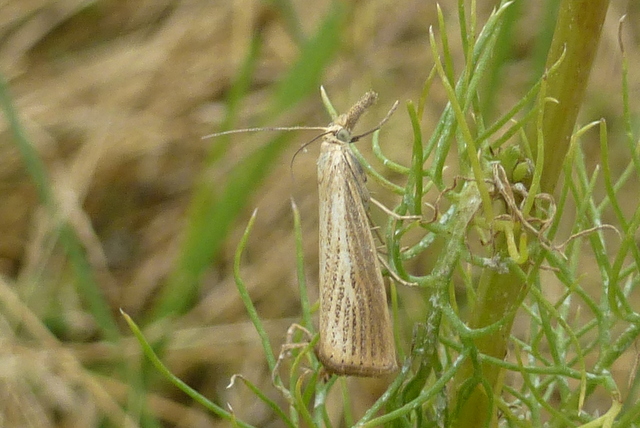 Agriphila straminella (Denis & Schiffermüller, 1775), bei Scheibenberg, auf Schilfblatt, 01.08.2018