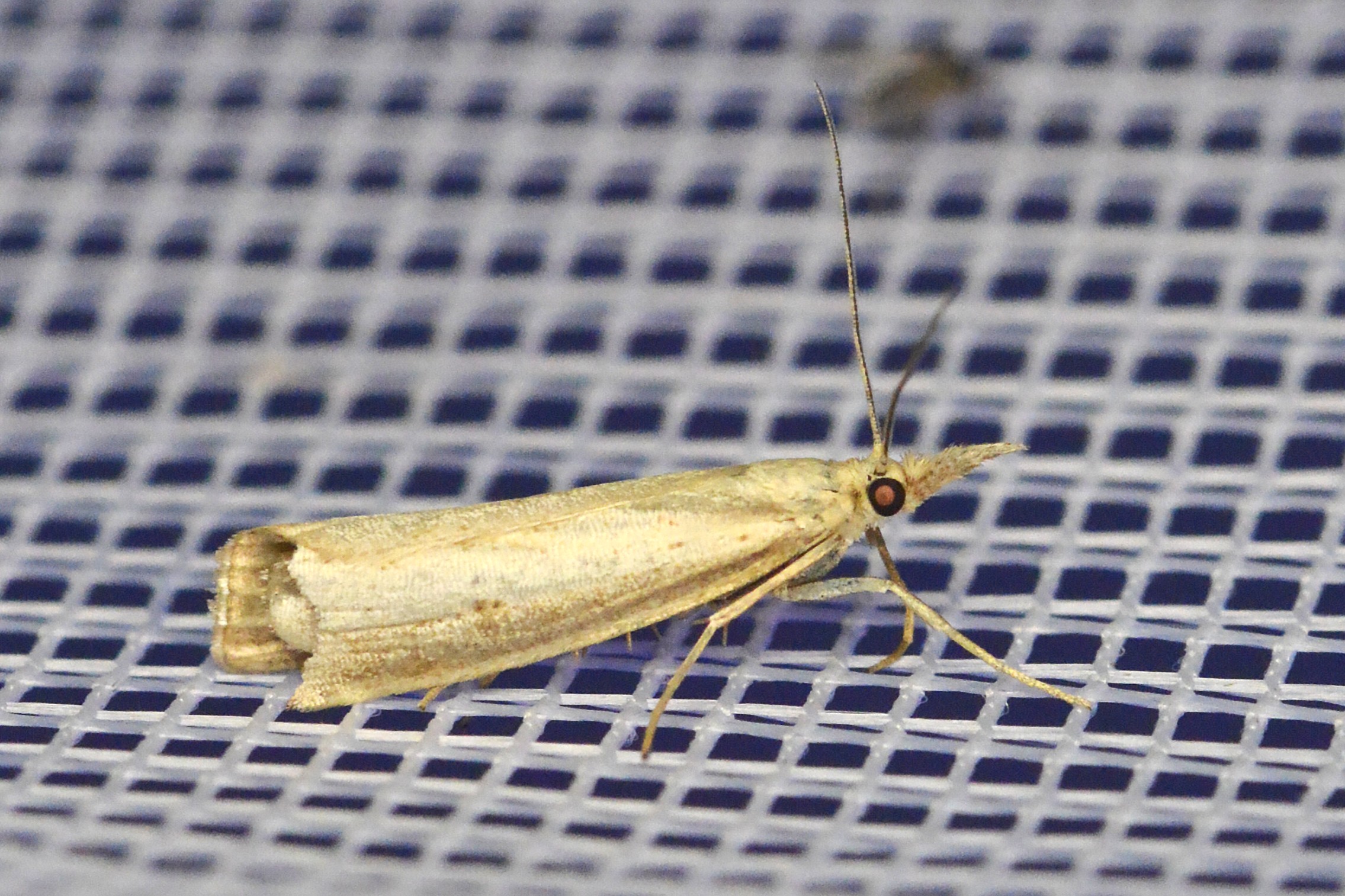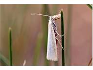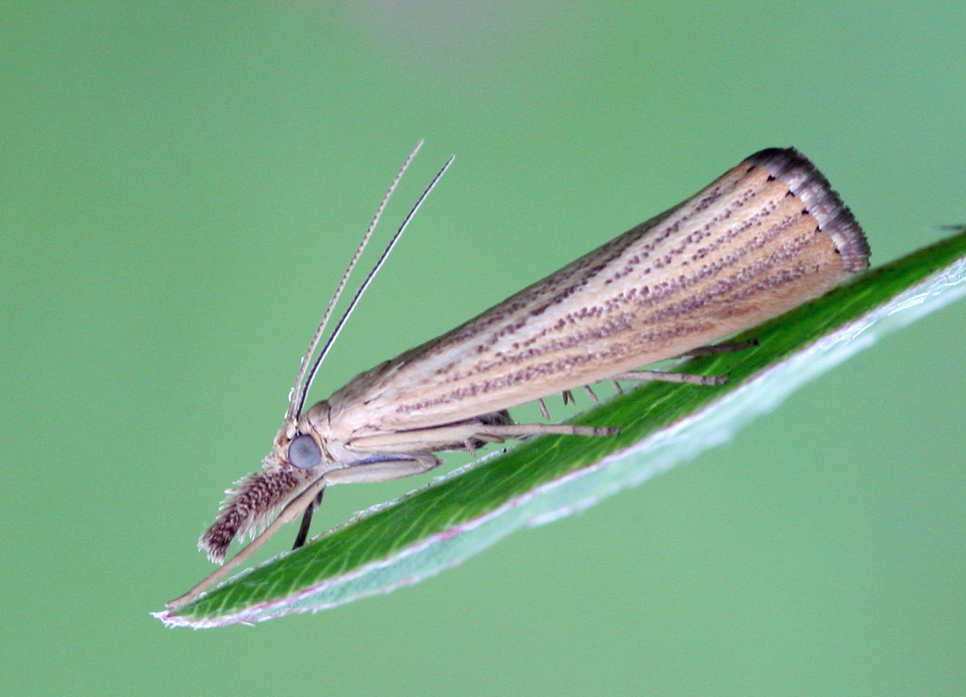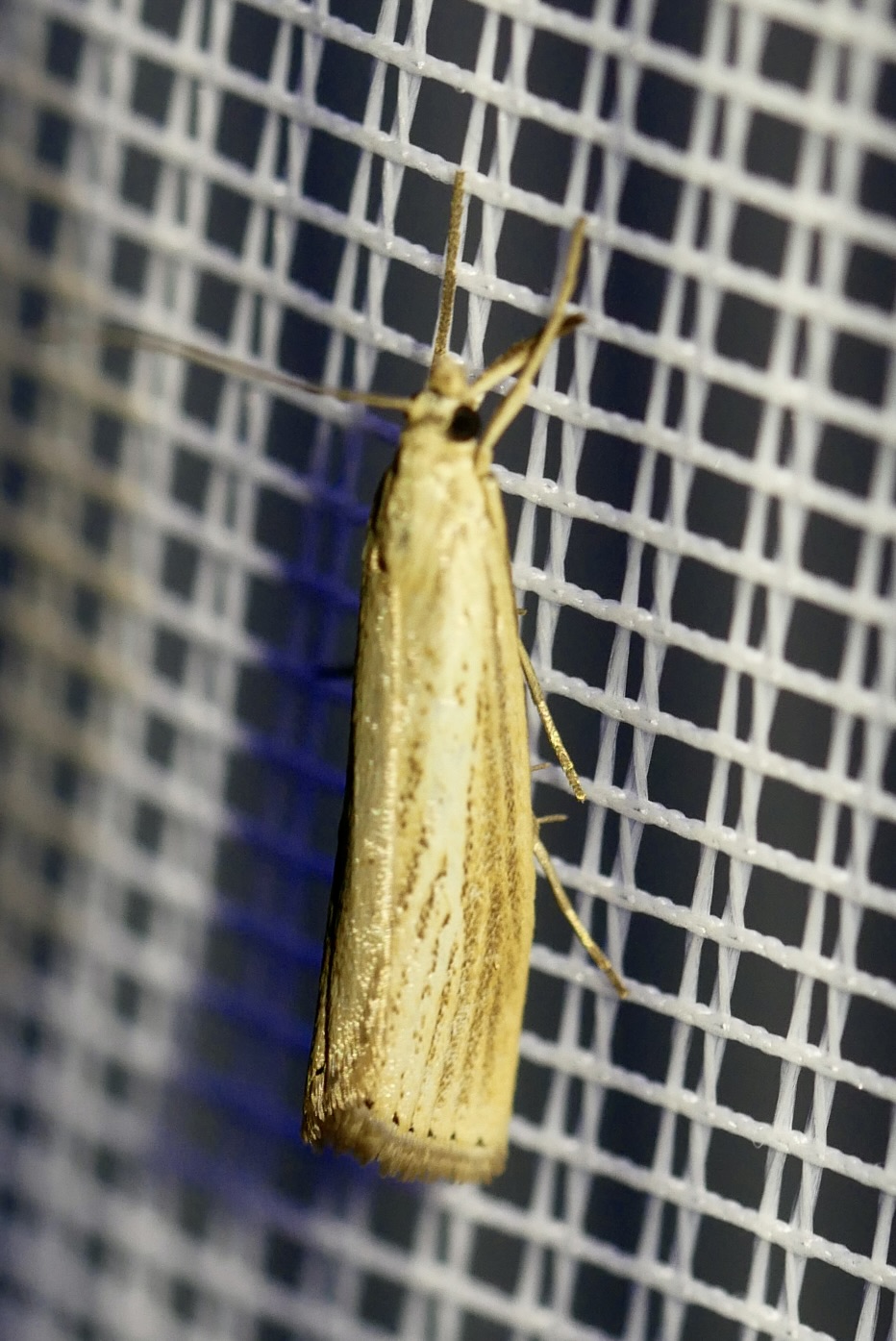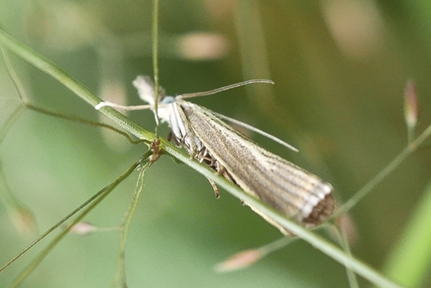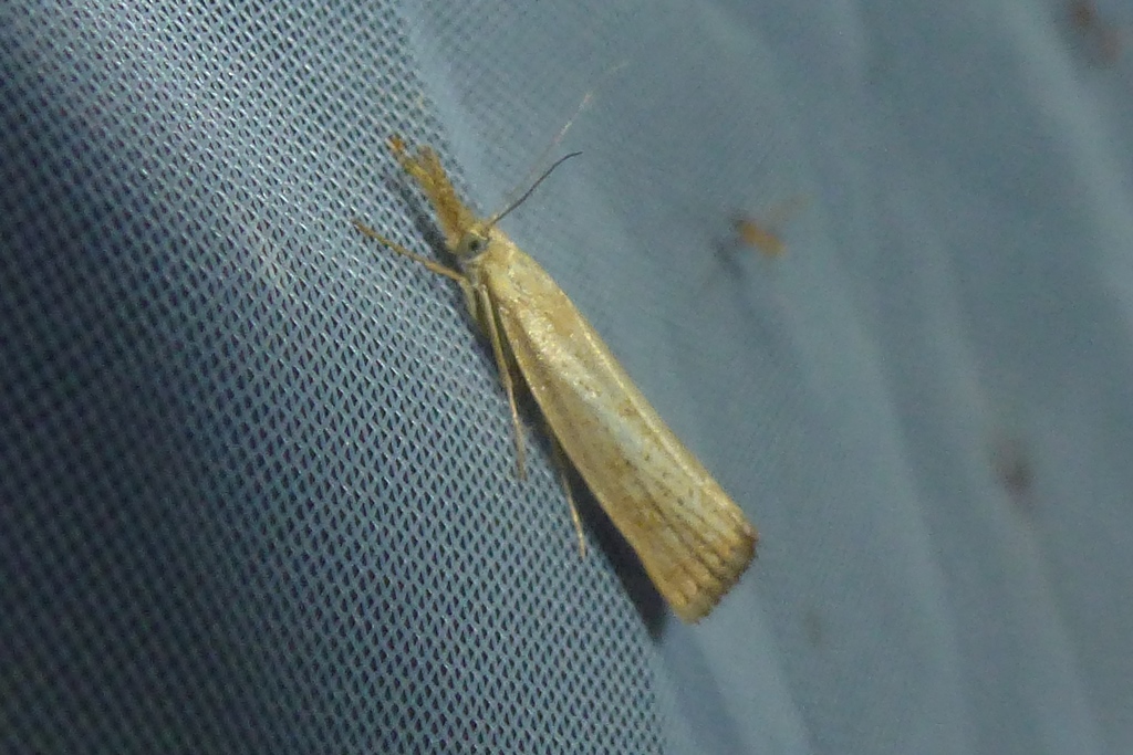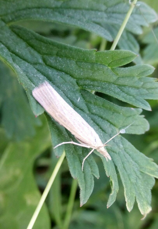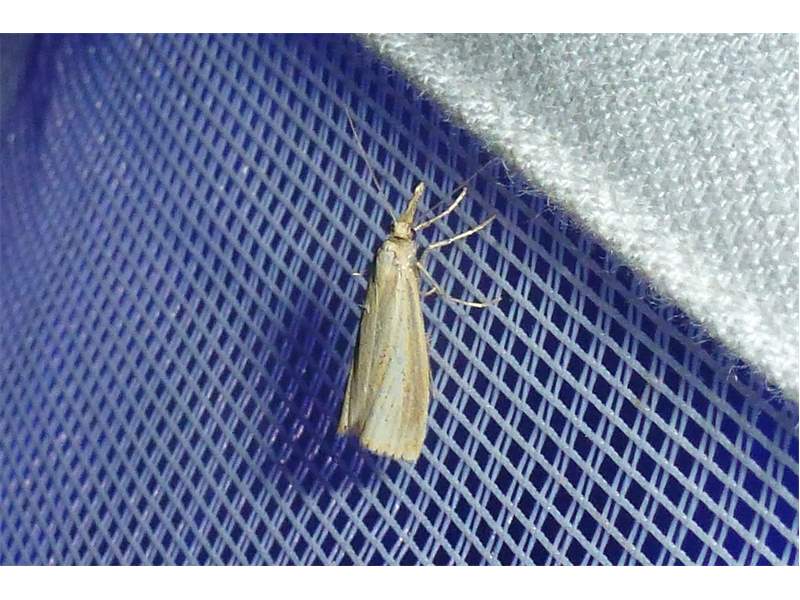 Agriphila straminella (Denis & Schiffermüller, 1775), bei Scheibenberg, auf Schilfblatt, 01.08.2018