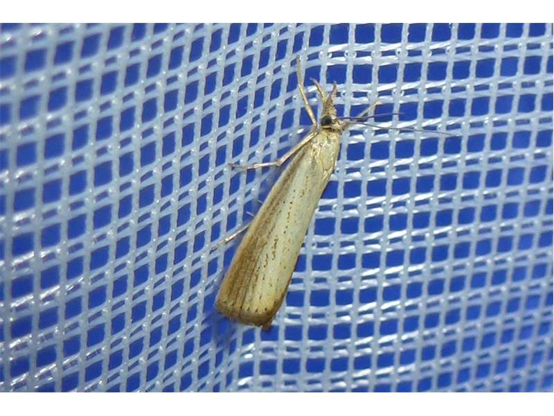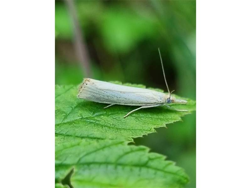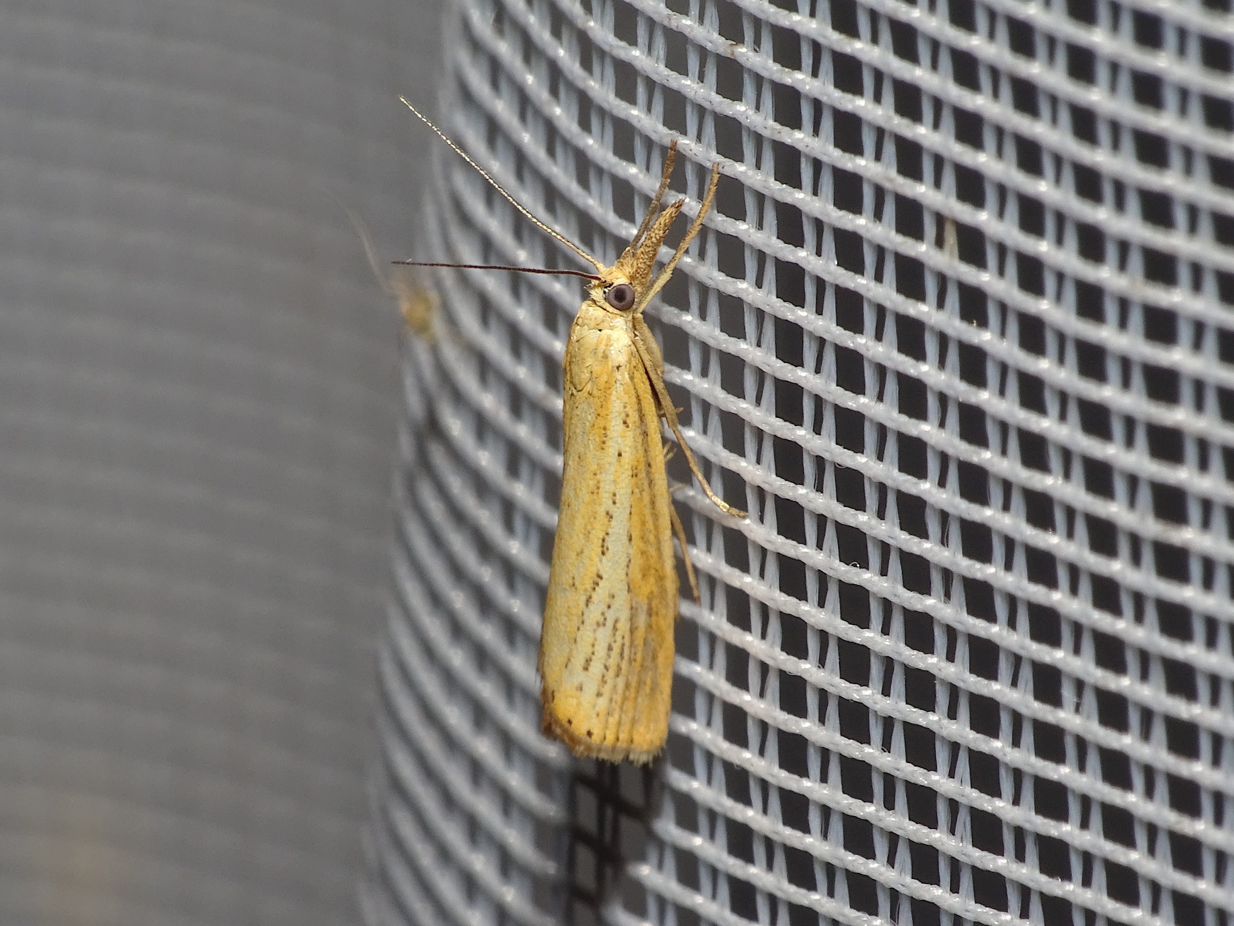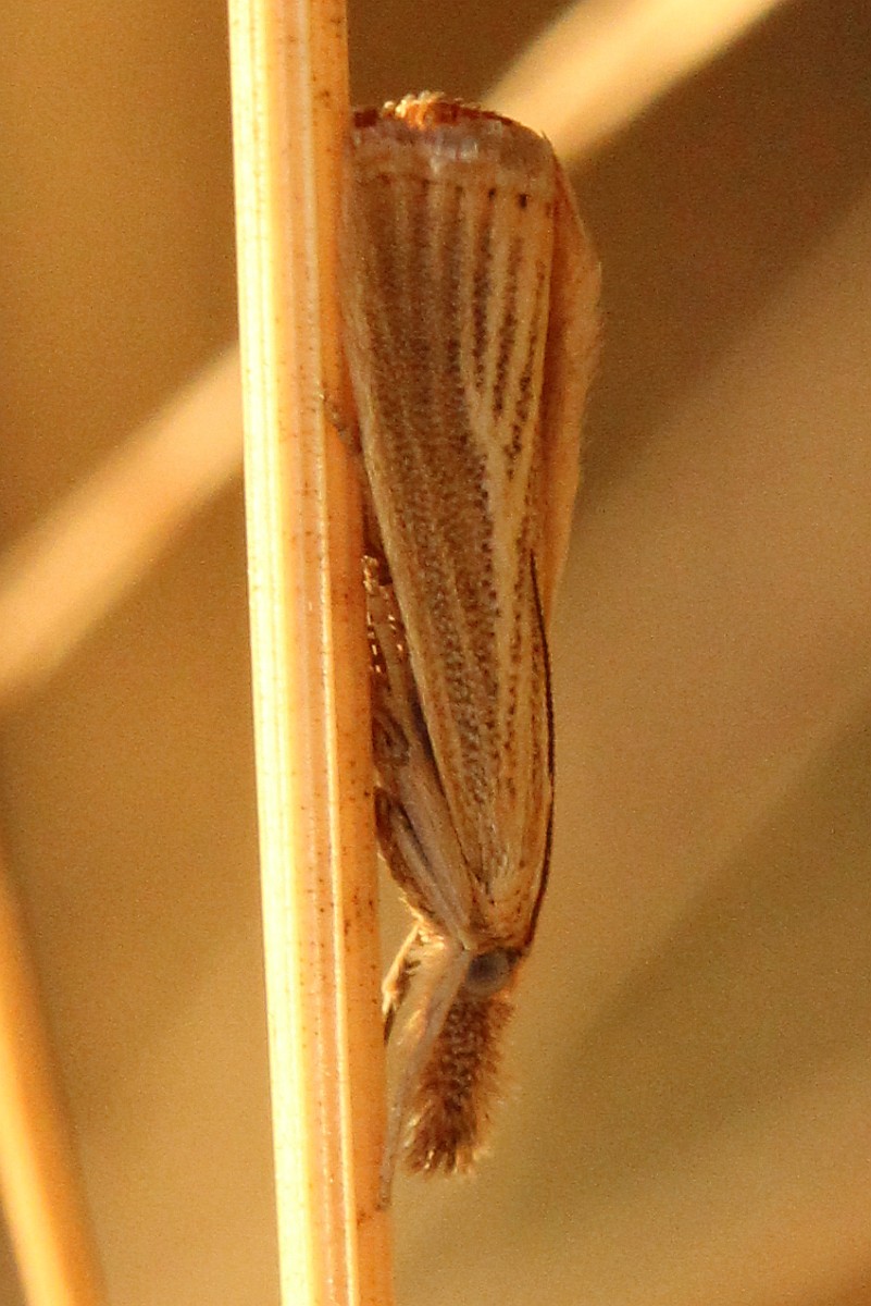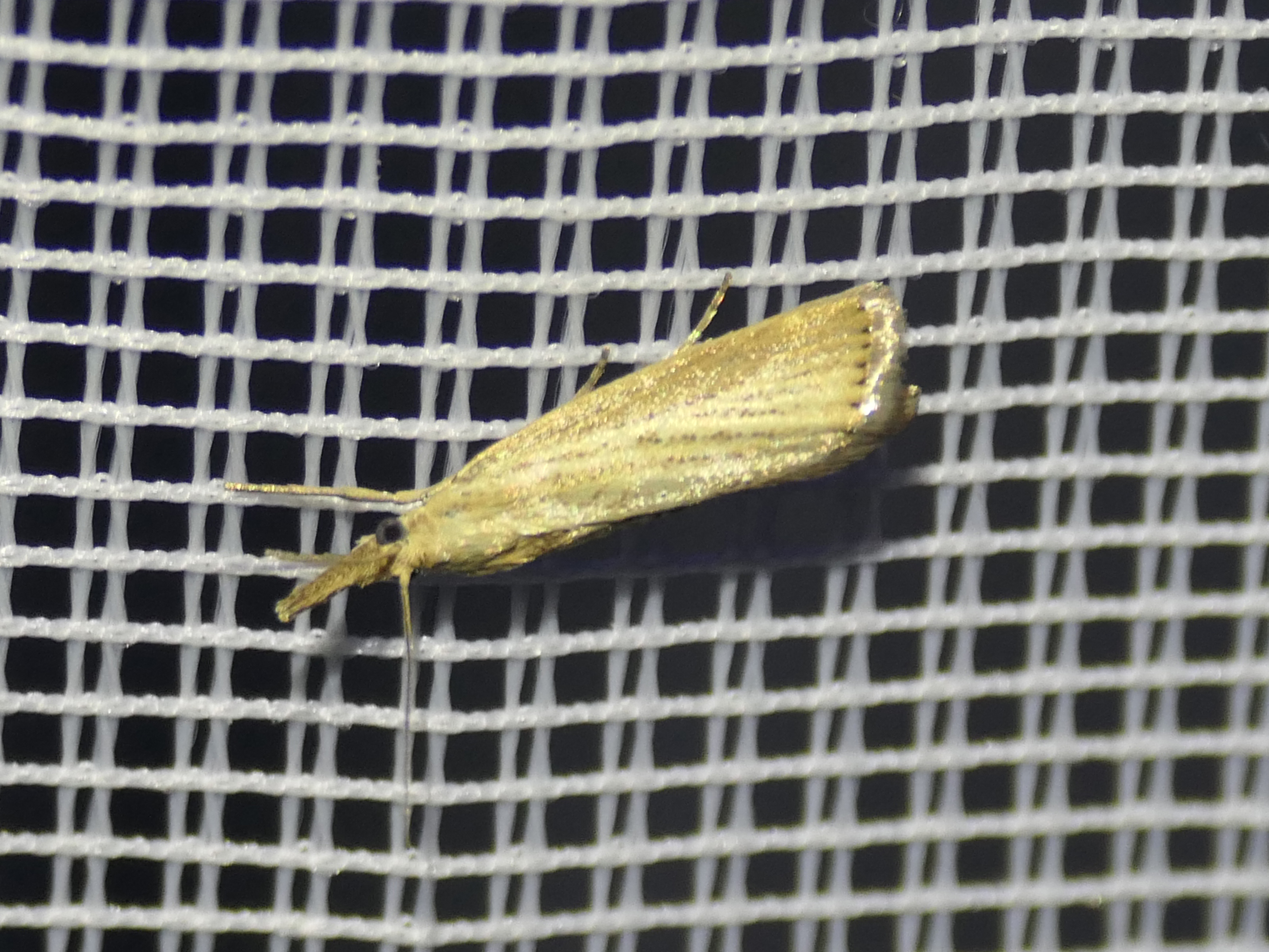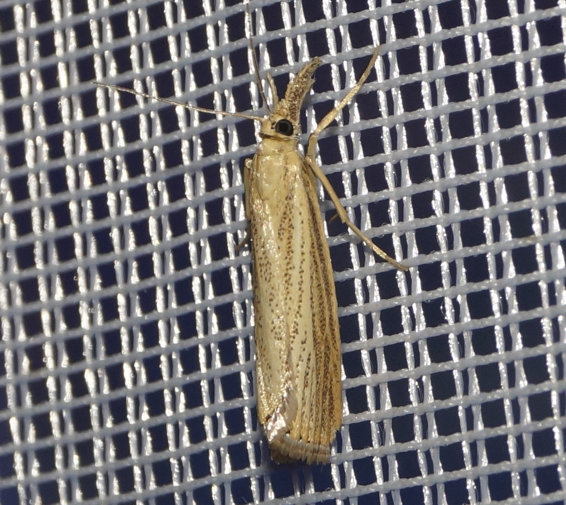 Agriphila straminella (Denis & Schiffermüller, 1775), bei Scheibenberg, auf Schilfblatt, 01.08.2018