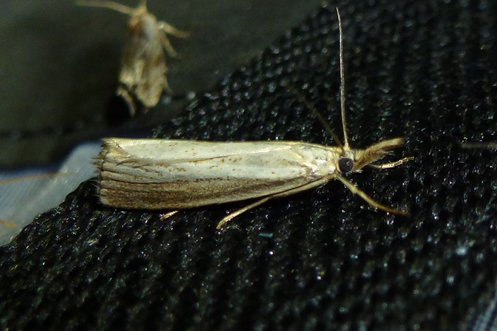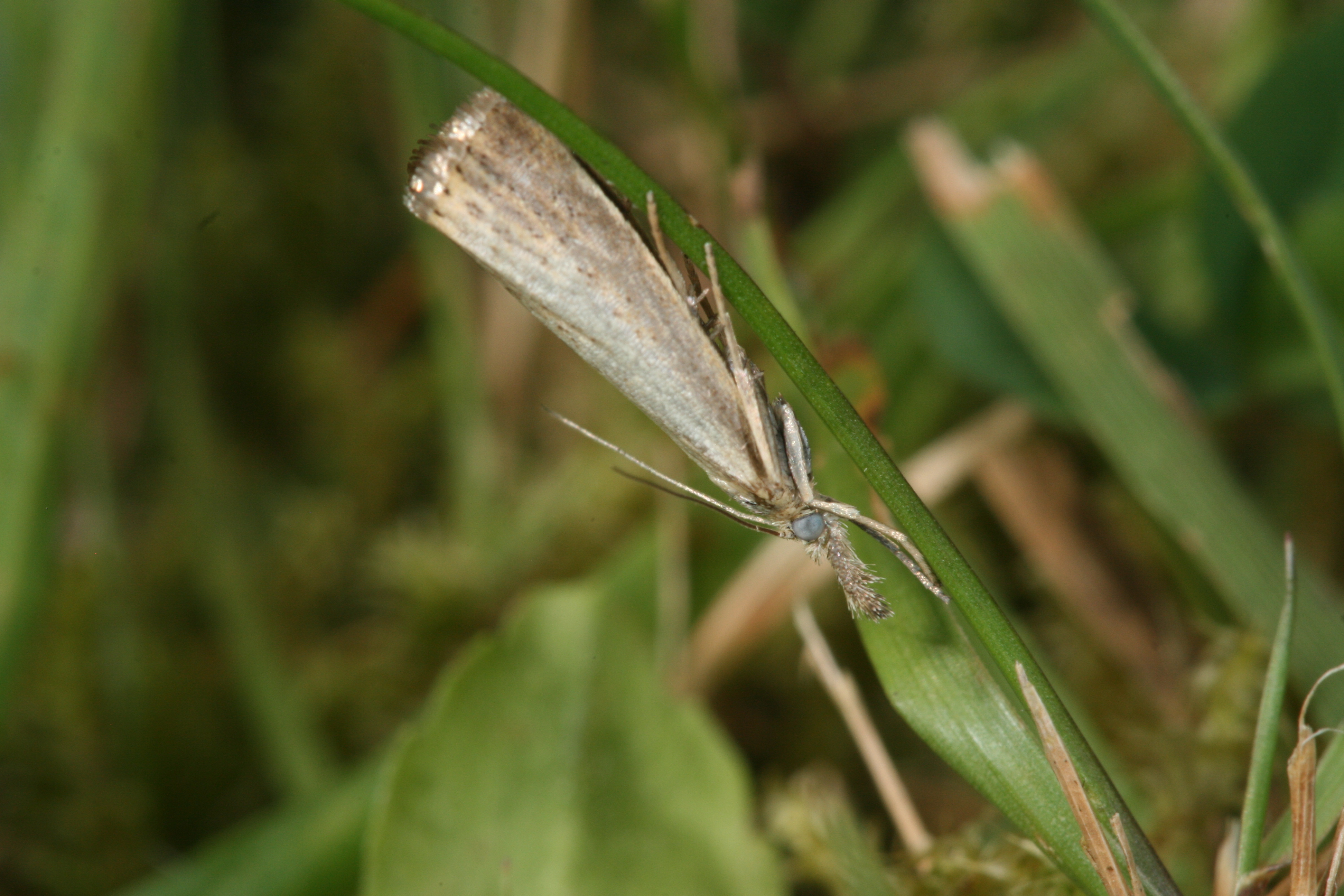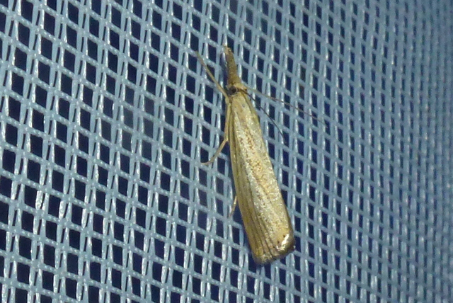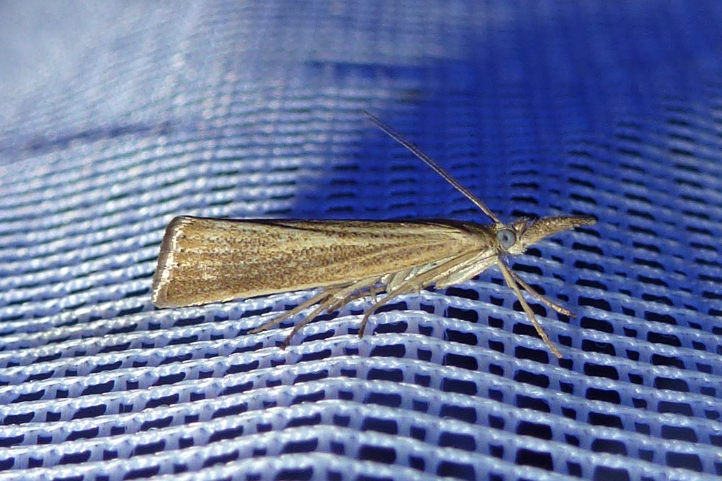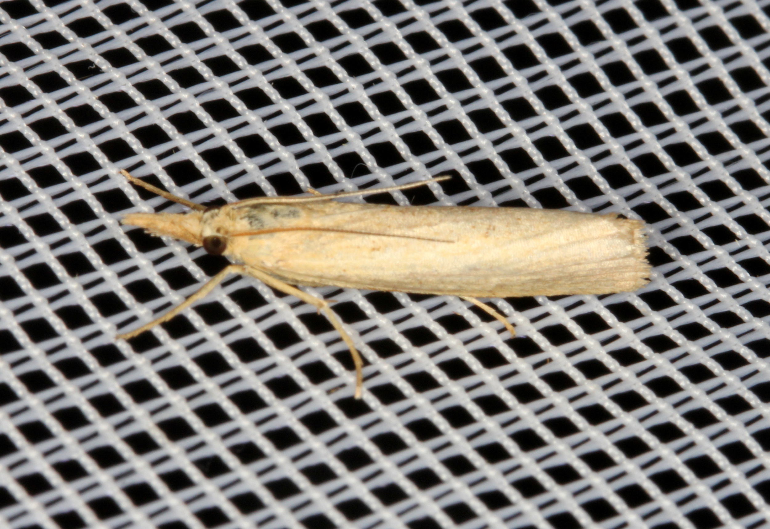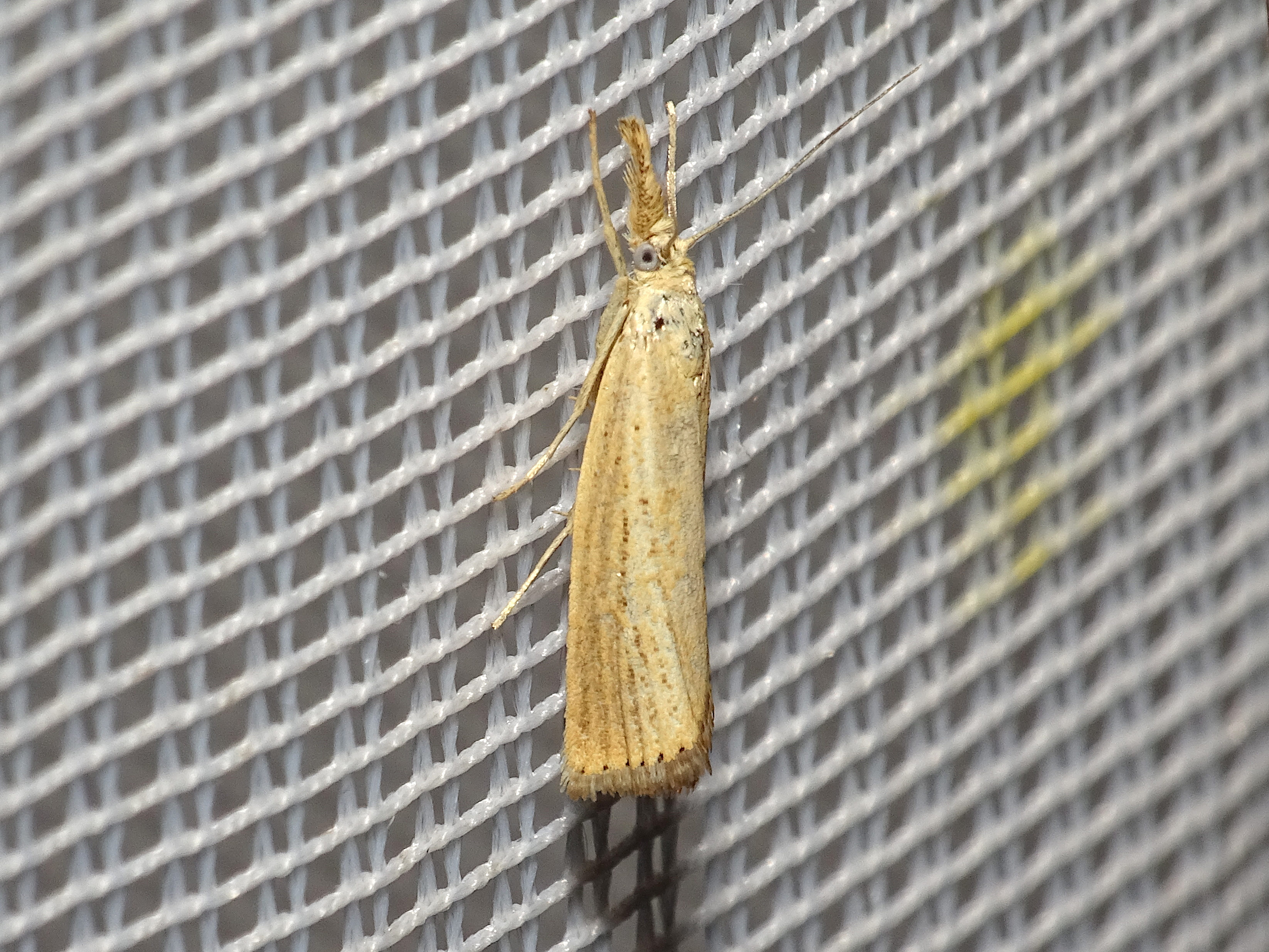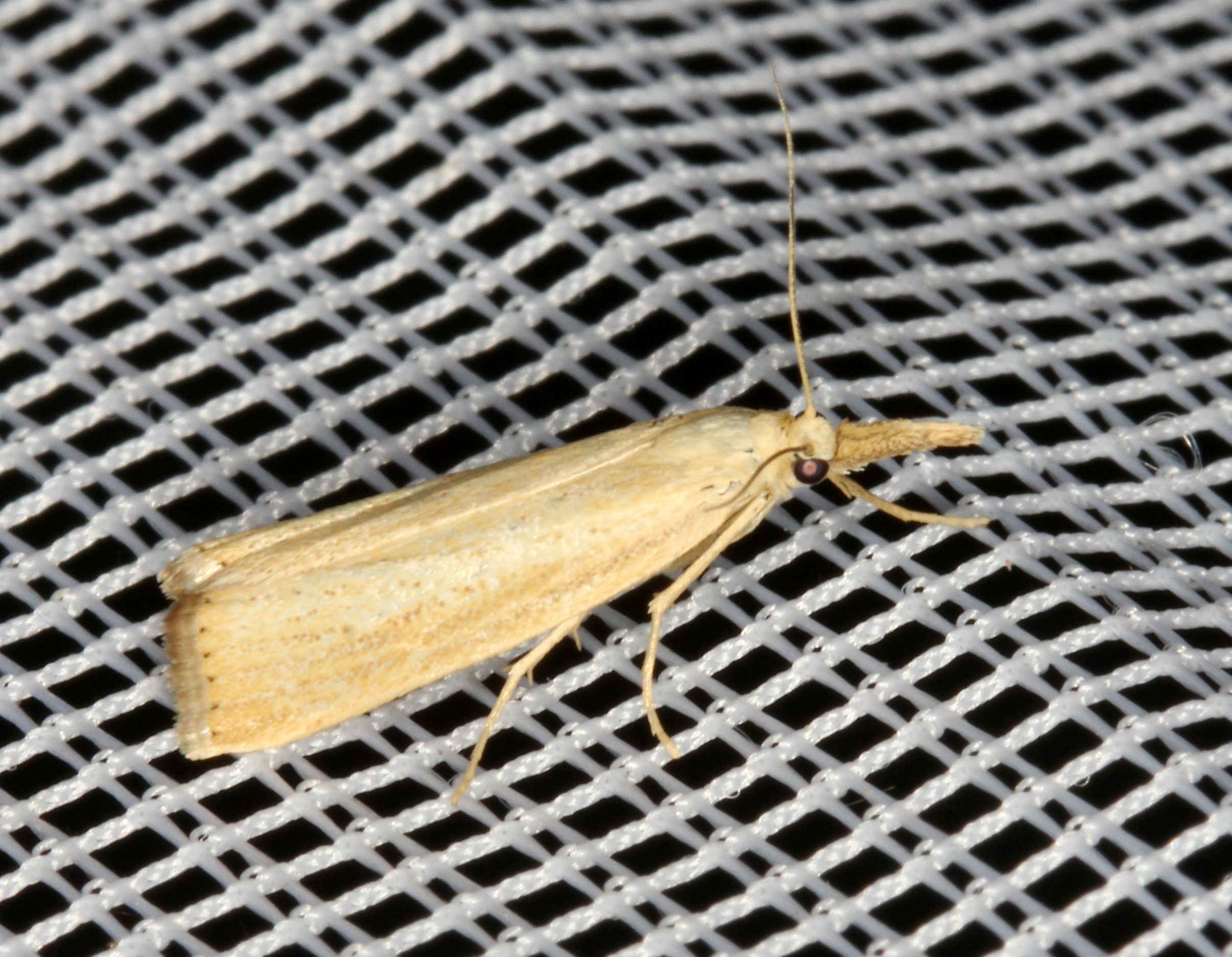 Agriphila straminella (Denis & Schiffermüller, 1775), bei Scheibenberg, auf Schilfblatt, 01.08.2018