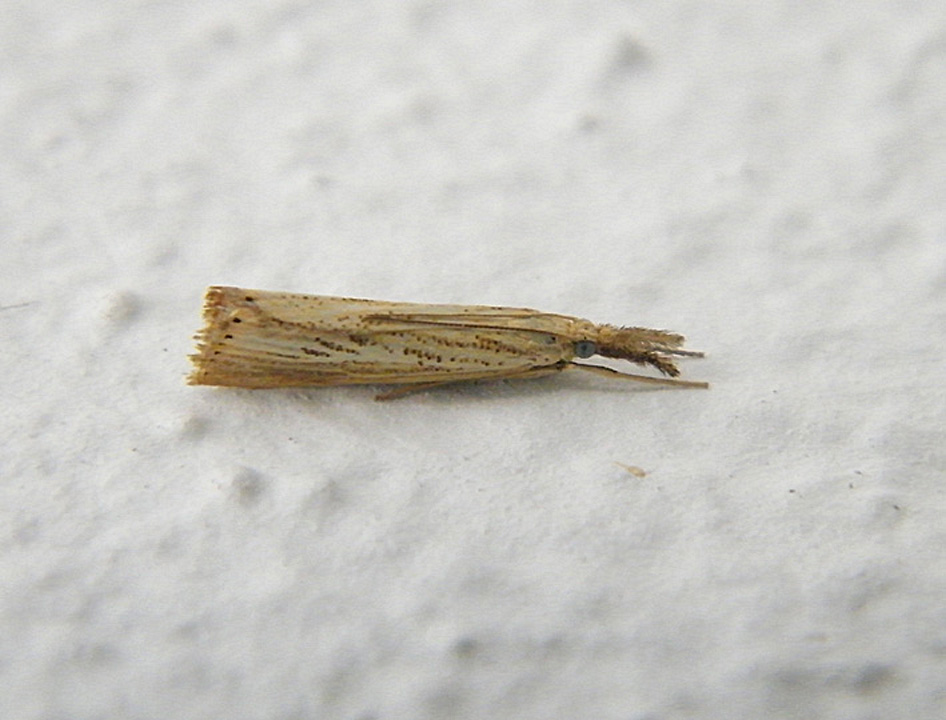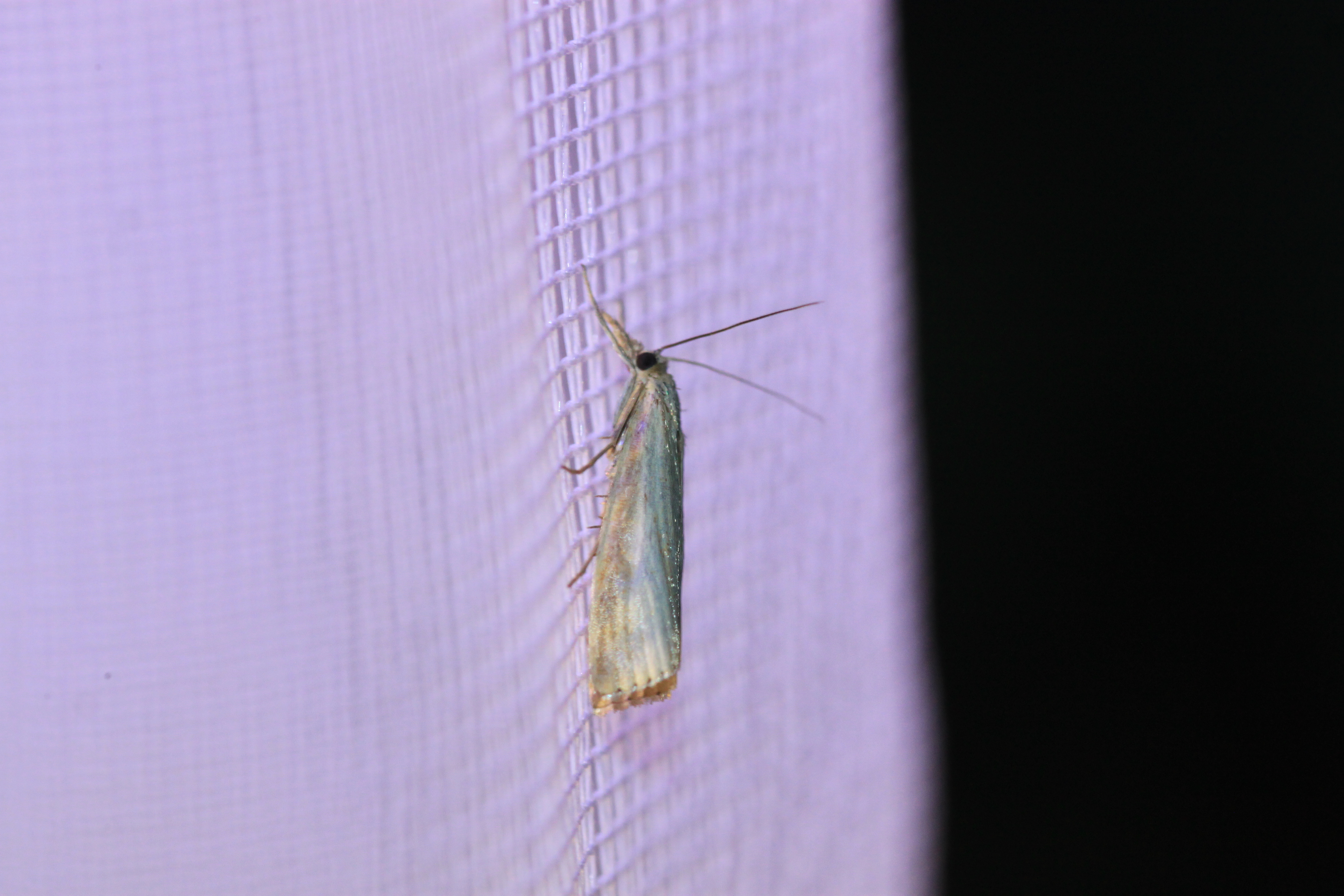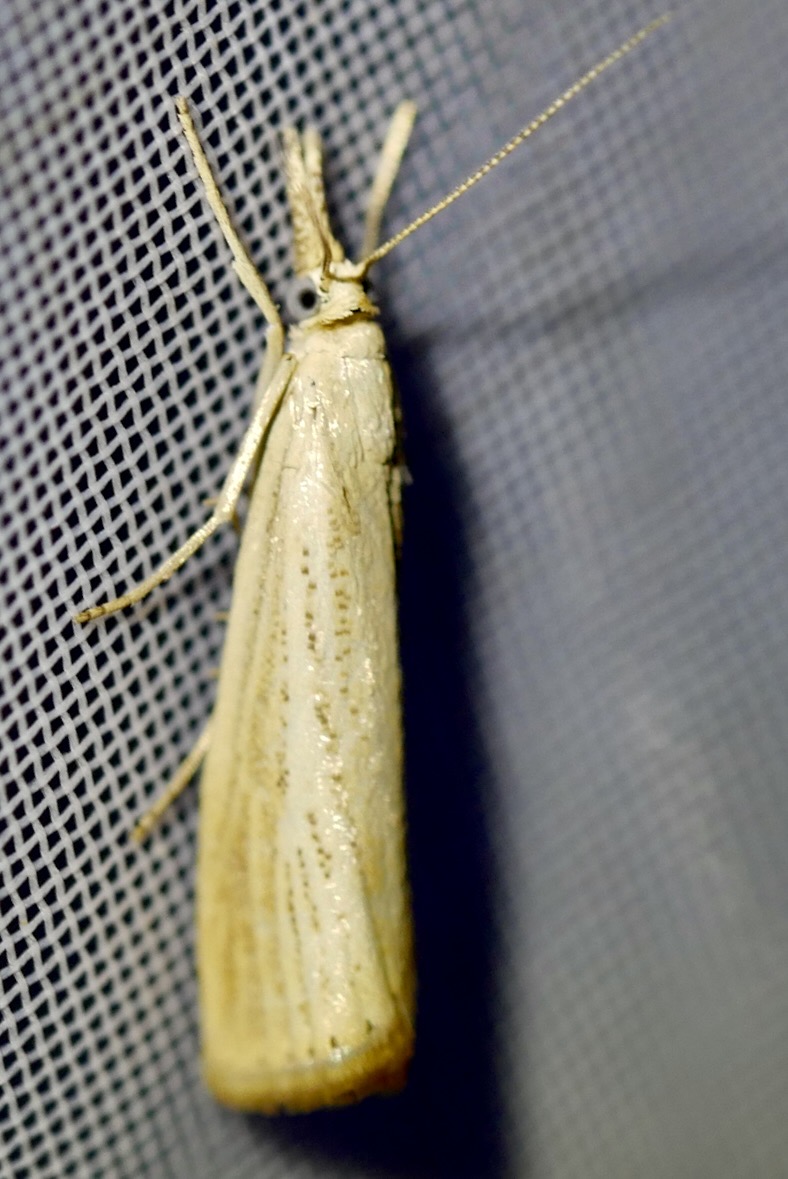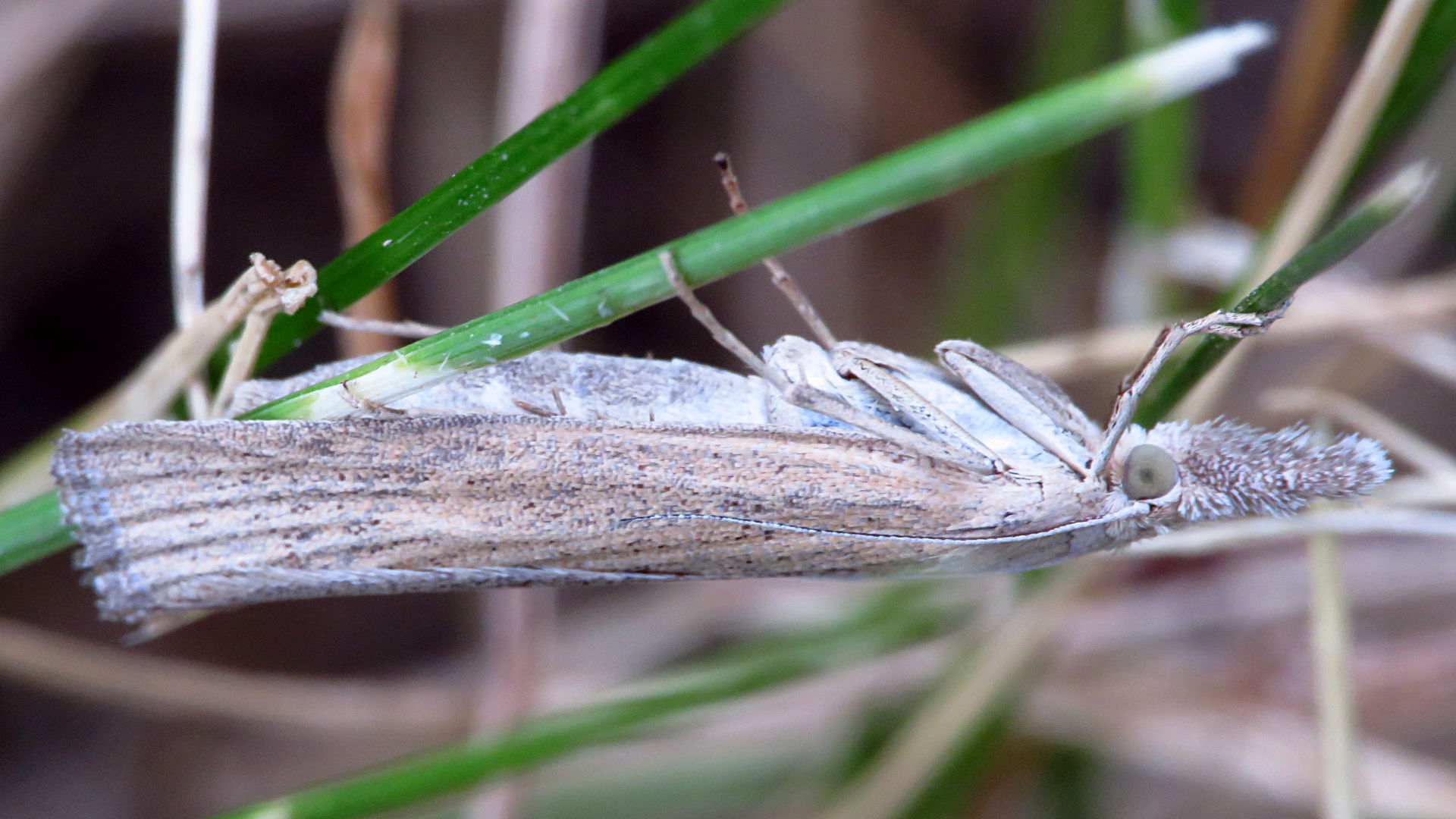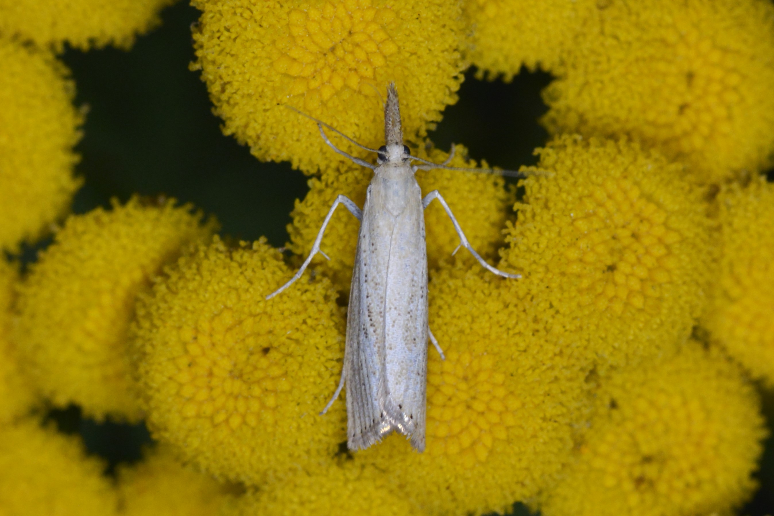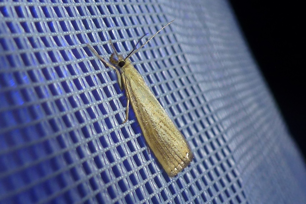 Agriphila straminella (Denis & Schiffermüller, 1775), bei Scheibenberg, auf Schilfblatt, 01.08.2018