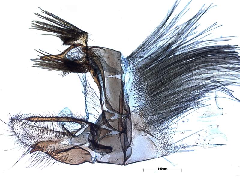 Uncus in zwei voneinander getrennte, dreieckige Sklerite geteilt, die dicht mit langen, nach posterior gerichteten Borsten besetzt sind. Gnathos deutlich länger als Uncus. Valve mit Costalarm, der fast so lang wie die Valve ist sowie ventral mit stark sklerotisiertem Sacculus, der posterior zu einer freien spitze ausgezogen ist.