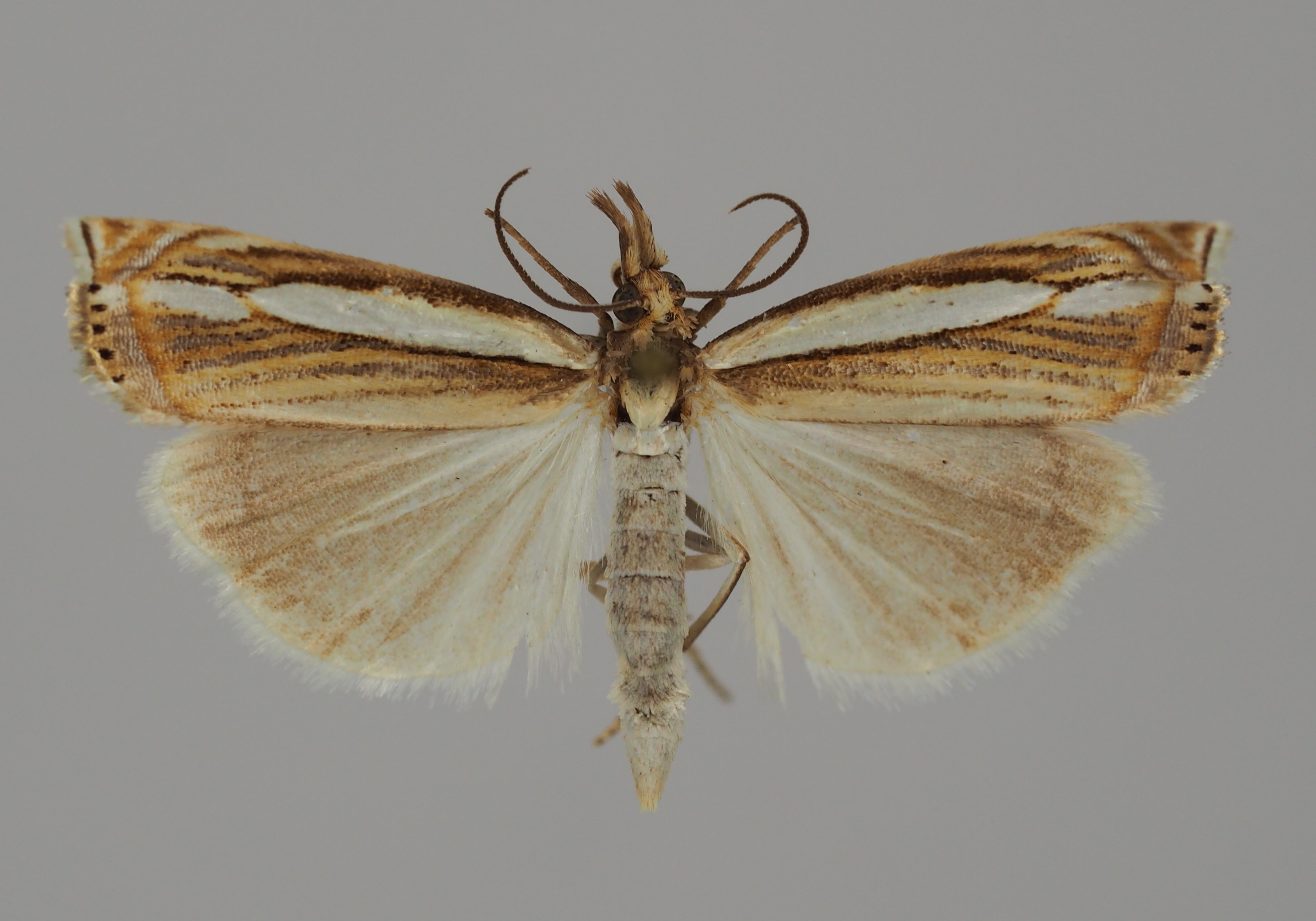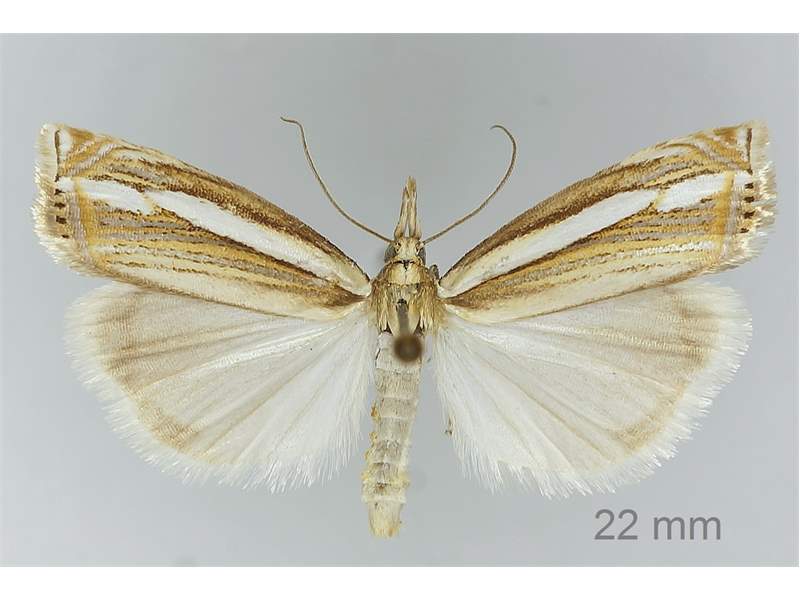 Belegexemplar von Crambus silvella vom 1. August 1949 aus Bautzen. Sammlung Hermann Starke, Senckenberg Museum für Tierkunde Dresden. Foto vor der Präparation des Abdomens (Präp. Nuss No. 1138)
