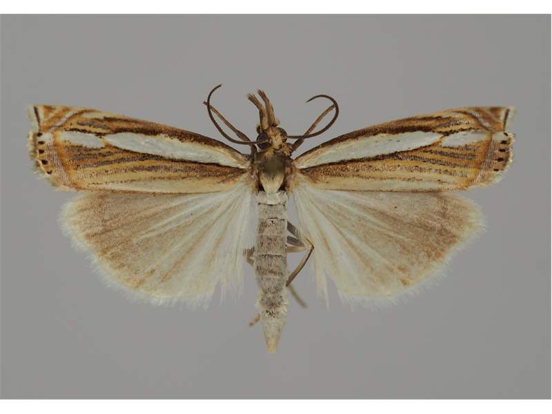 Belegexemplar von Crambus silvella vom 1. August 1949 aus Bautzen. Sammlung Hermann Starke, Senckenberg Museum für Tierkunde Dresden. Foto vor der Präparation des Abdomens (Präp. Nuss No. 1138) (© Matthias Nuß)( Bild vergrößern)