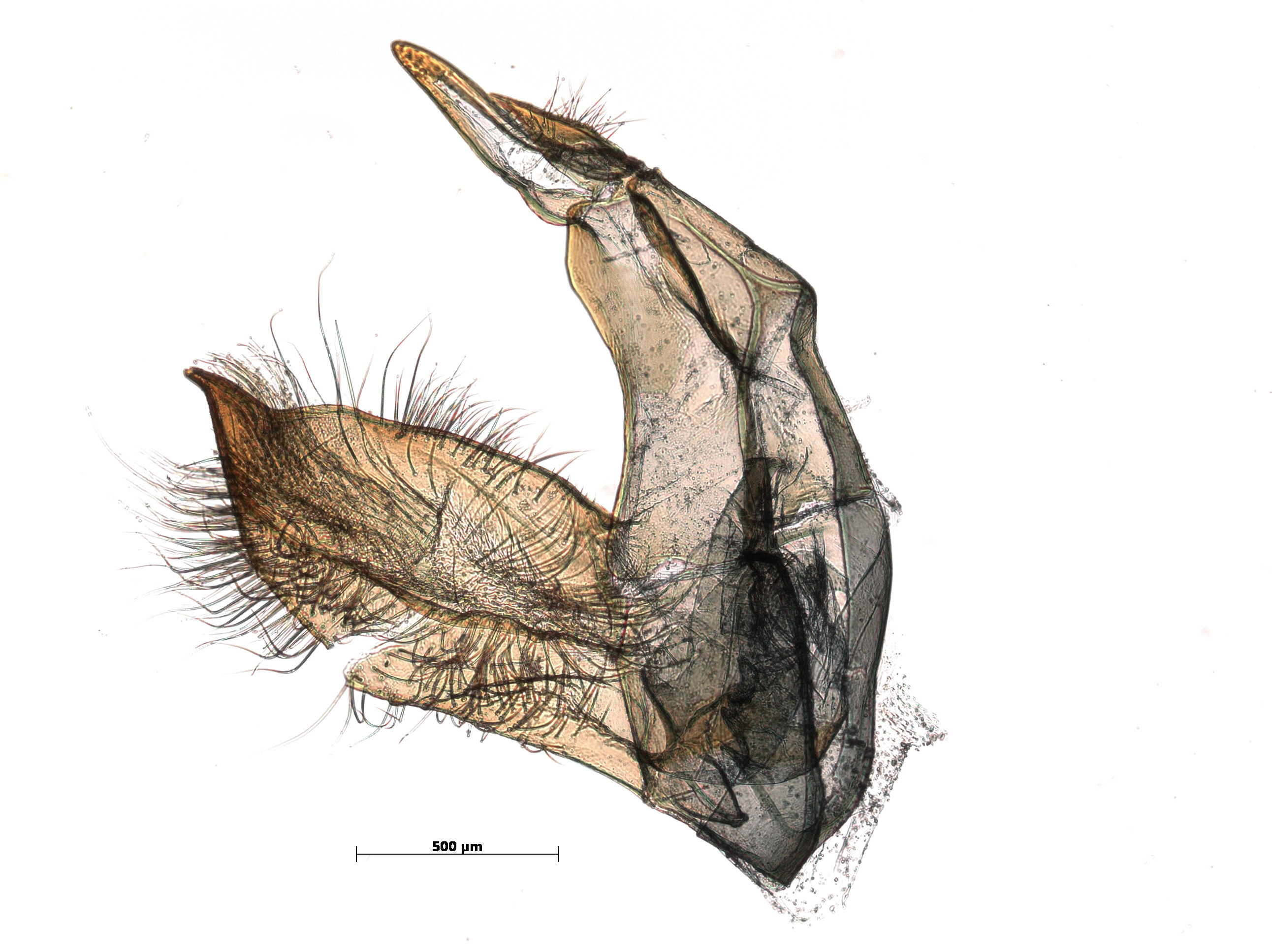 Männchliches Genital. Vinculum anterio-lateral mit Choremata. Uncus ungeteilt, dreieckig, distal spitz, deutlich kürzer als Gnathos. Valve posterior mit spitz ausgezogener Sklerotisierung; ohne Costalarm und ohne differenziertem Sacculus.