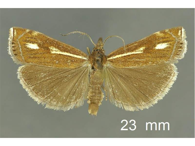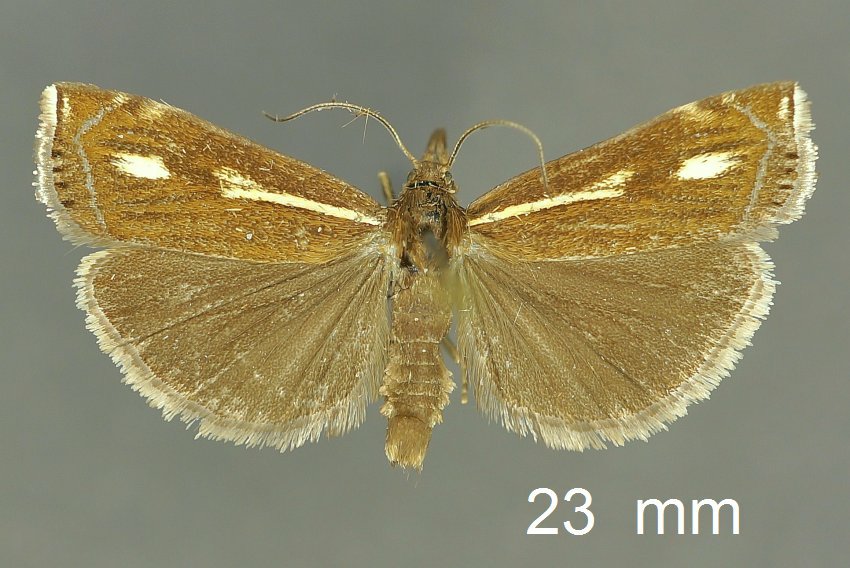 Vorderflügel braun; weiße Mittelbinde ganzrandig, in Verlängerung der Binde ein weißer Fleck; Flügelhinterrand ohne weißen Schatten. Vergleiche