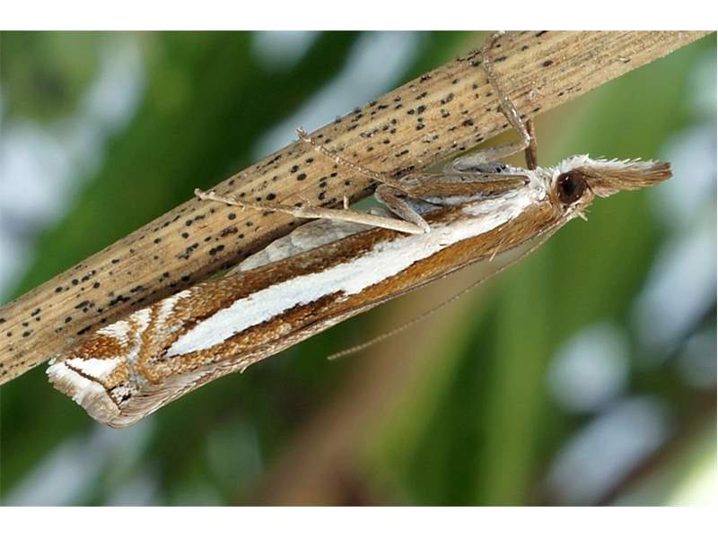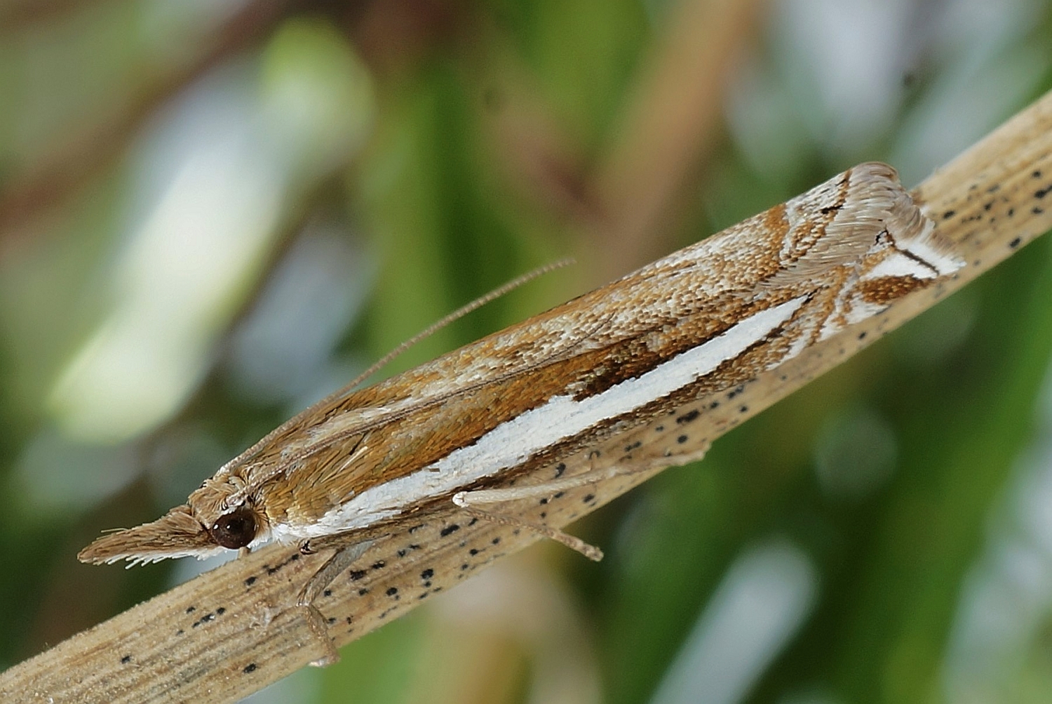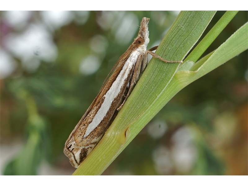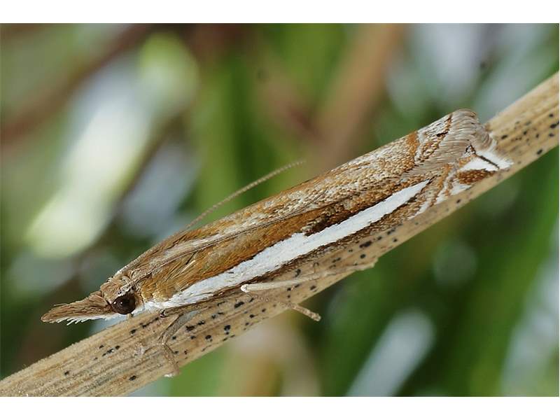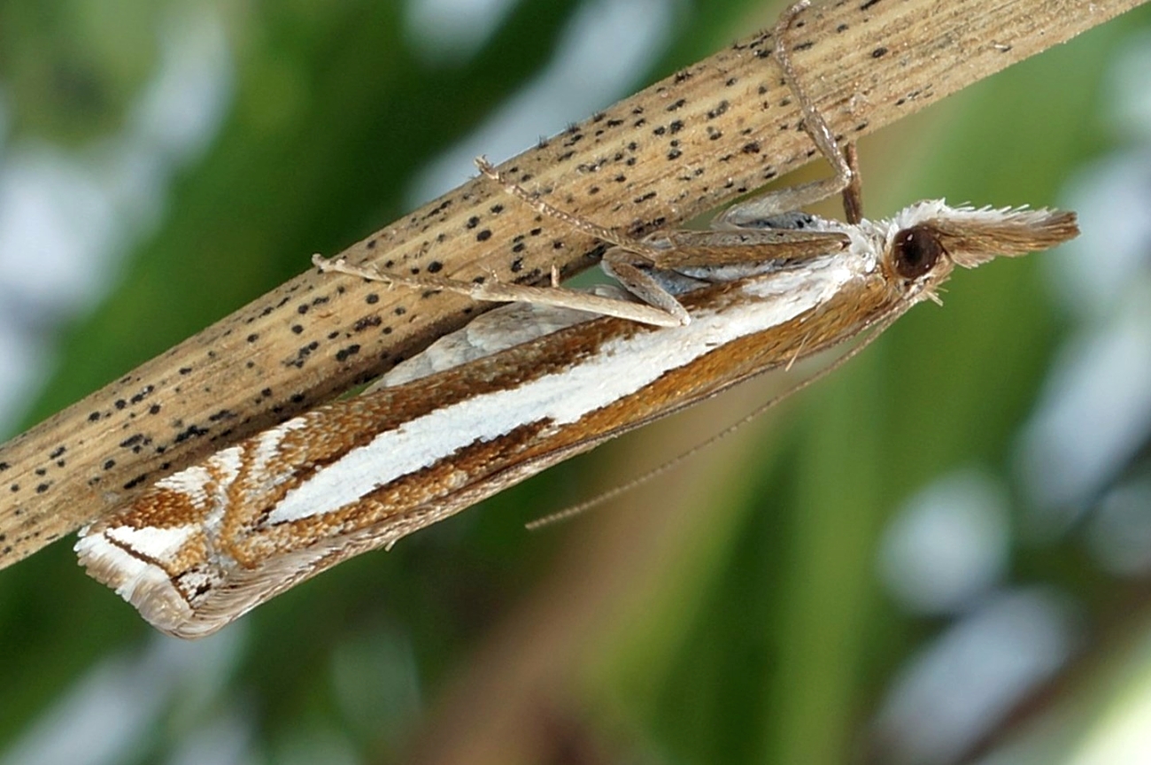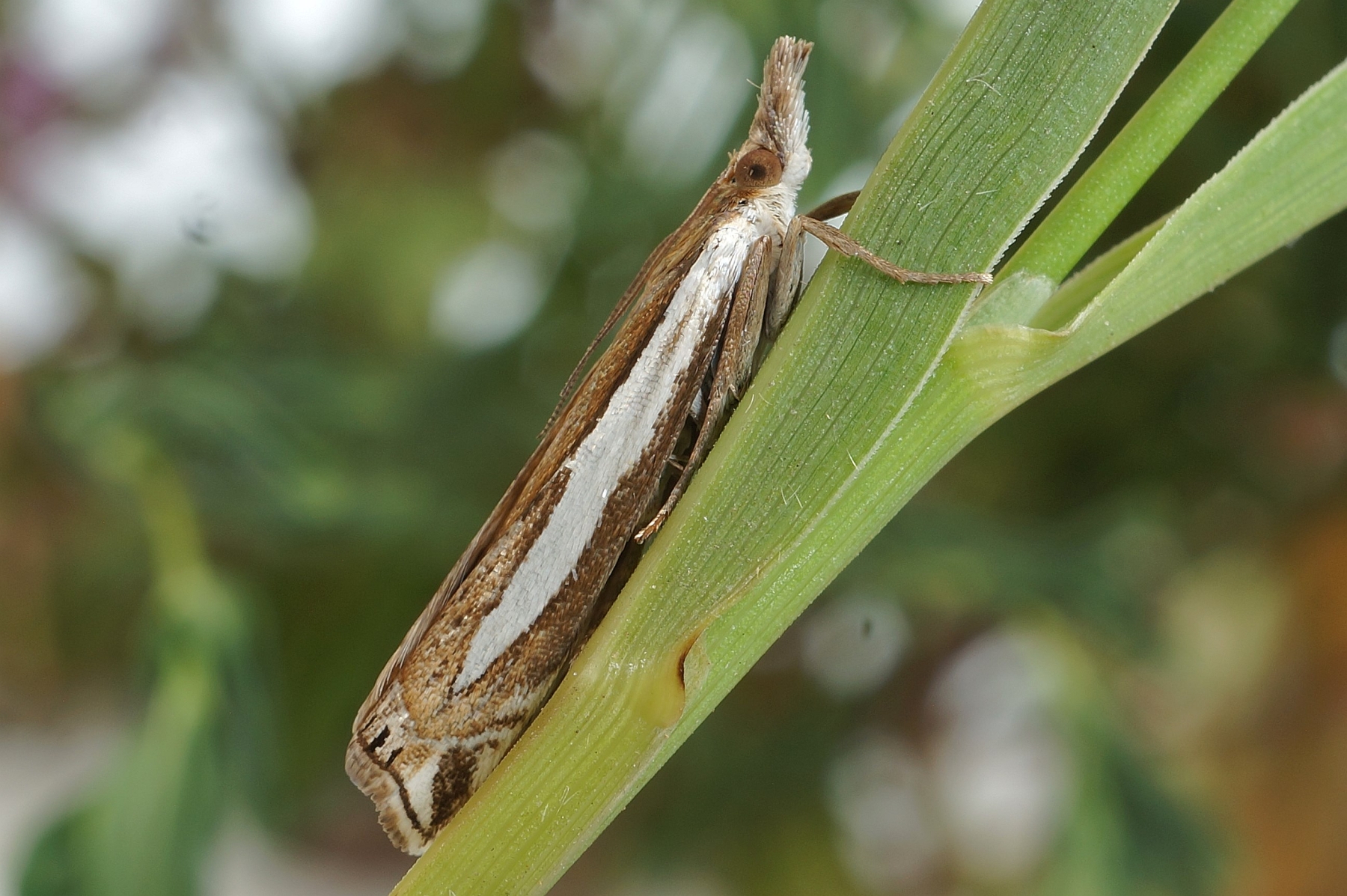 Vorderflügel braun; weiße Mittelbinde unten mit einer Zunge, in Verlängerung der Binde kein weißer Fleck; Flügelhinterrand ohne weißen Schatten. Vergleiche Crambus alienellus.