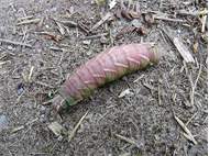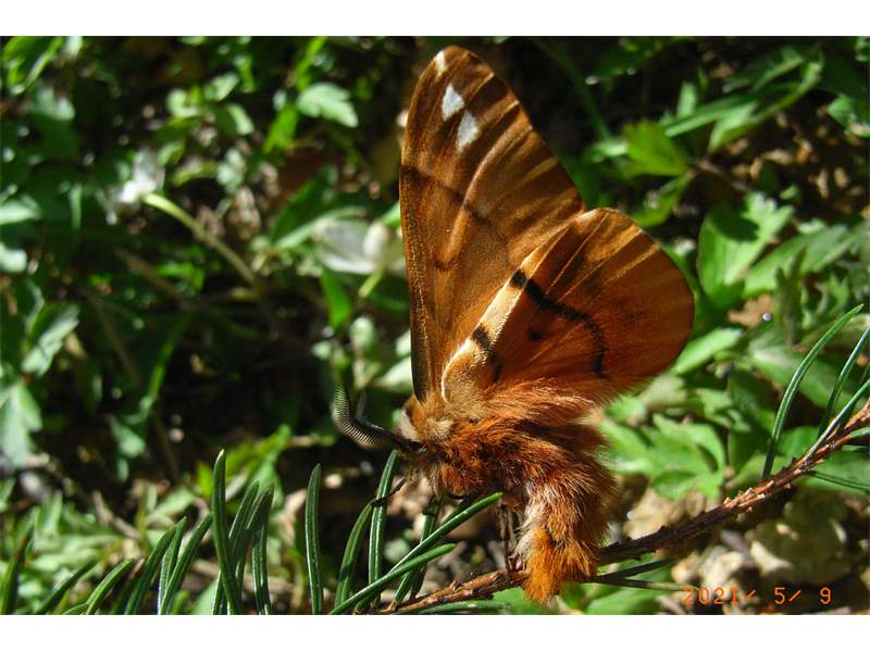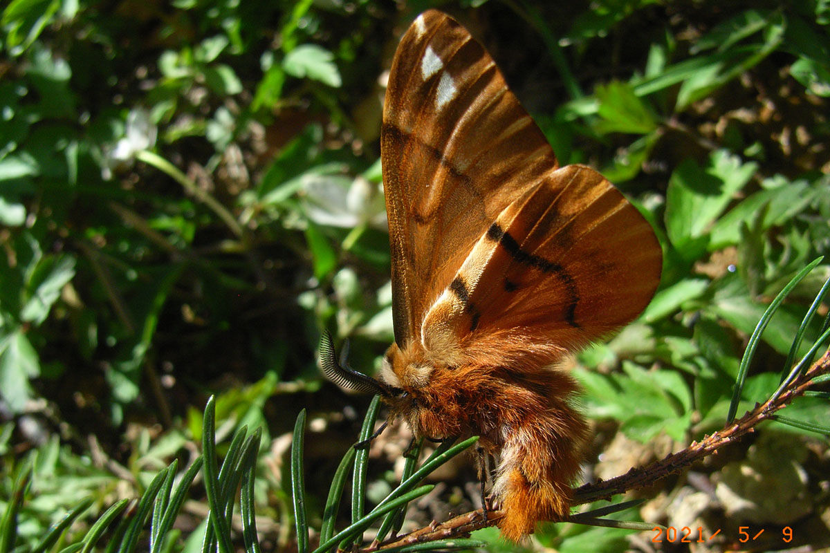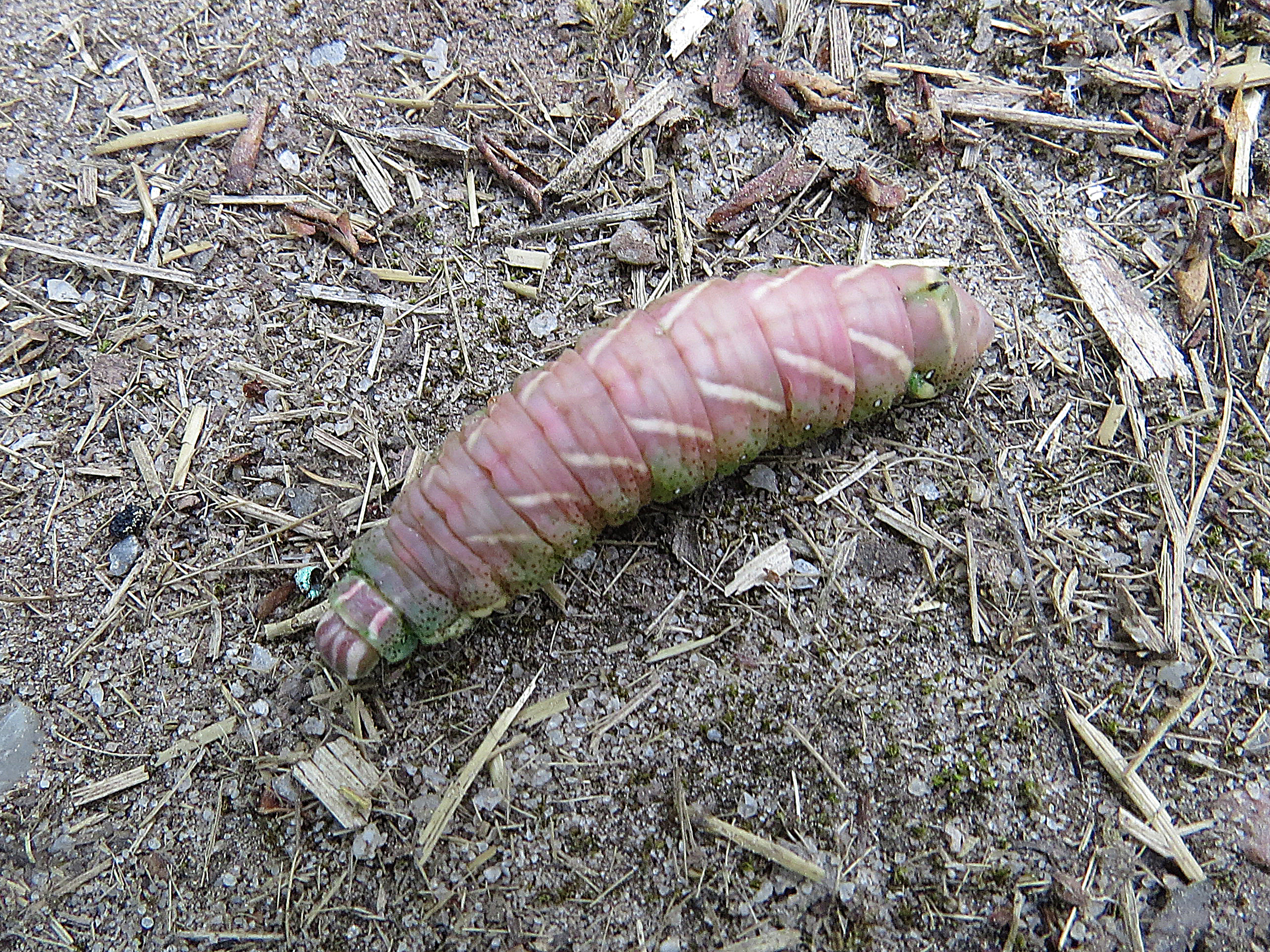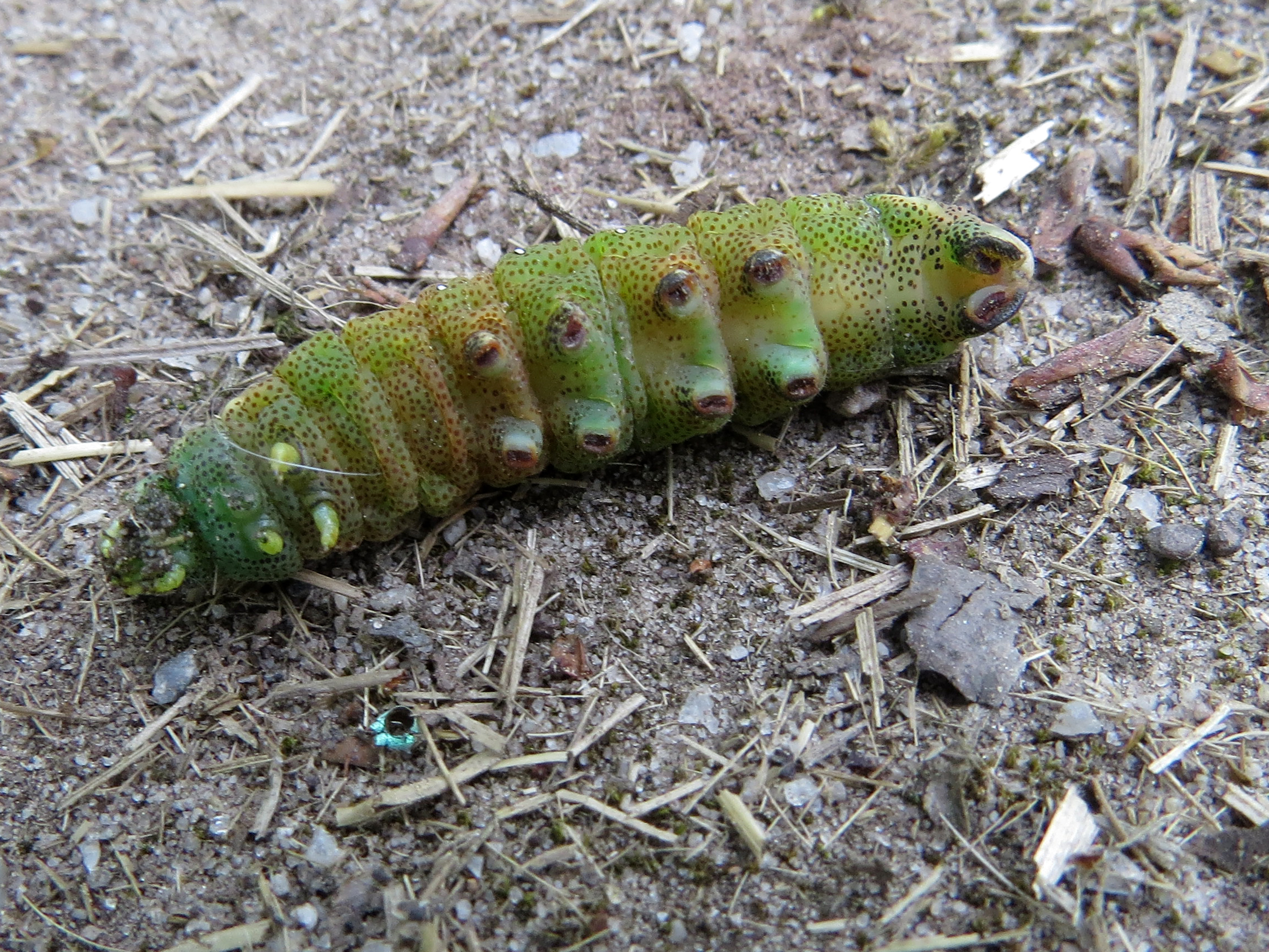 Scheckflügel (Endromis versicolora (Linnaeus, 1758)) Larve auf einem Waldeg der Hochhalde Trages bei Espenhain, Ende Mai 2018