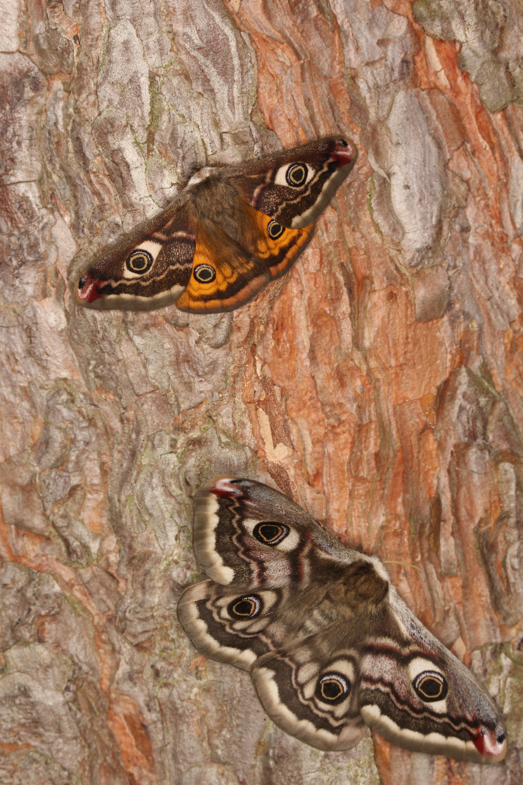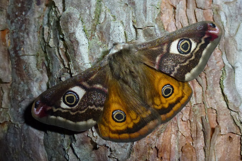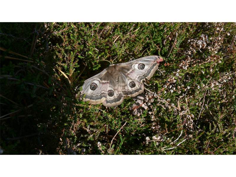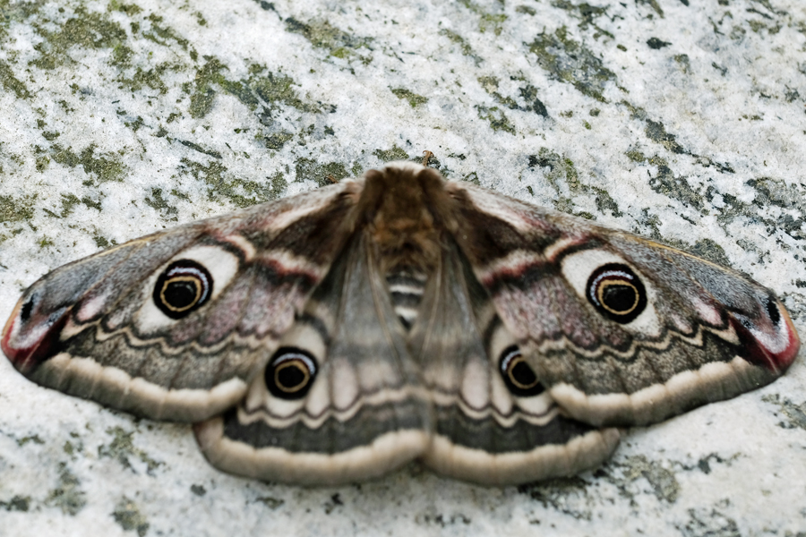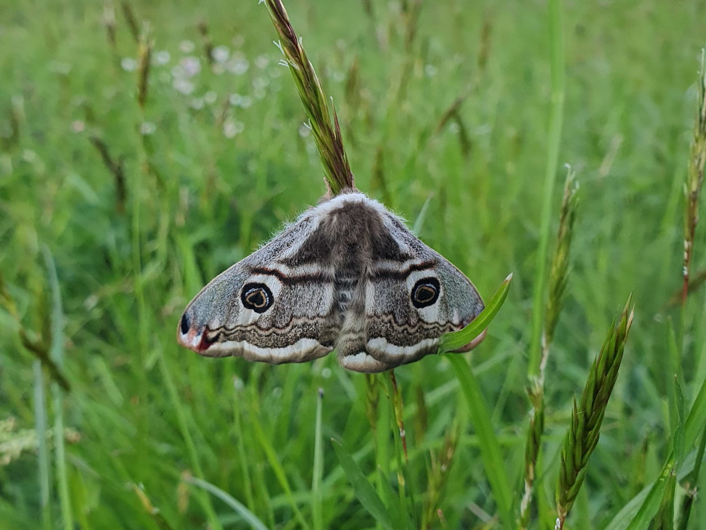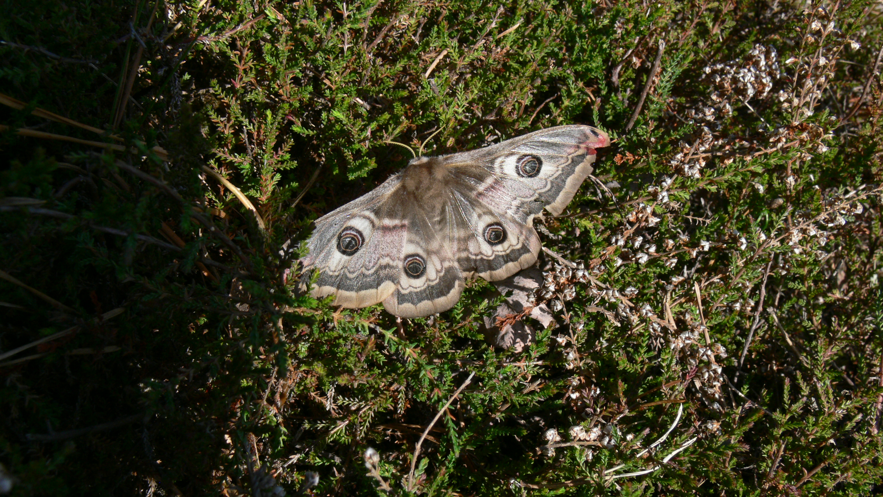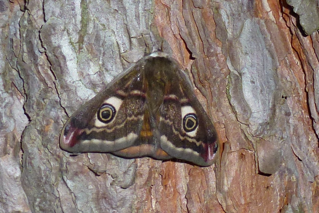 Kleines Nachtpfauenauge (Saturnia pavonia (Linnaeus, 1758)), Tagfund eines Weibchen mit nachfolgender Kopula in Hoyerswerda Klein Neida am 01.Mai 2019. Das Weibchen zufällig entdeckt saß 8 Stunden bis ein Männchen anflog, Kopula über 2,5 Stunden, dann entschwand nach kurzem Nebeneinander das Männchen wieder, das Weibchen folgte etwa eine Stunde später und flog in die Dämmerung.