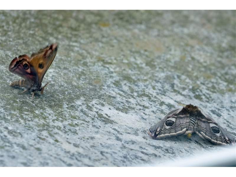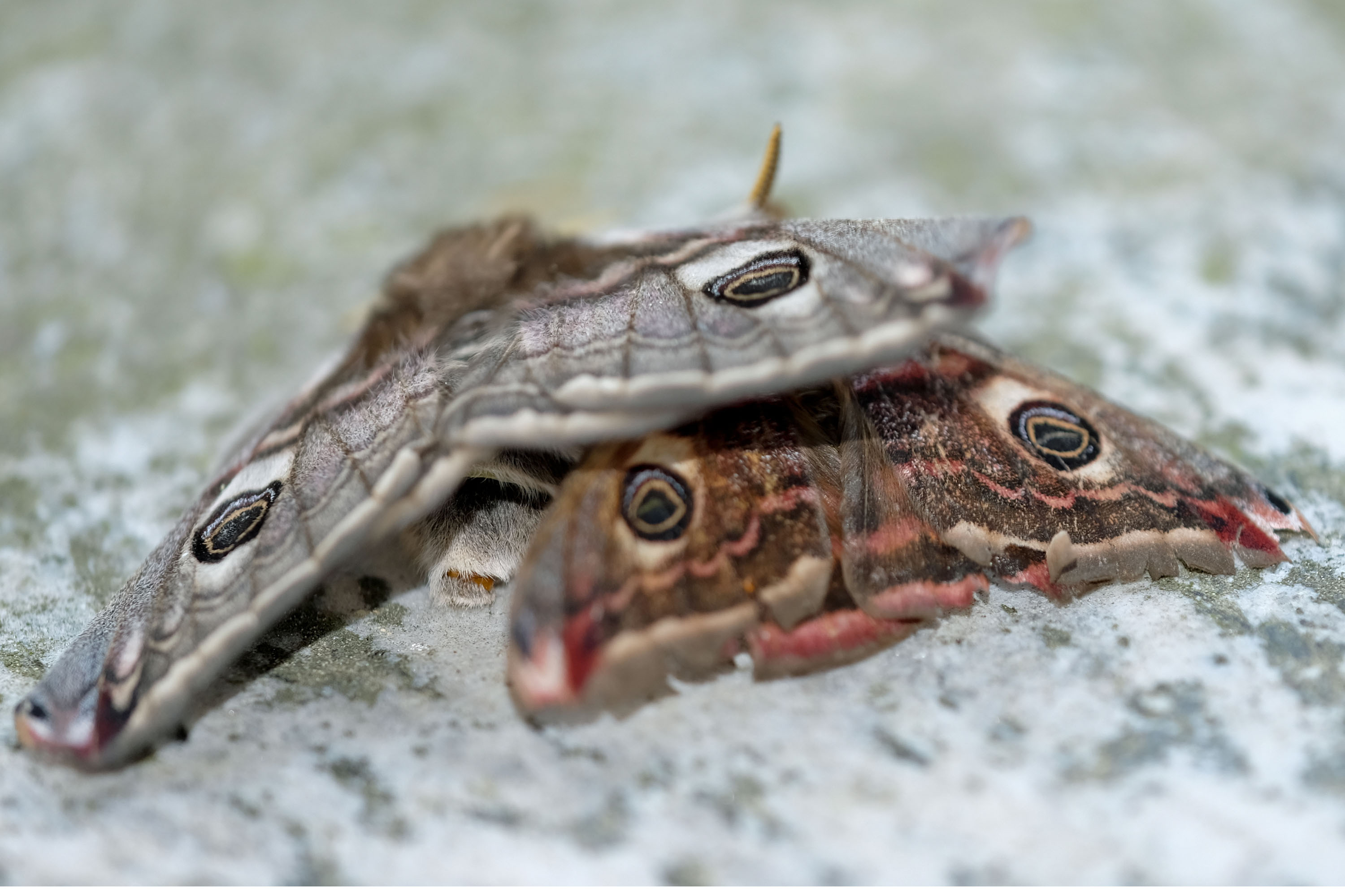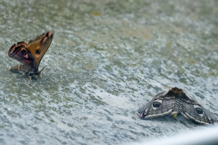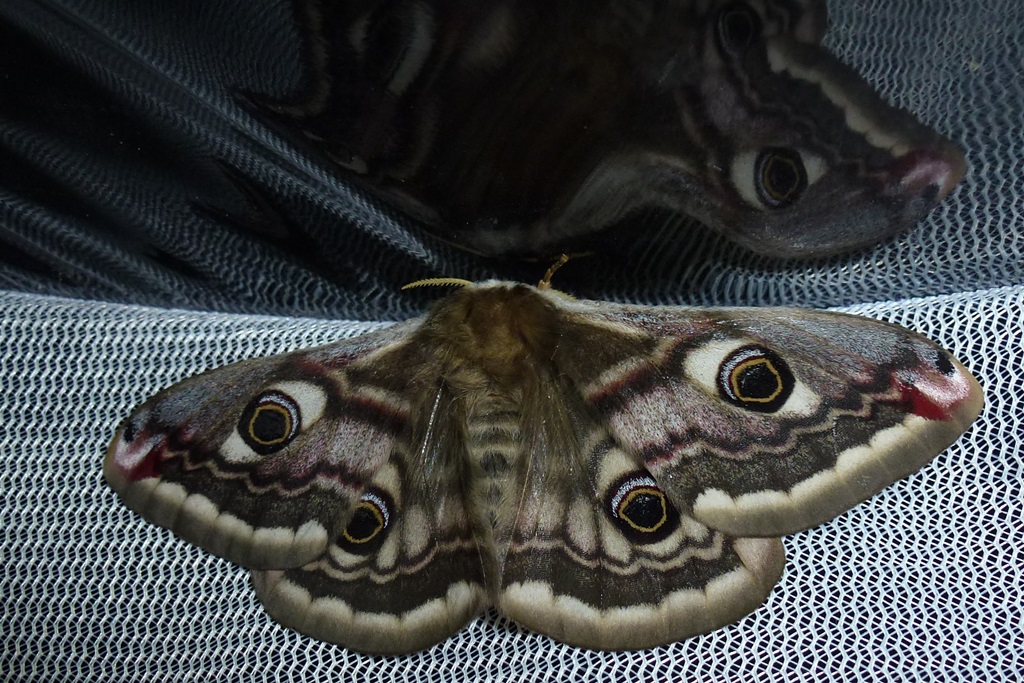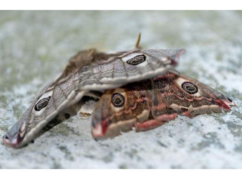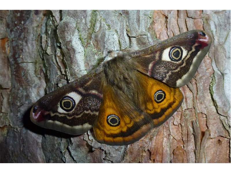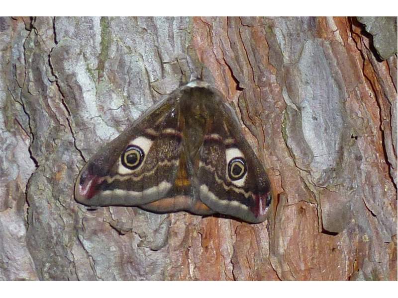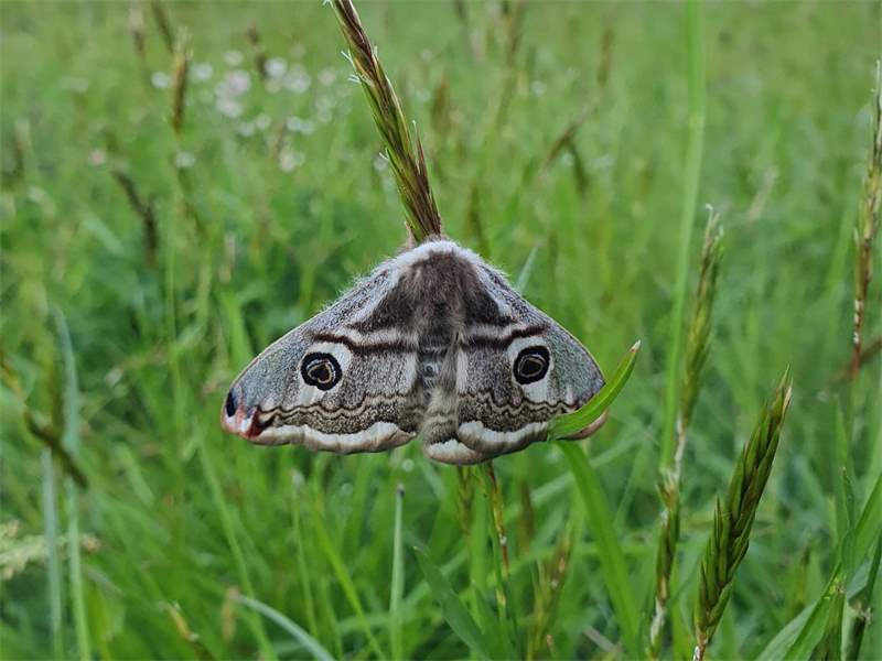 Kleines Nachtpfauenauge (Saturnia pavonia (Linnaeus, 1758)), Tagfund eines Weibchen mit nachfolgender Kopula in Hoyerswerda Klein Neida am 01.Mai 2019. Das Weibchen zufällig entdeckt saß 8 Stunden bis ein Männchen anflog, Kopula über 2,5 Stunden, dann entschwand nach kurzem Nebeneinander das Männchen wieder, das Weibchen folgte etwa eine Stunde später und flog in die Dämmerung.