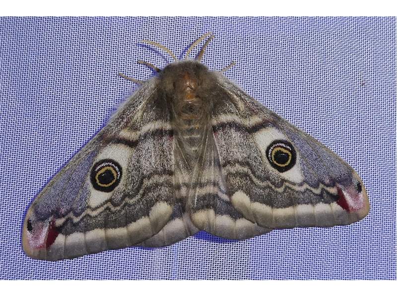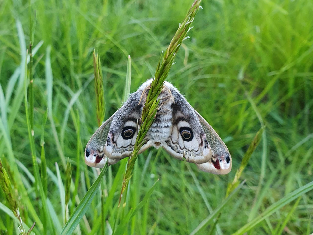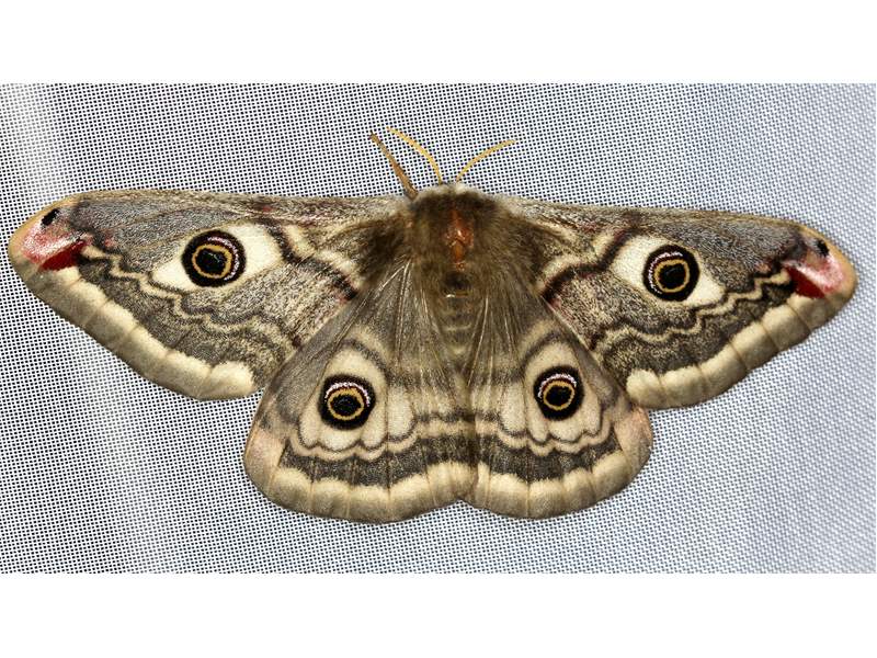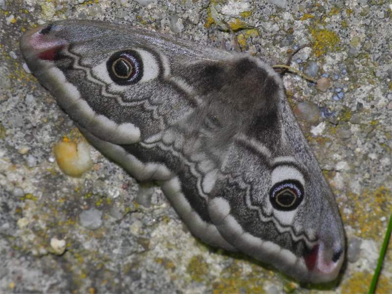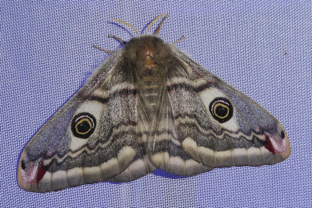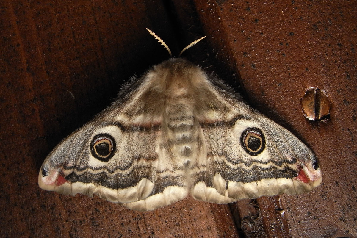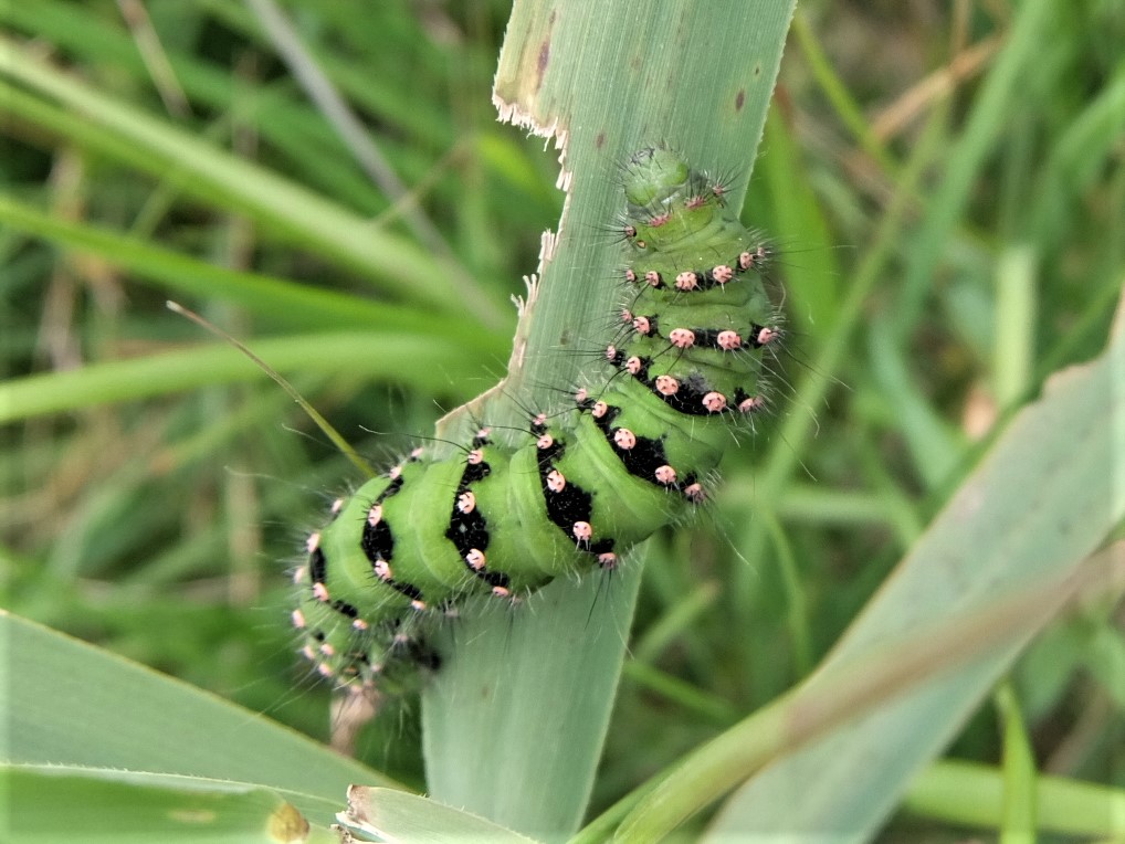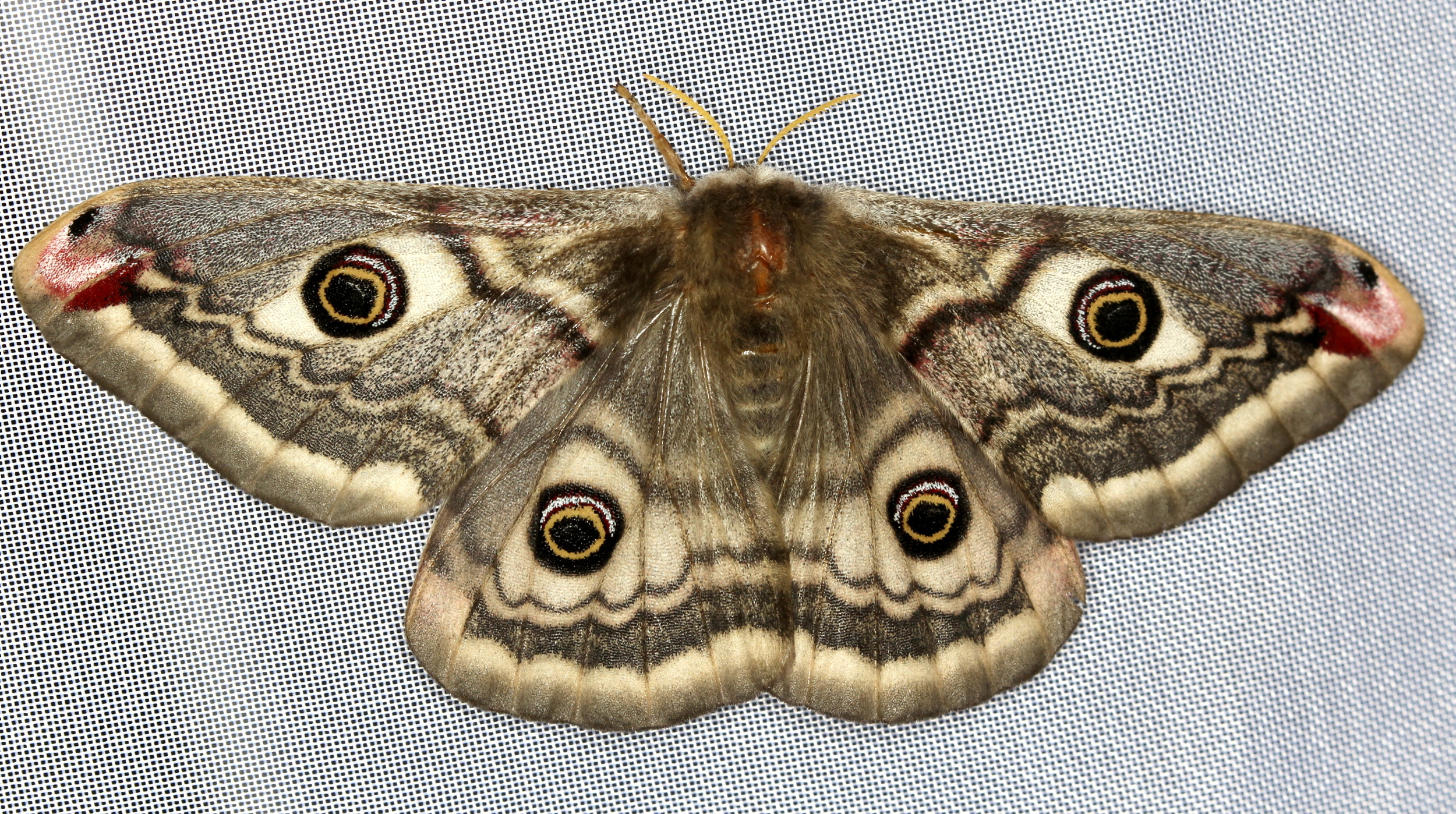 Kleines Nachtpfauenauge (Saturnia pavonia (Linnaeus, 1758)), Tagfund eines Weibchen mit nachfolgender Kopula in Hoyerswerda Klein Neida am 01.Mai 2019. Das Weibchen zufällig entdeckt saß 8 Stunden bis ein Männchen anflog, Kopula über 2,5 Stunden, dann entschwand nach kurzem Nebeneinander das Männchen wieder, das Weibchen folgte etwa eine Stunde später und flog in die Dämmerung.
