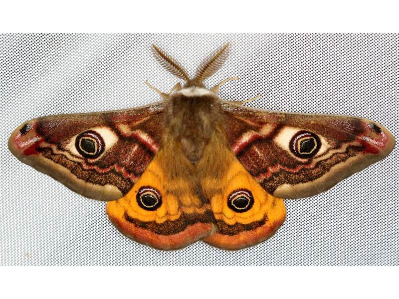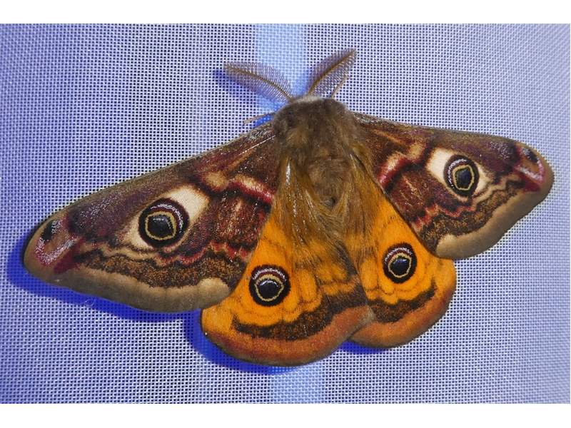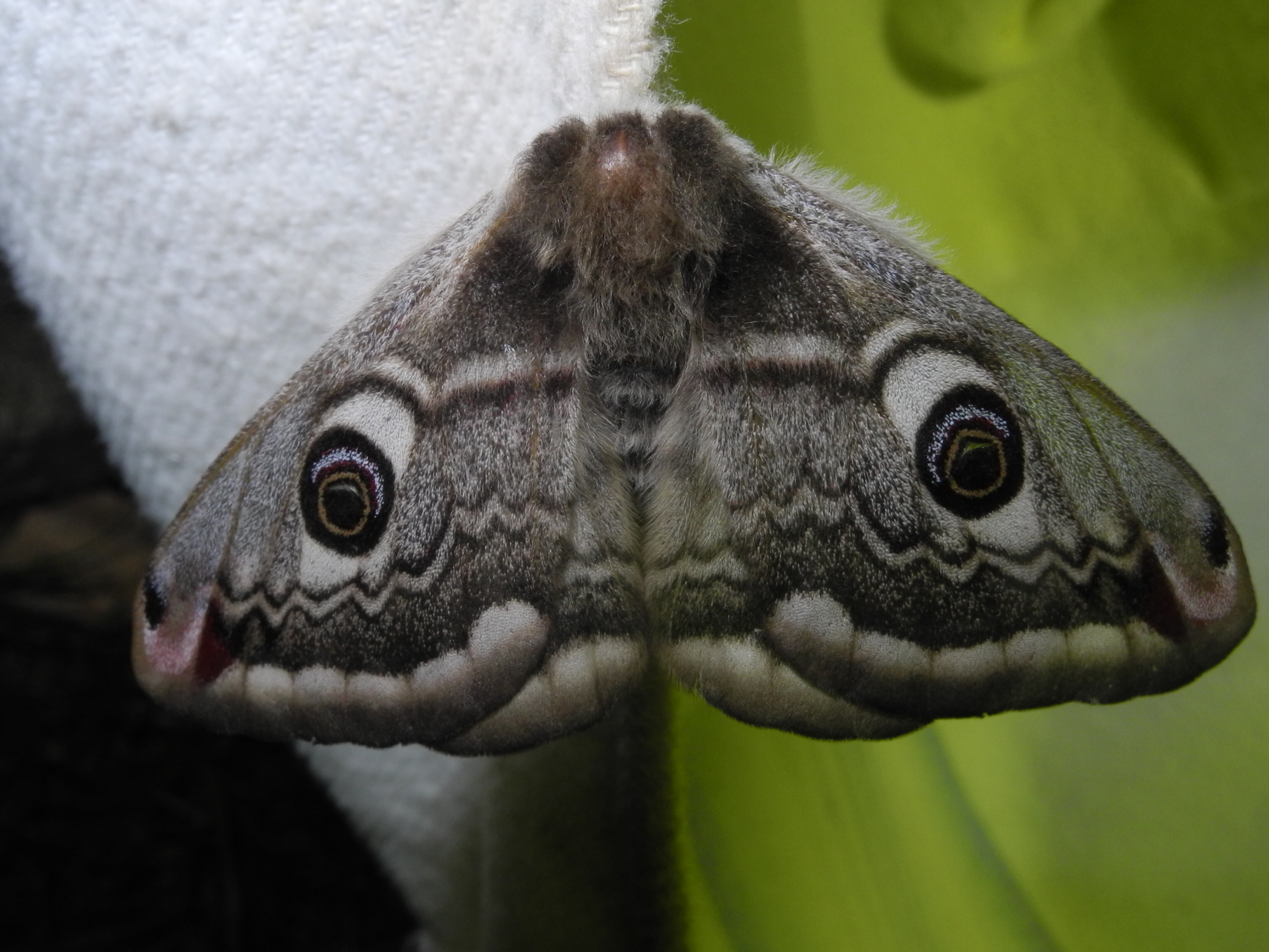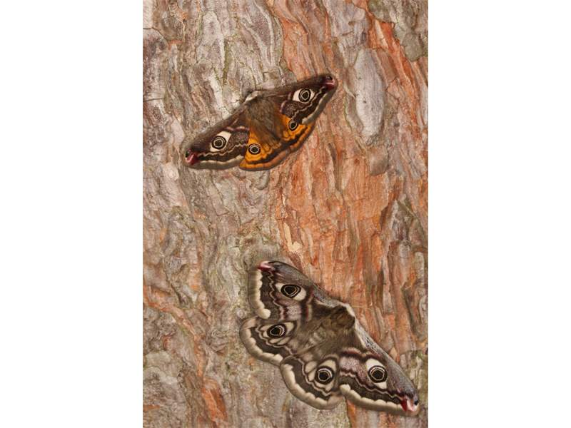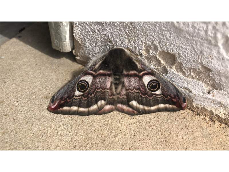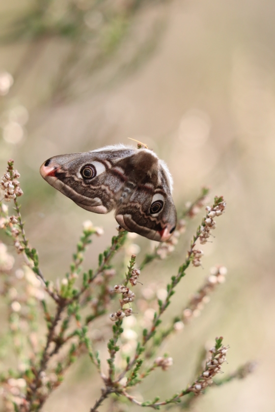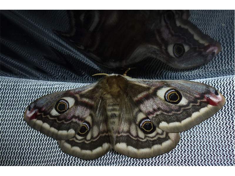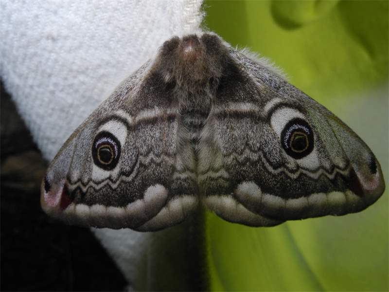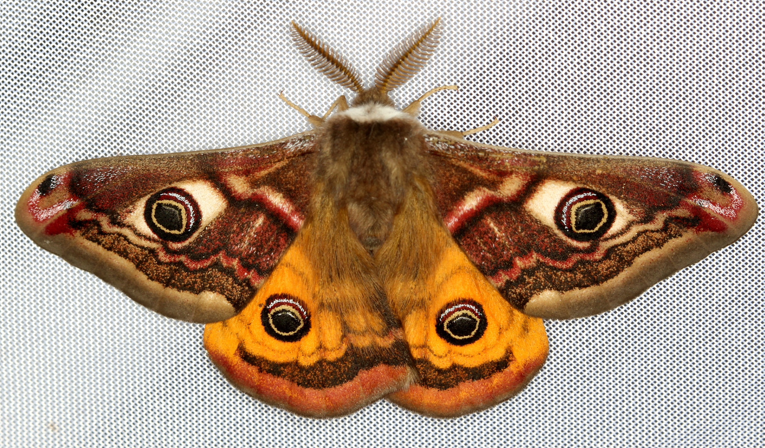 Kleines Nachtpfauenauge (Saturnia pavonia (Linnaeus, 1758)), Tagfund eines Weibchen mit nachfolgender Kopula in Hoyerswerda Klein Neida am 01.Mai 2019. Das Weibchen zufällig entdeckt saß 8 Stunden bis ein Männchen anflog, Kopula über 2,5 Stunden, dann entschwand nach kurzem Nebeneinander das Männchen wieder, das Weibchen folgte etwa eine Stunde später und flog in die Dämmerung.