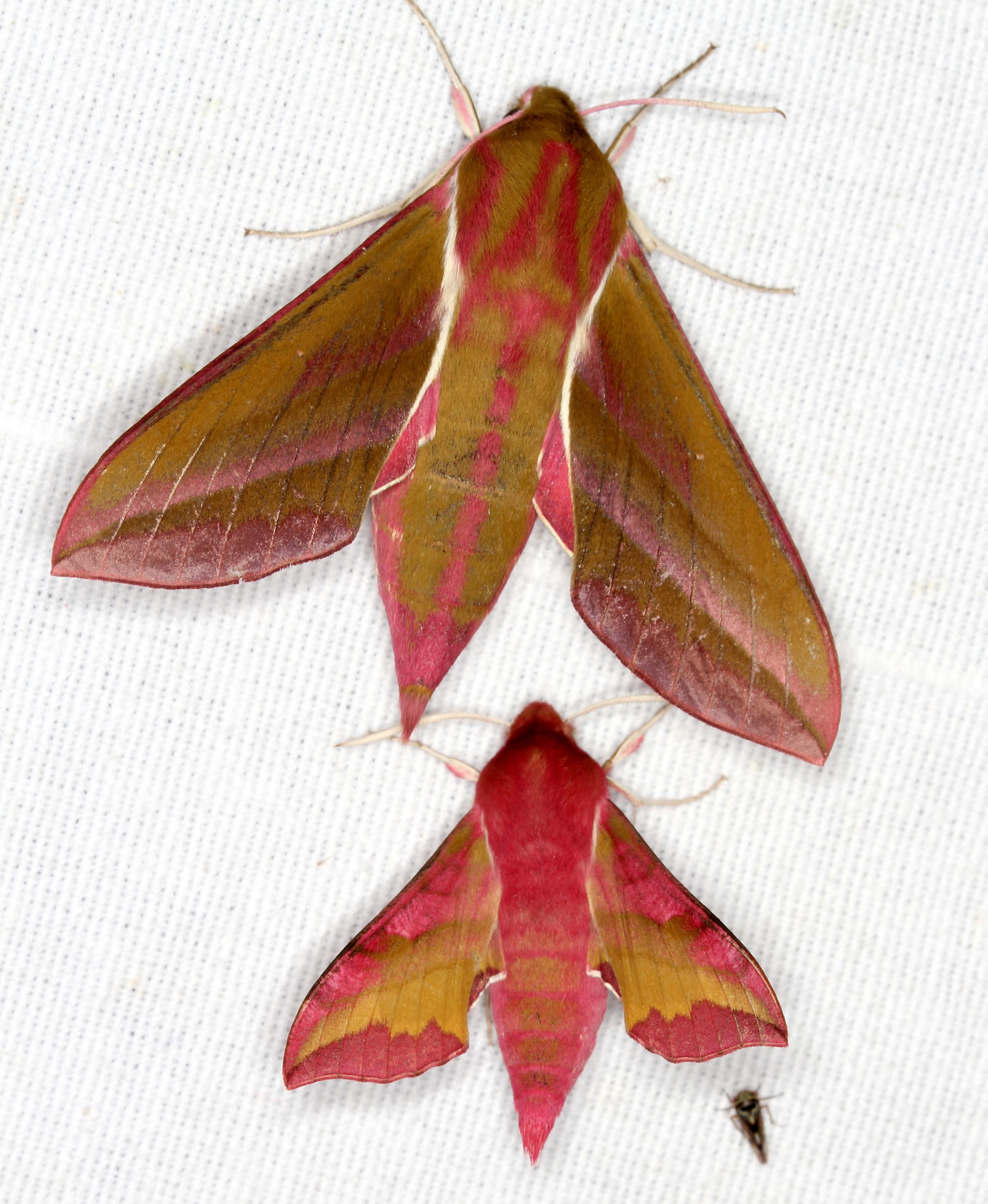 Größenvergleich D. elpenor (Mittlerer Weinschwärmer, oben) und D. porcellus (Kleiner Weinschwärmer), am Licht - Westlausitz, Pulsnitz, Kahlschlag/Bachtal Hahneflüsschen, 5. Juni 2022
