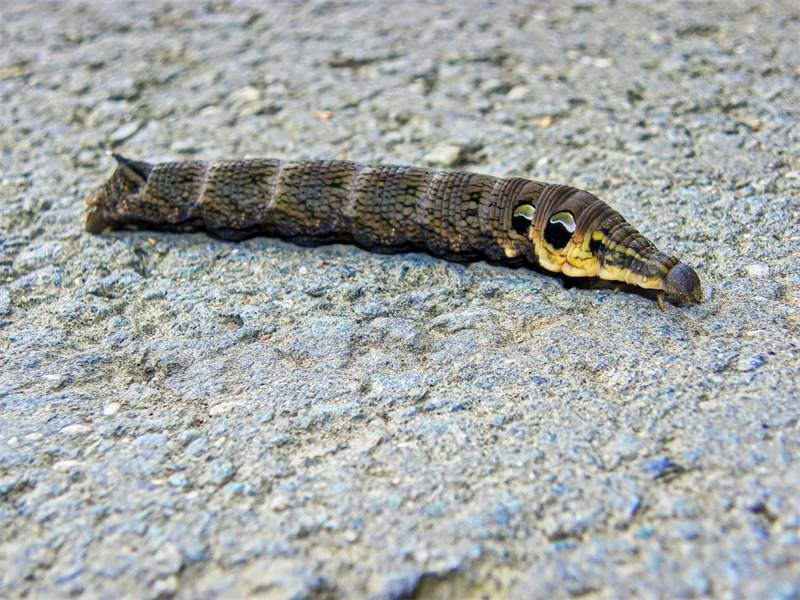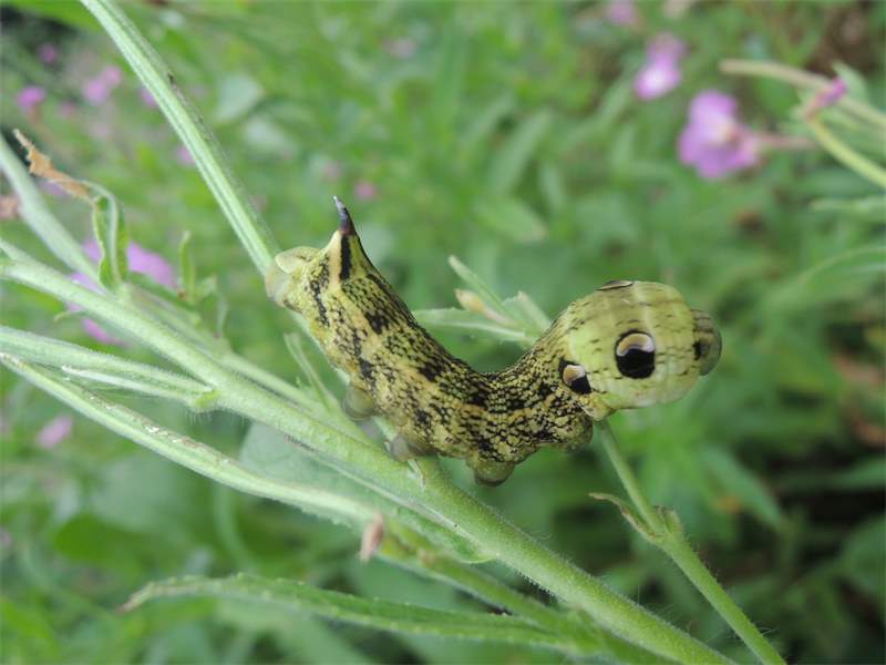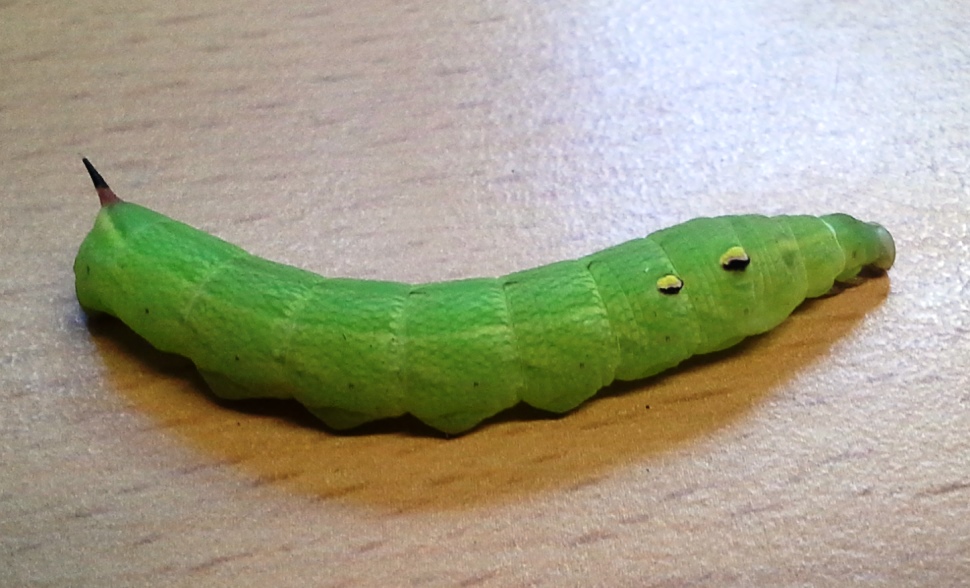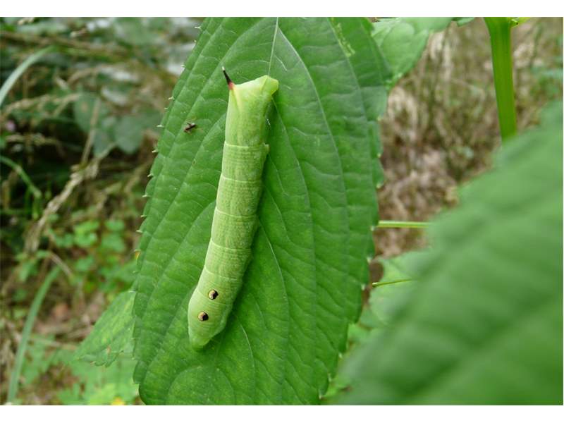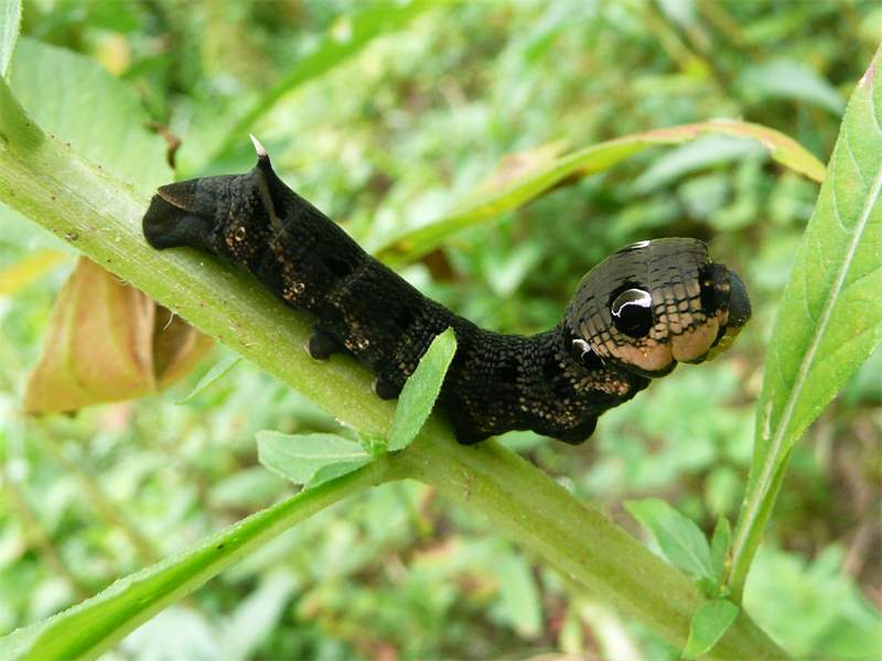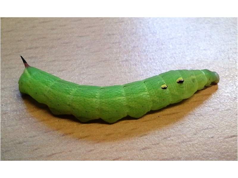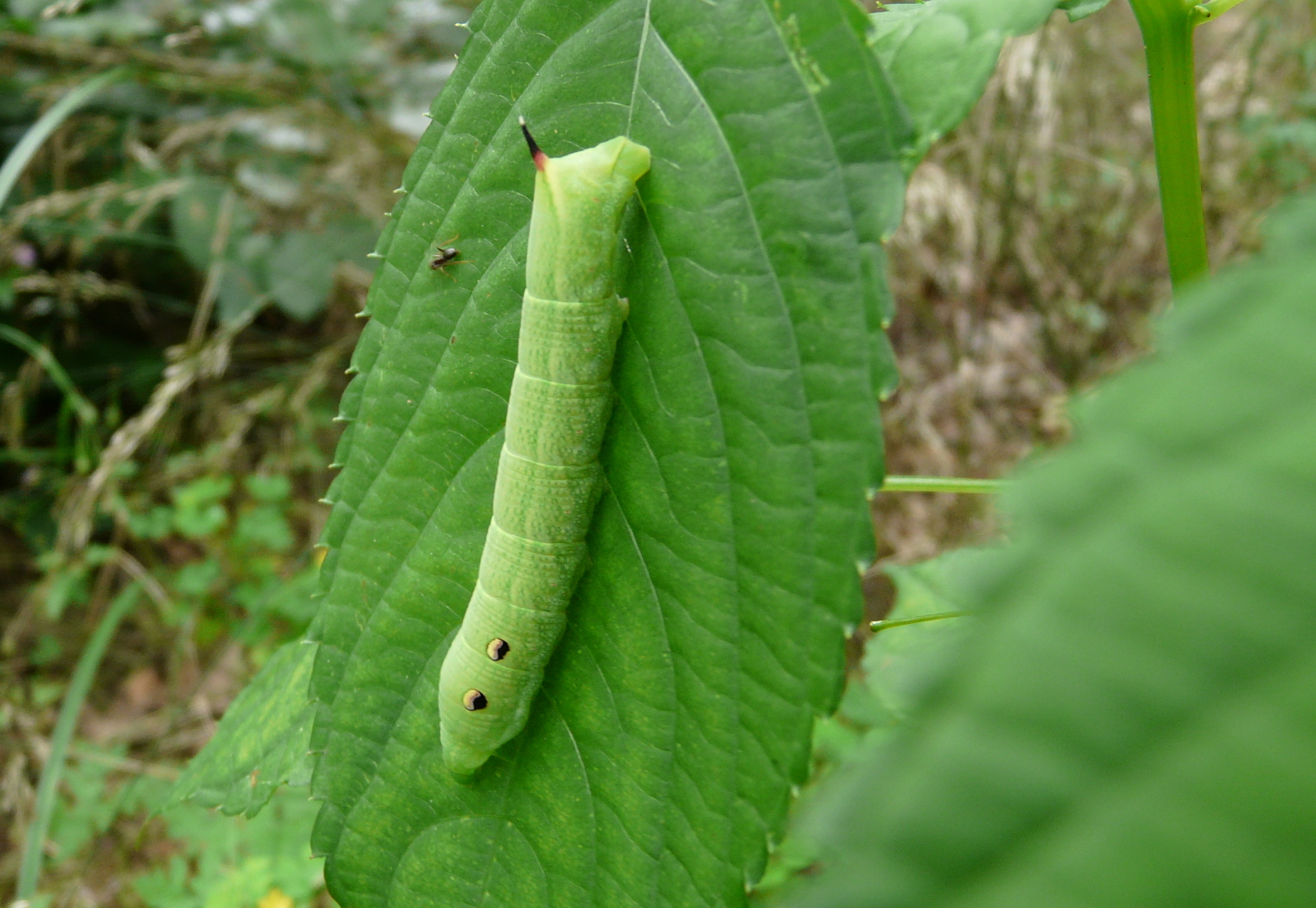 Raupe des Mittleren Weinschwärmers. Uferbereich der Weißen Elster, Weischlitz, August 2012.