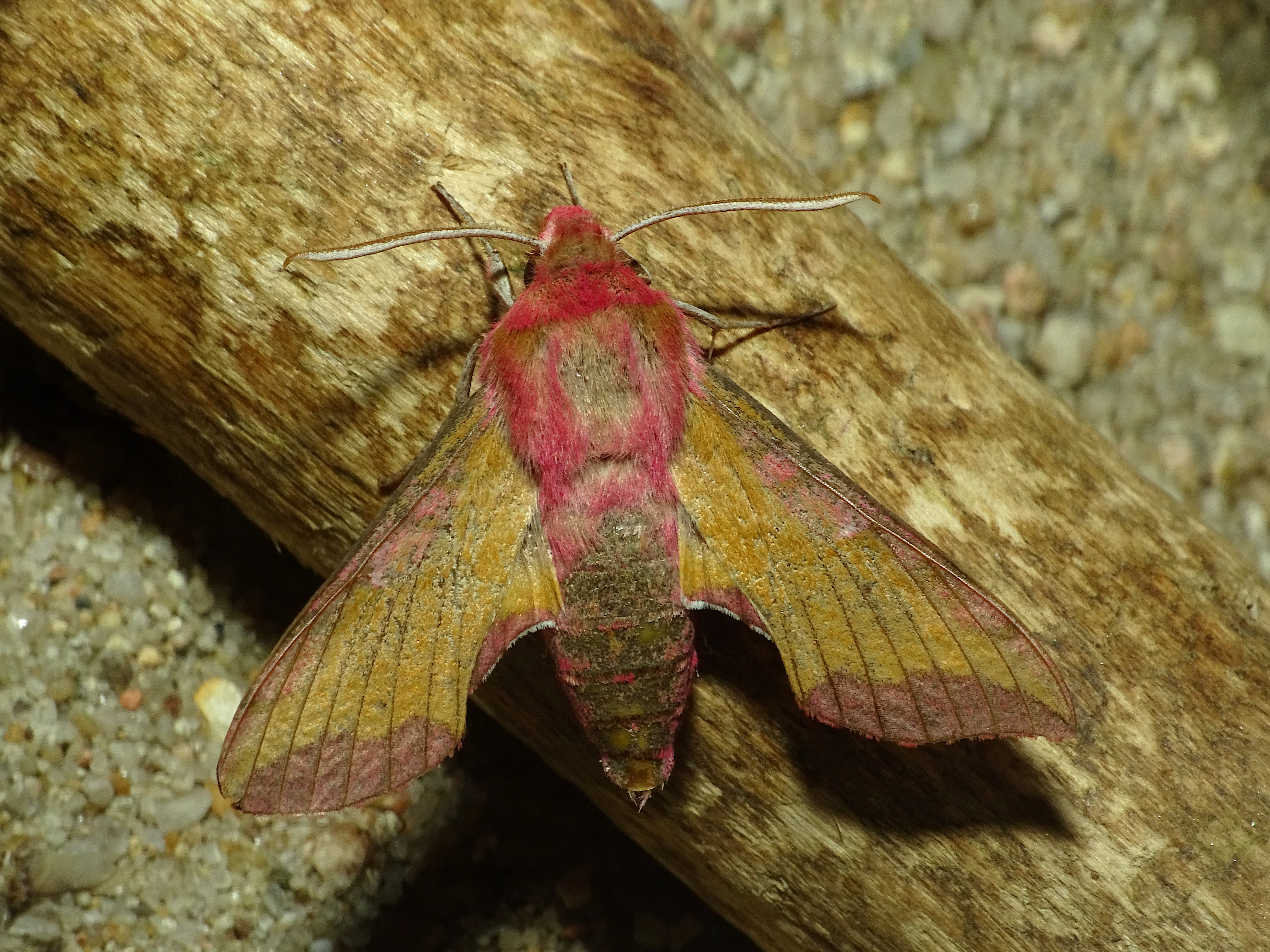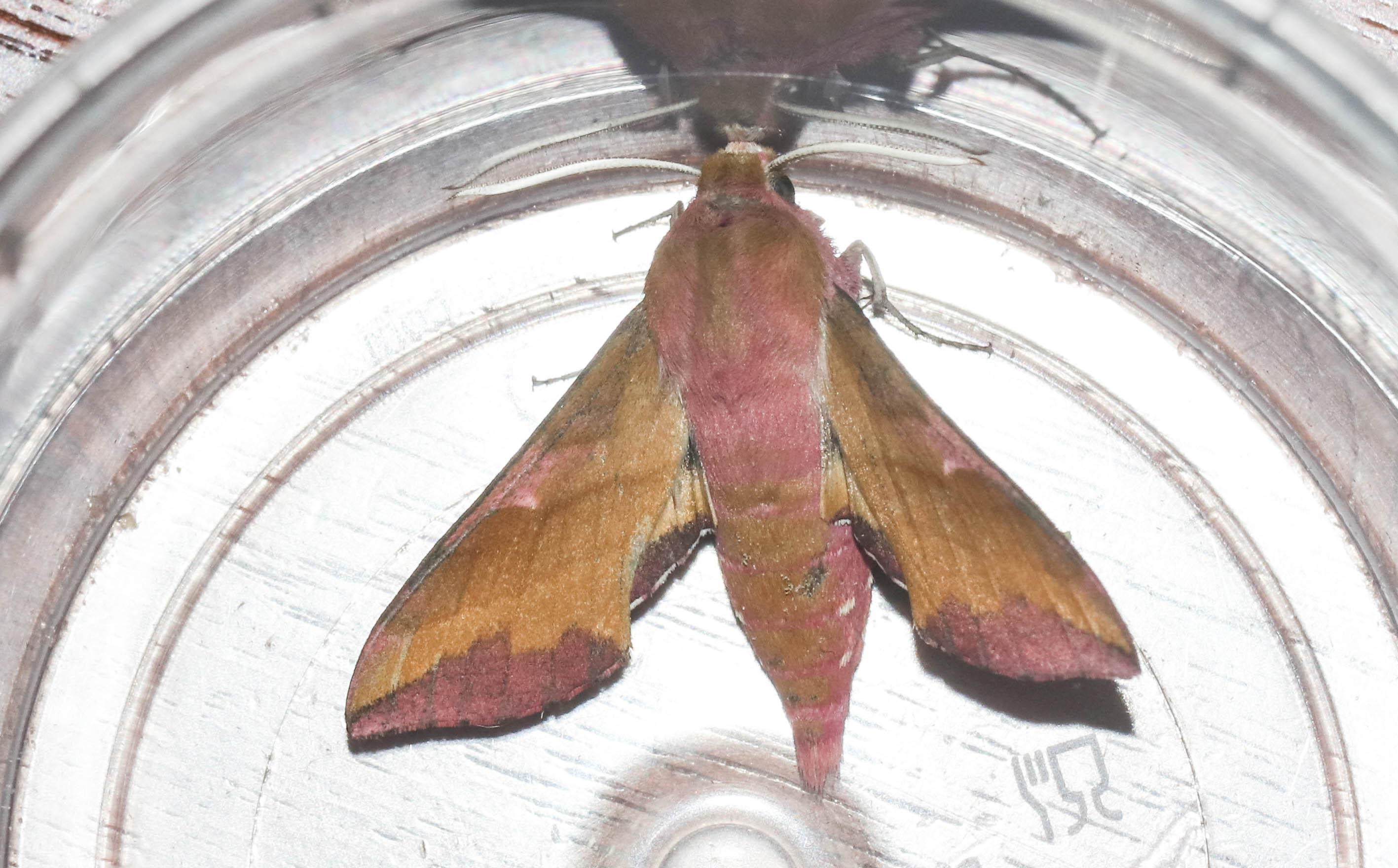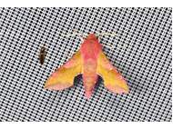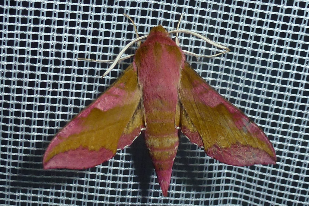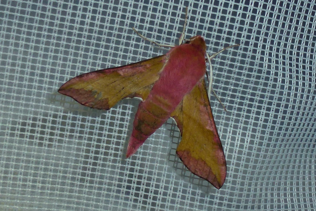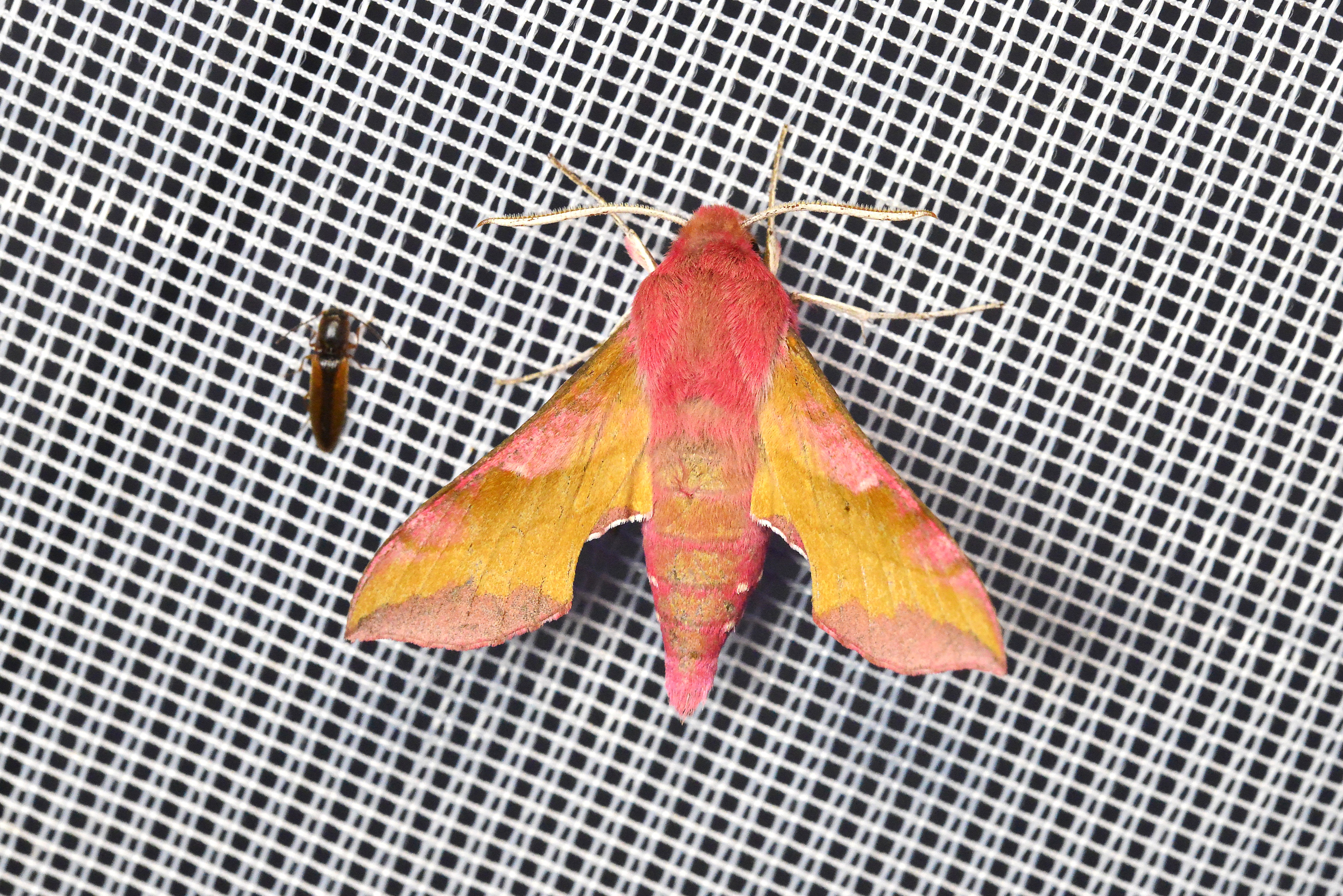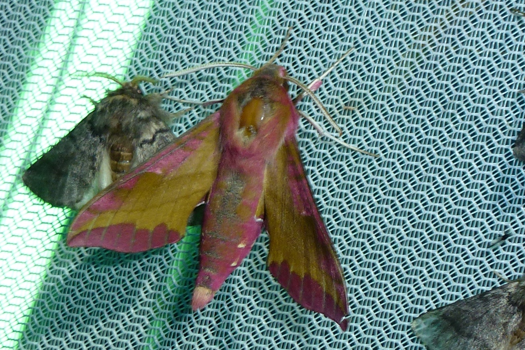 Größenvergleich: D. porcellus (Kleiner Weinschwärmer, unten) und D. elpenor (Mittlerer Weinschwärmer), am Licht - Westlausitz, Pulsnitz, Kahlschlag/Bachtal Hahneflüsschen, 5. Juni 2022