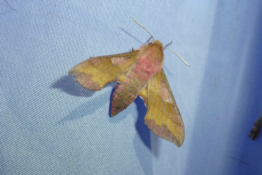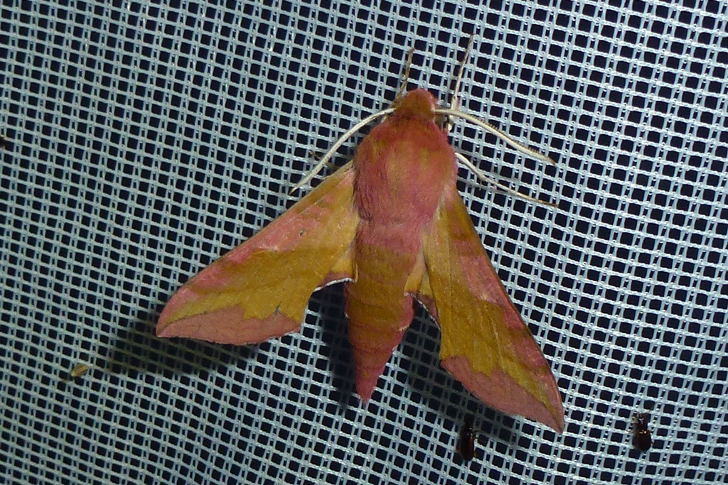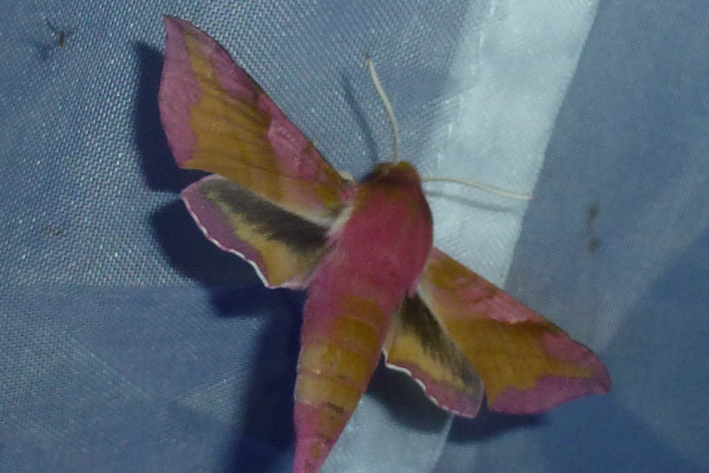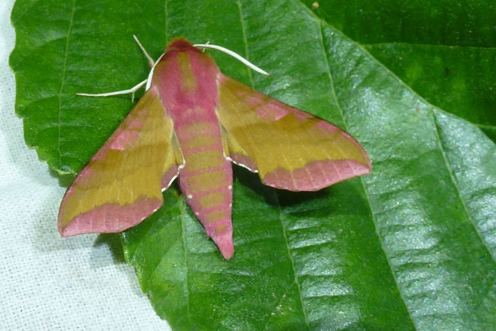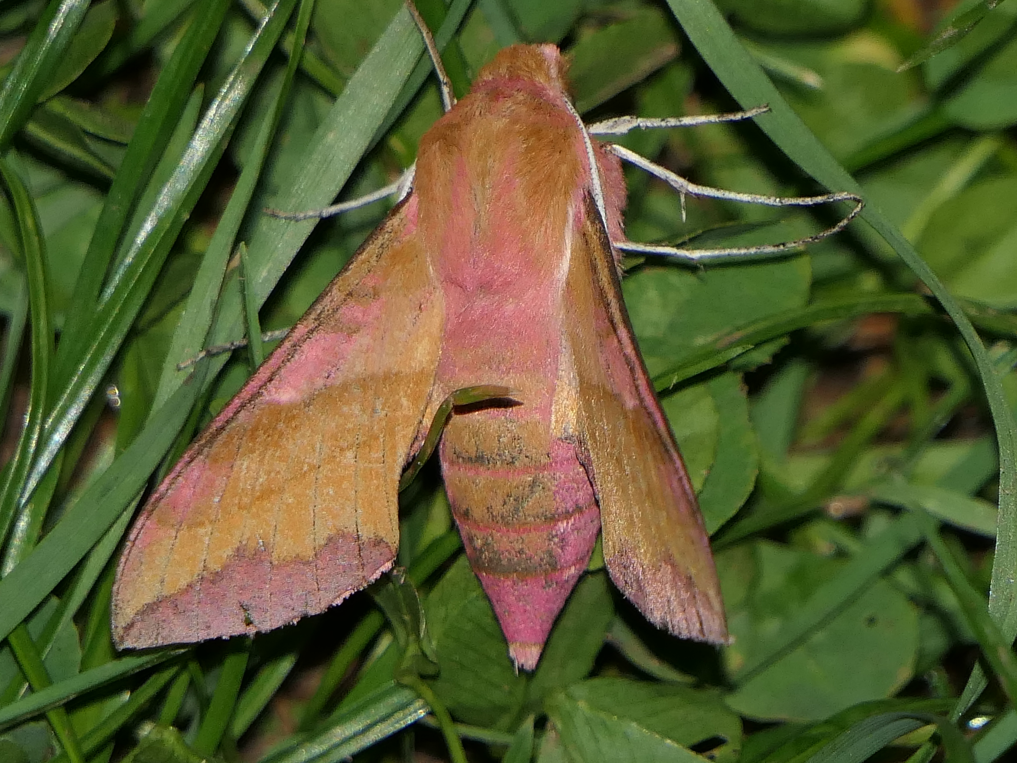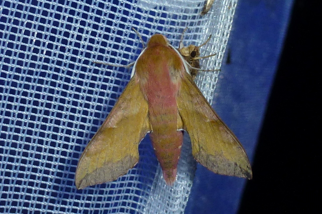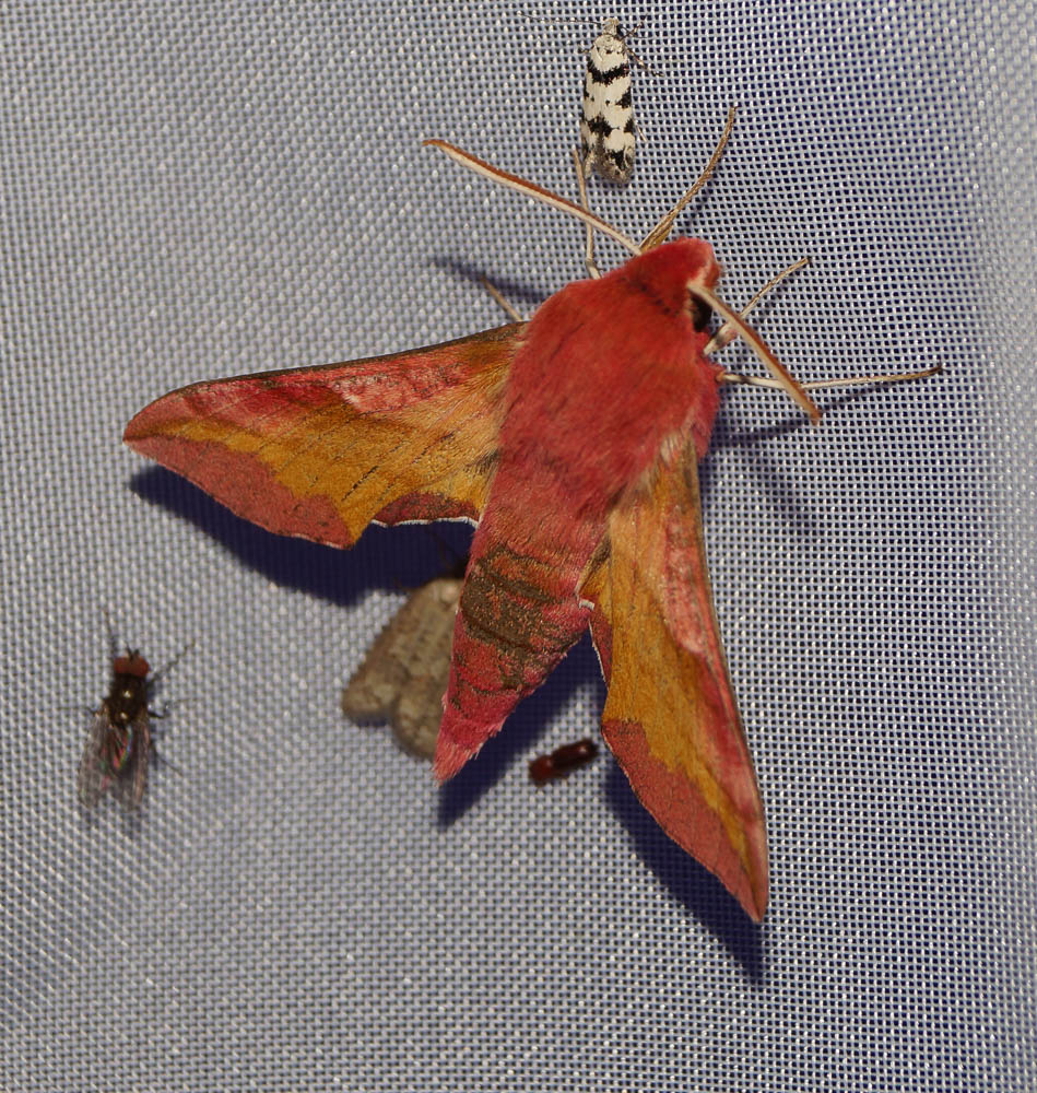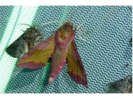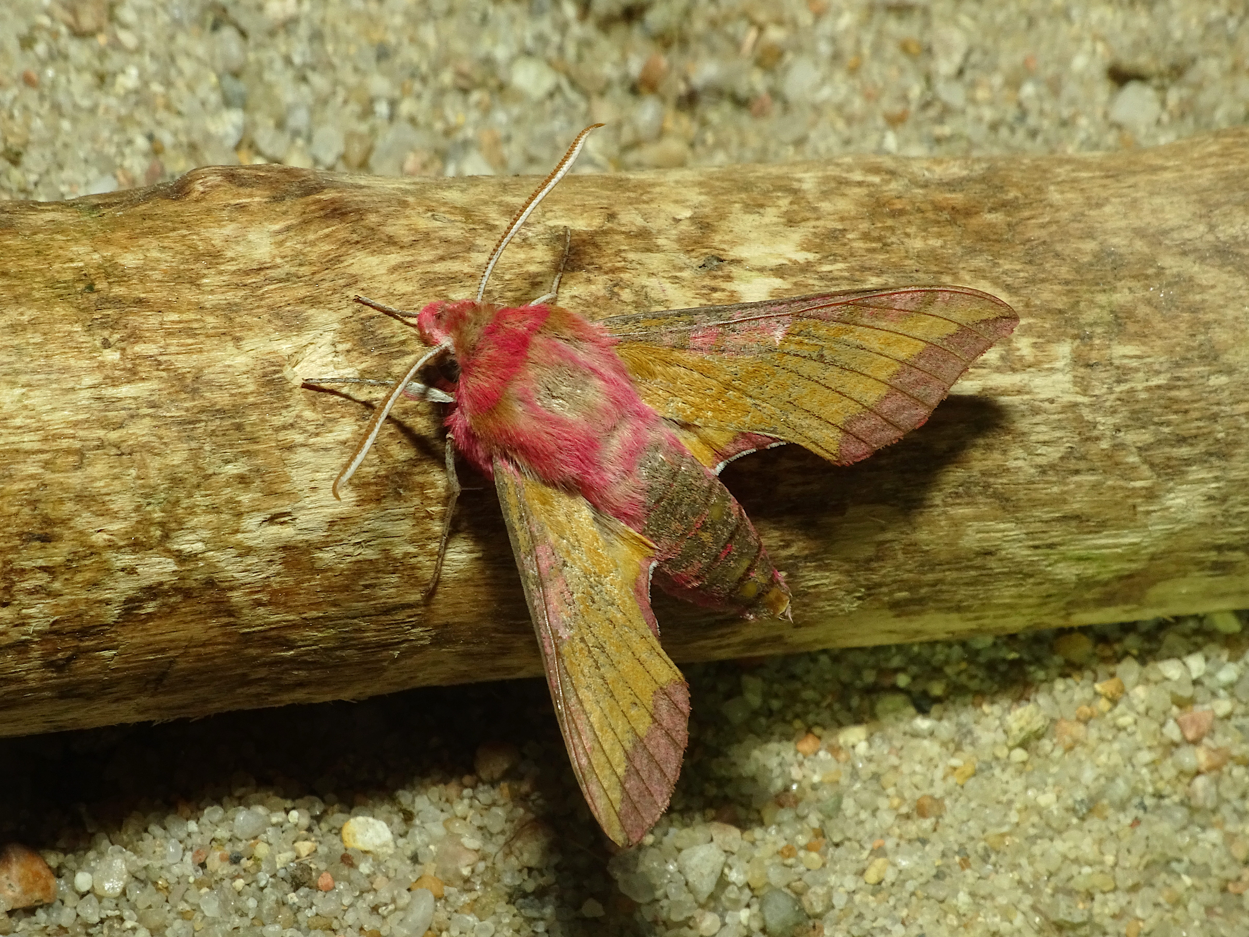 Größenvergleich: D. porcellus (Kleiner Weinschwärmer, unten) und D. elpenor (Mittlerer Weinschwärmer), am Licht - Westlausitz, Pulsnitz, Kahlschlag/Bachtal Hahneflüsschen, 5. Juni 2022